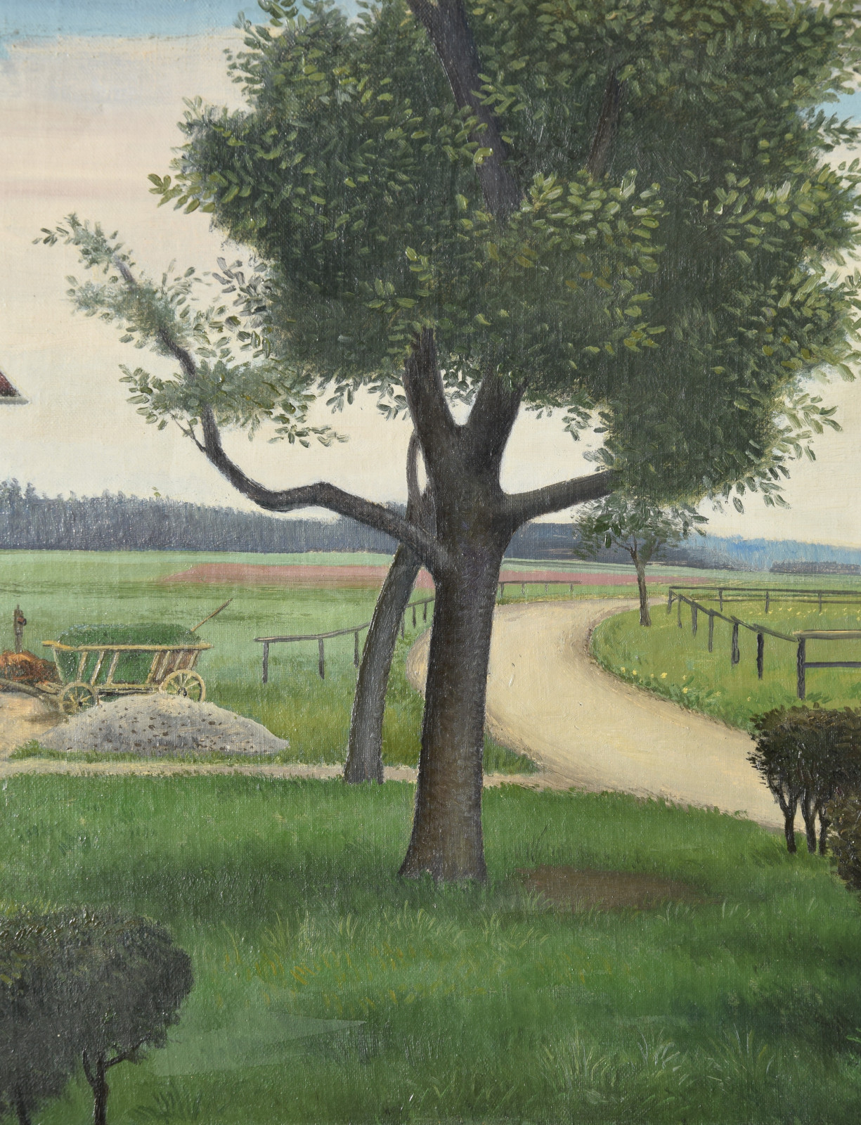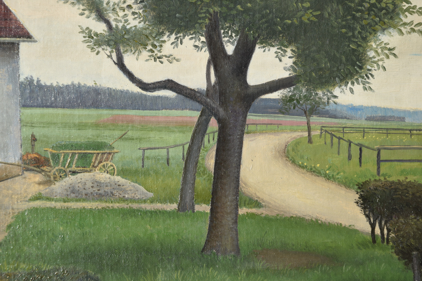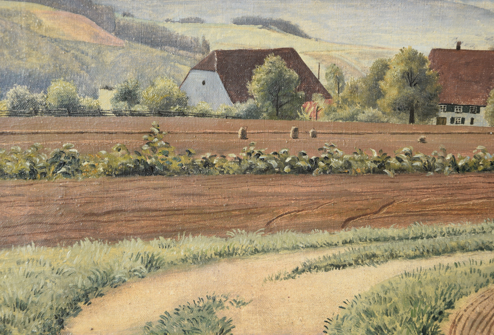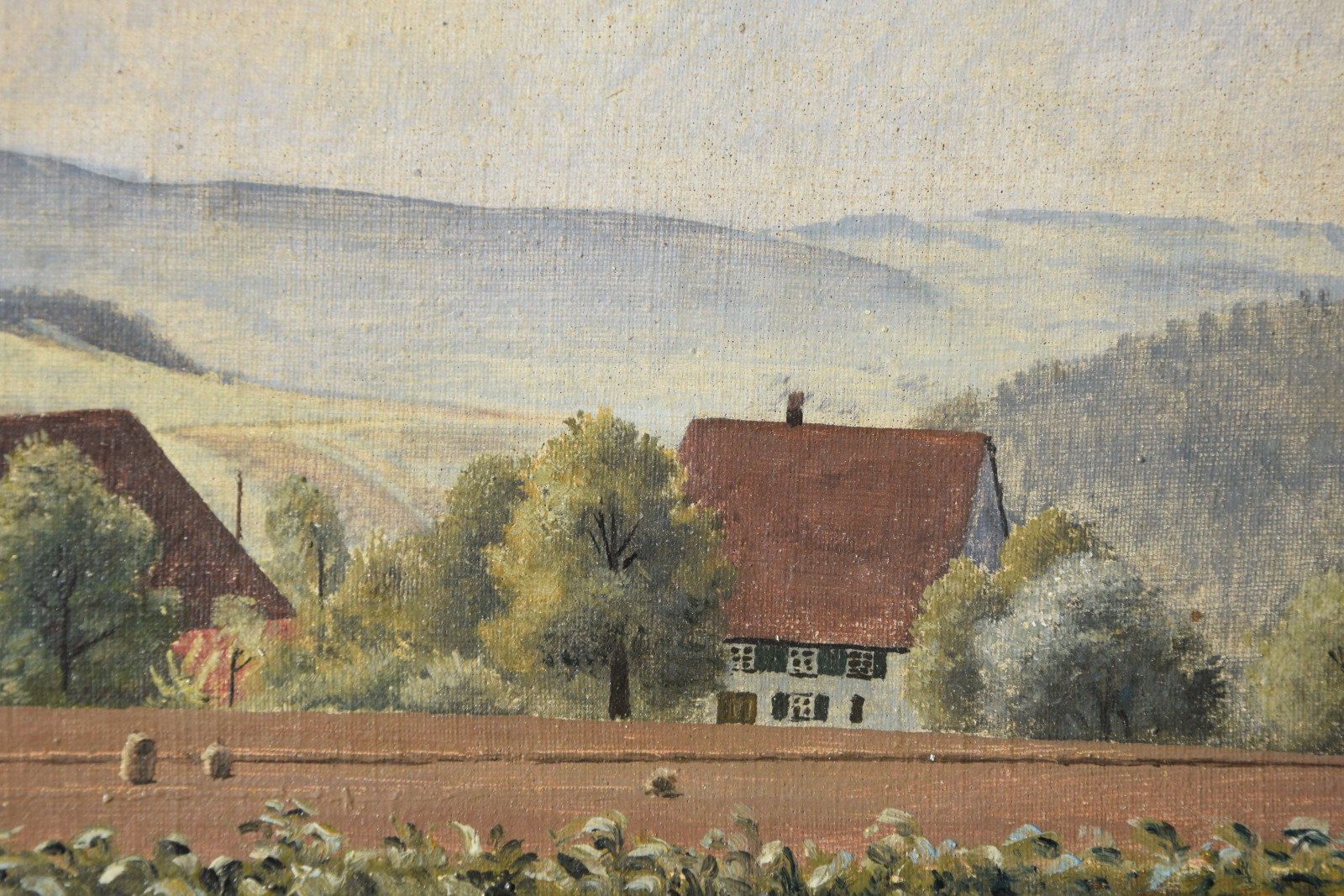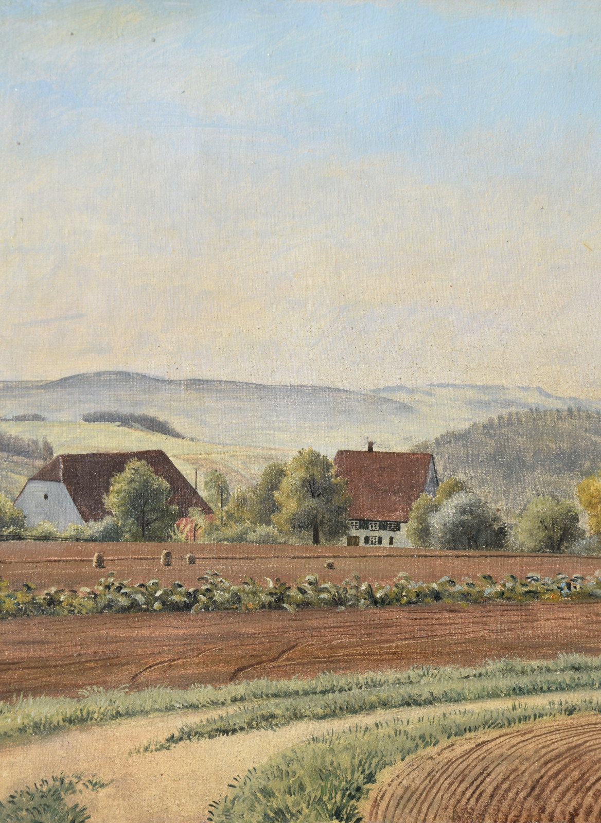 Vom Künstler wurde der weite Blick über die Felder, Ackerflächen hin zu den Gebäuden und dem Wald als Vorderseite gewählt, wodurch sich auch erklärt, dass nur diese Seite signiert und datiert (1928) ist. Demnach war die damalige Rückseite an den Rändern durch den früheren Keilrahmen verdeckt. Um nun beide Seiten sichtbar und hängbar zu machen, wurde der (noch vorhandene) Keilrahmen abgenommen und die Leinwand so gespannt, dass man bei der Hängung stets wählen kann.