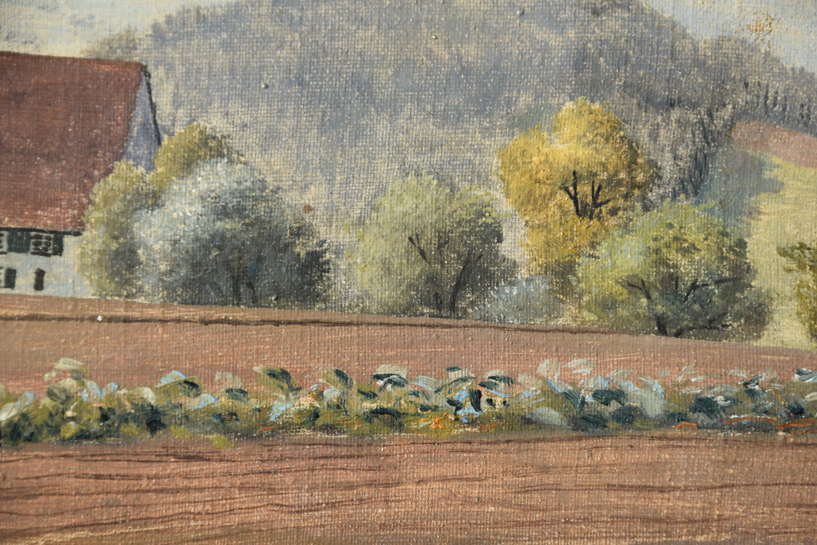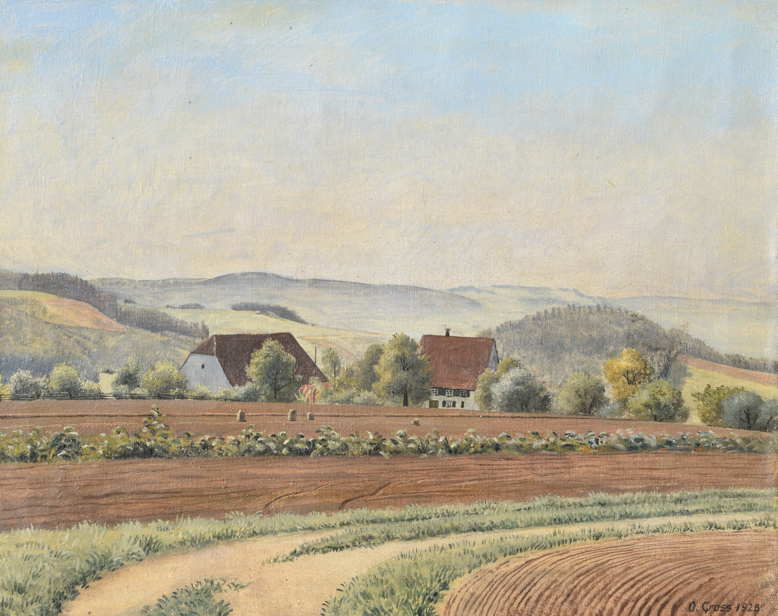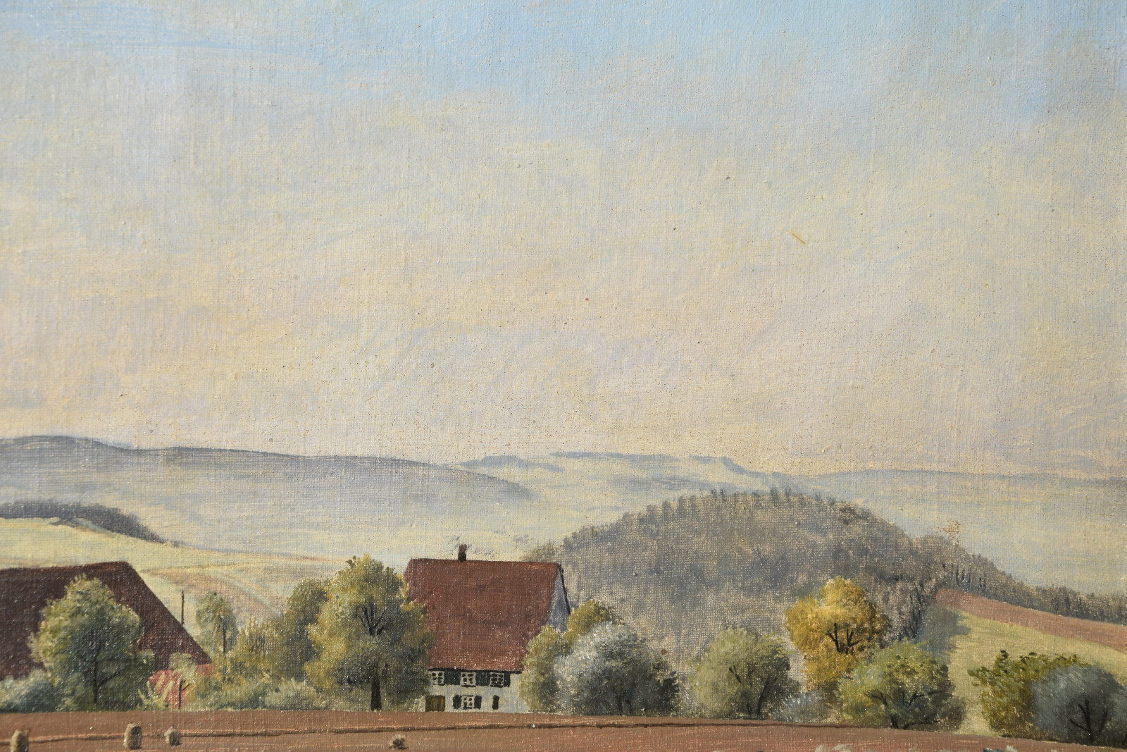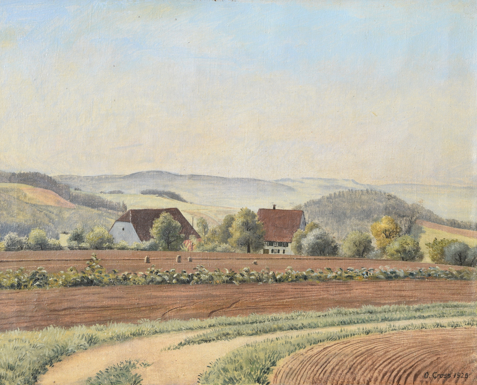 Vom Künstler wurde der weite Blick über die Felder, Ackerflächen hin zu den Gebäuden und dem Wald als Vorderseite gewählt, wodurch sich auch erklärt, dass nur diese Seite signiert und datiert (1928) ist. Demnach war die damalige Rückseite an den Rändern durch den früheren Keilrahmen verdeckt. Um nun beide Seiten sichtbar und hängbar zu machen, wurde der (noch vorhandene) Keilrahmen abgenommen und die Leinwand so gespannt, dass man bei der Hängung stets wählen kann.