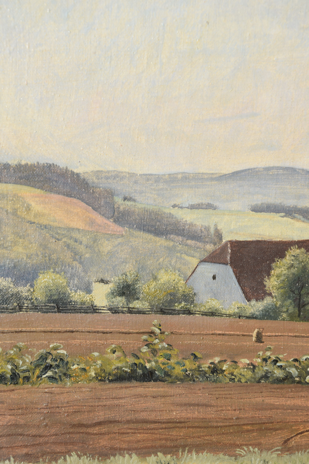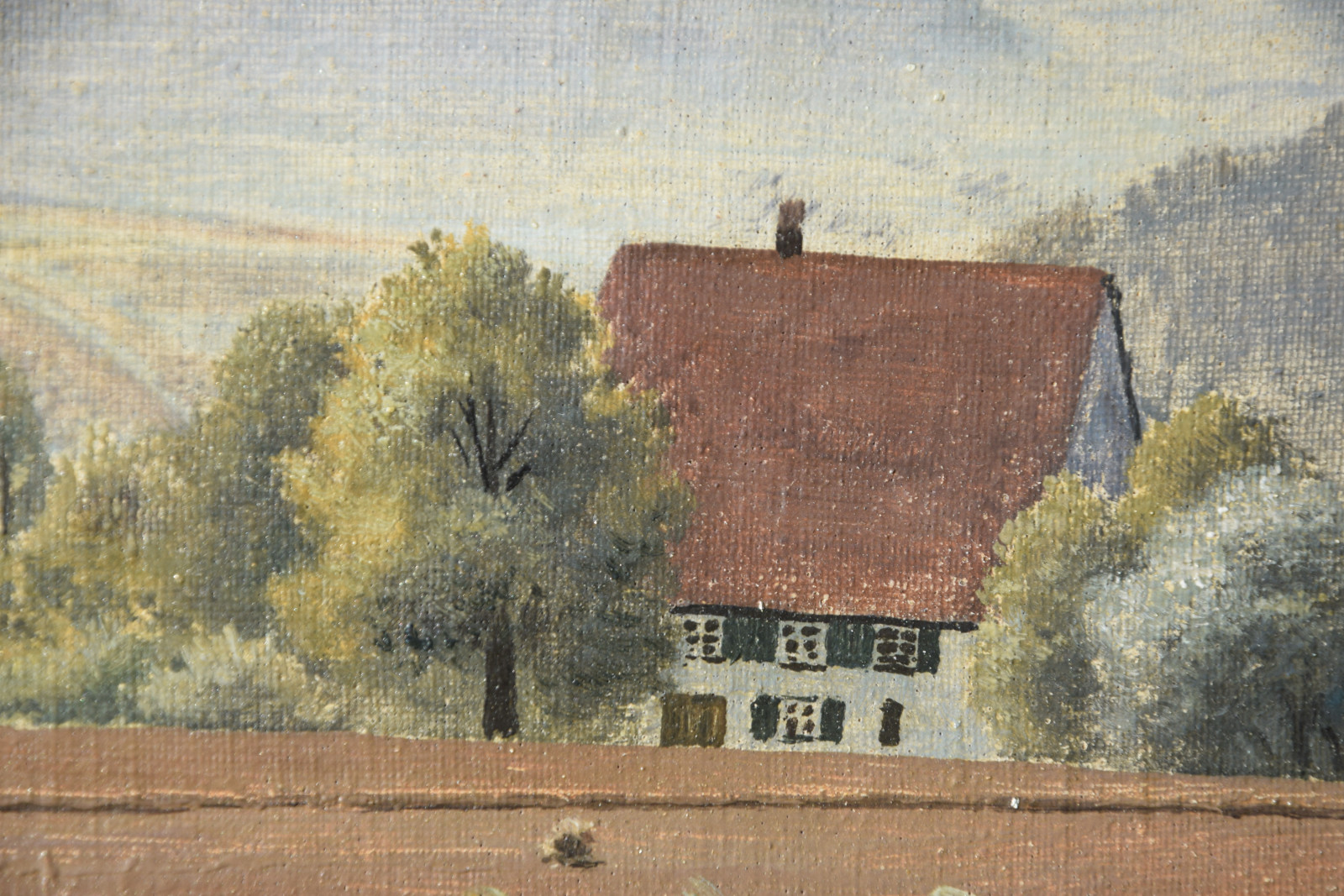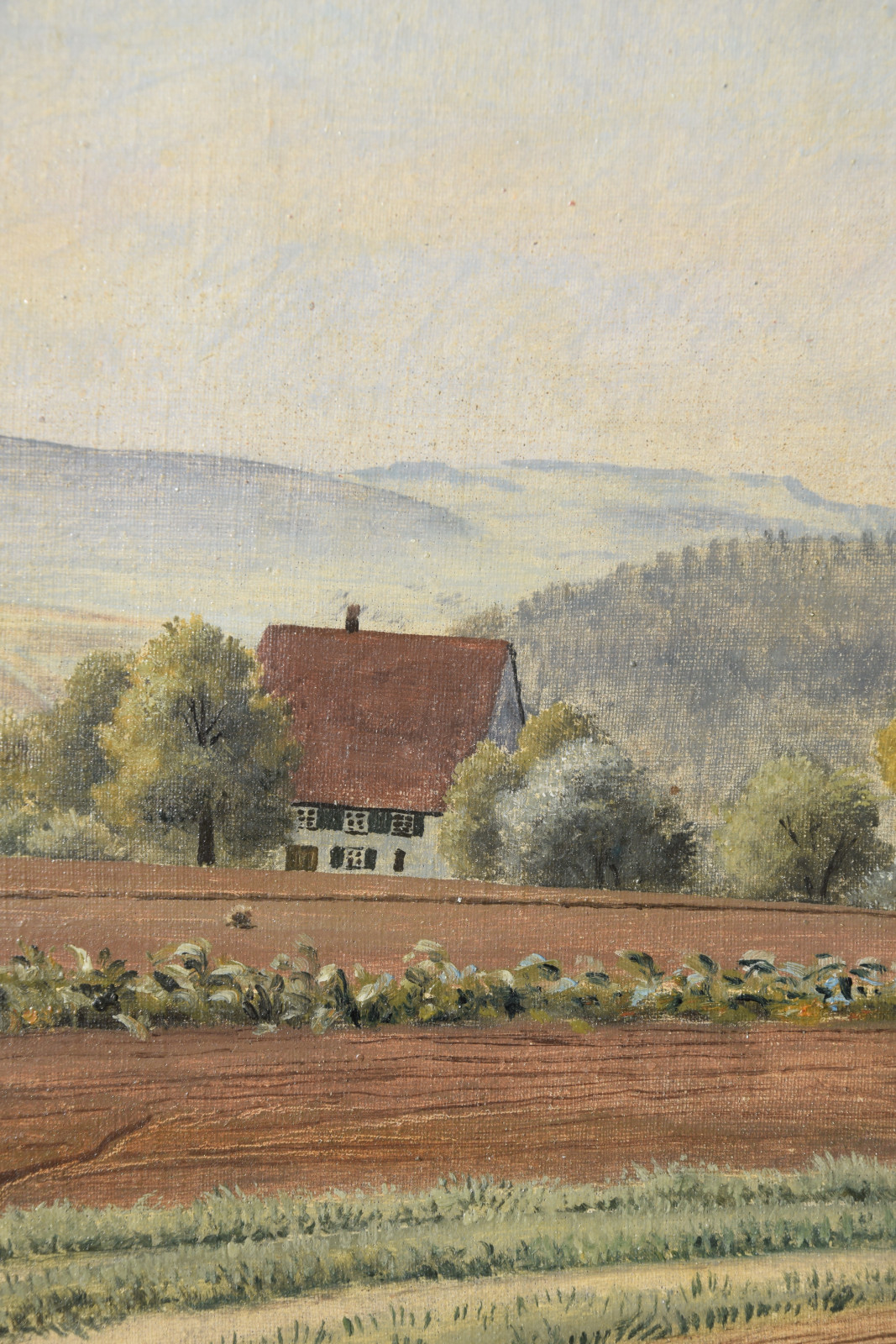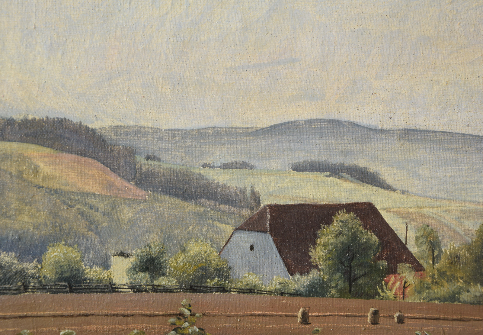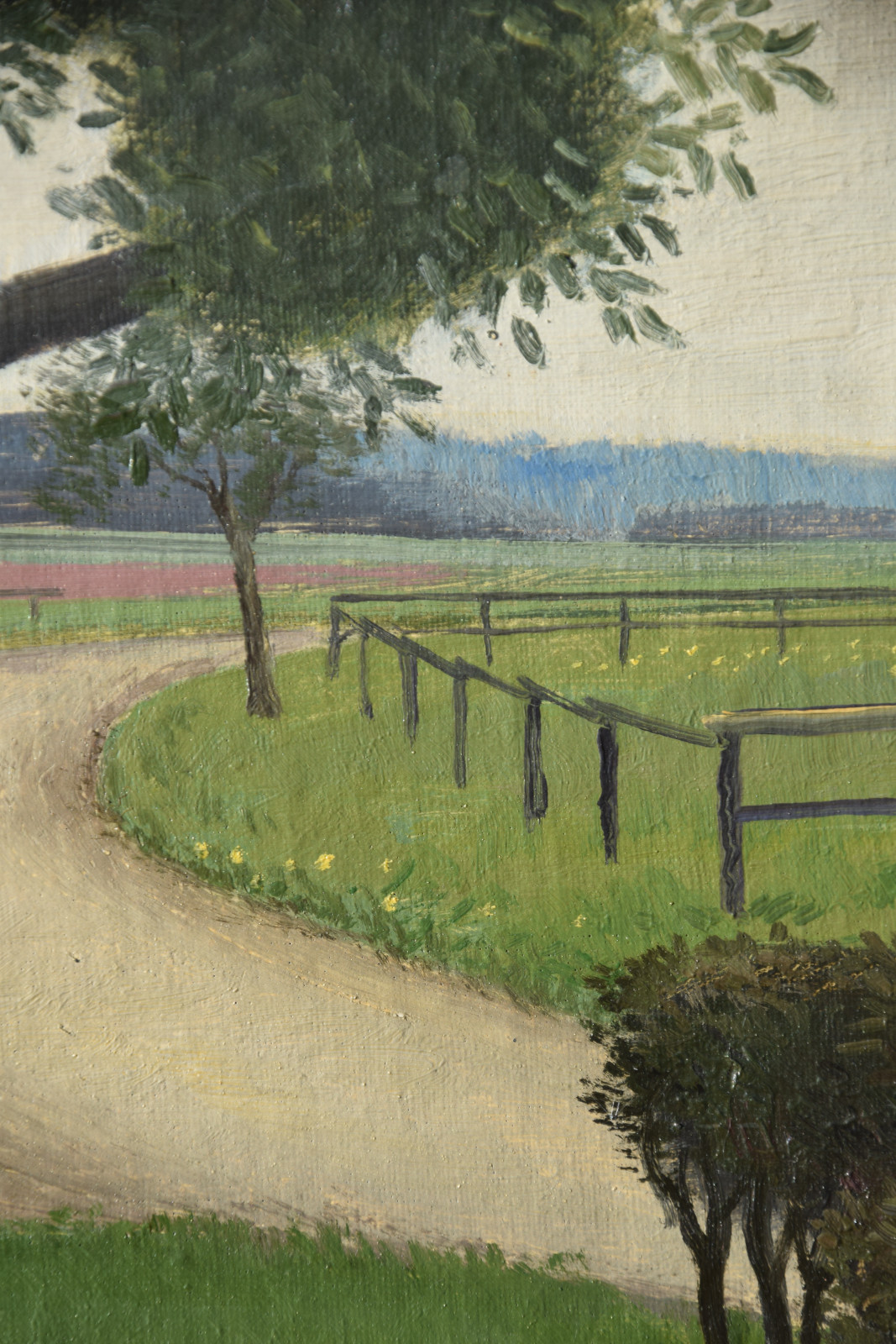 Vom Künstler wurde der weite Blick über die Felder, Ackerflächen hin zu den Gebäuden und dem Wald als Vorderseite gewählt, wodurch sich auch erklärt, dass nur diese Seite signiert und datiert (1928) ist. Demnach war die damalige Rückseite an den Rändern durch den früheren Keilrahmen verdeckt. Um nun beide Seiten sichtbar und hängbar zu machen, wurde der (noch vorhandene) Keilrahmen abgenommen und die Leinwand so gespannt, dass man bei der Hängung stets wählen kann.