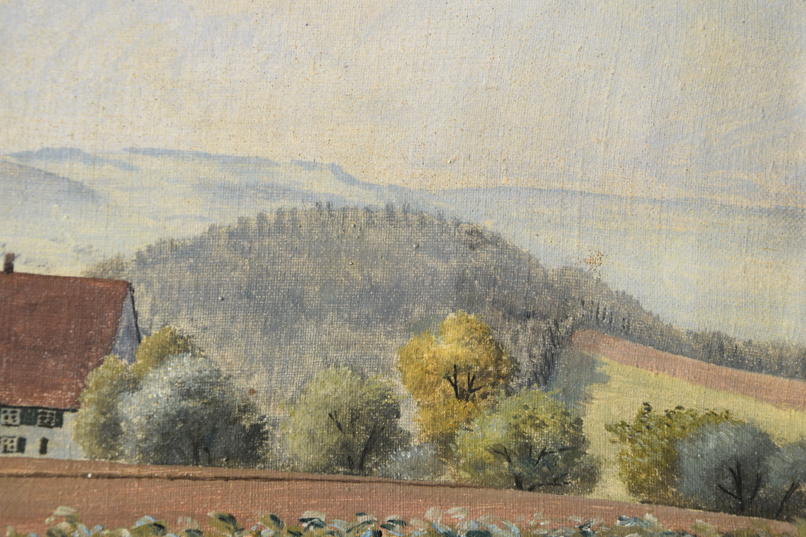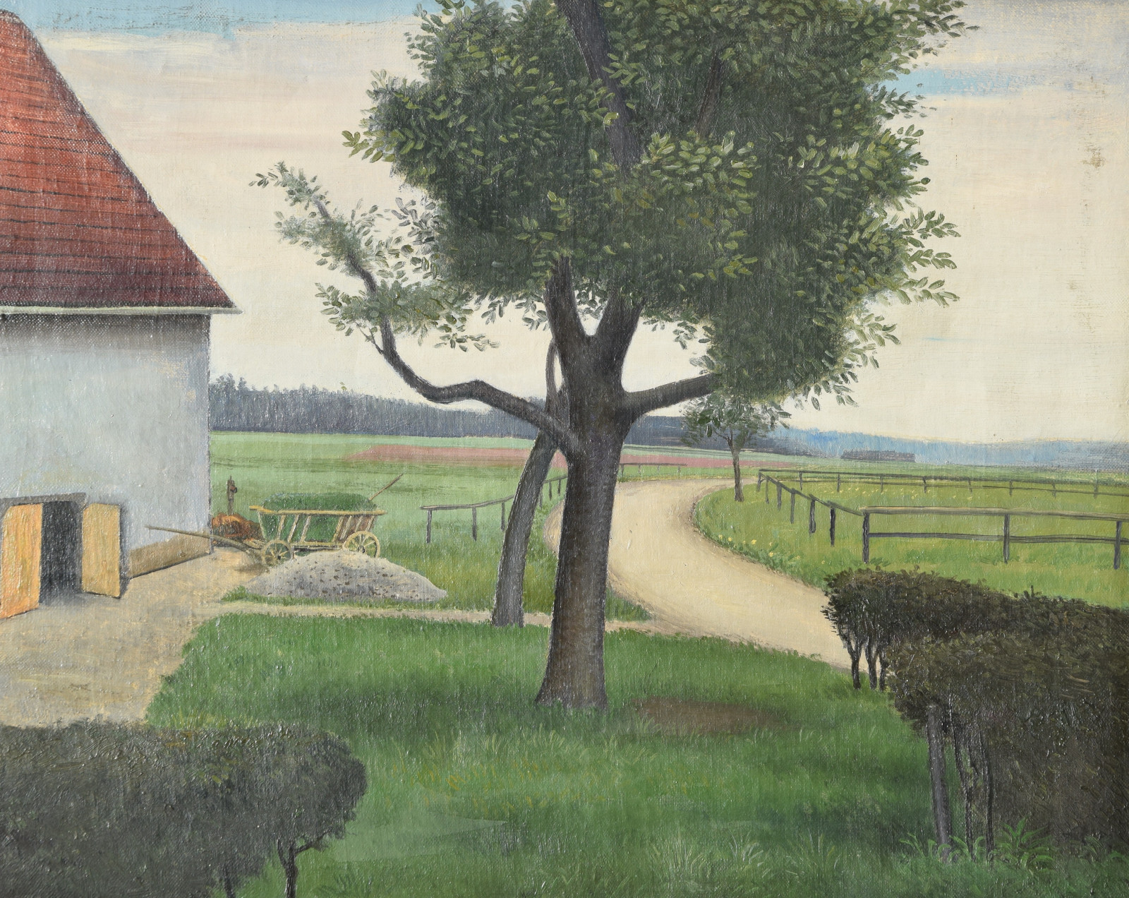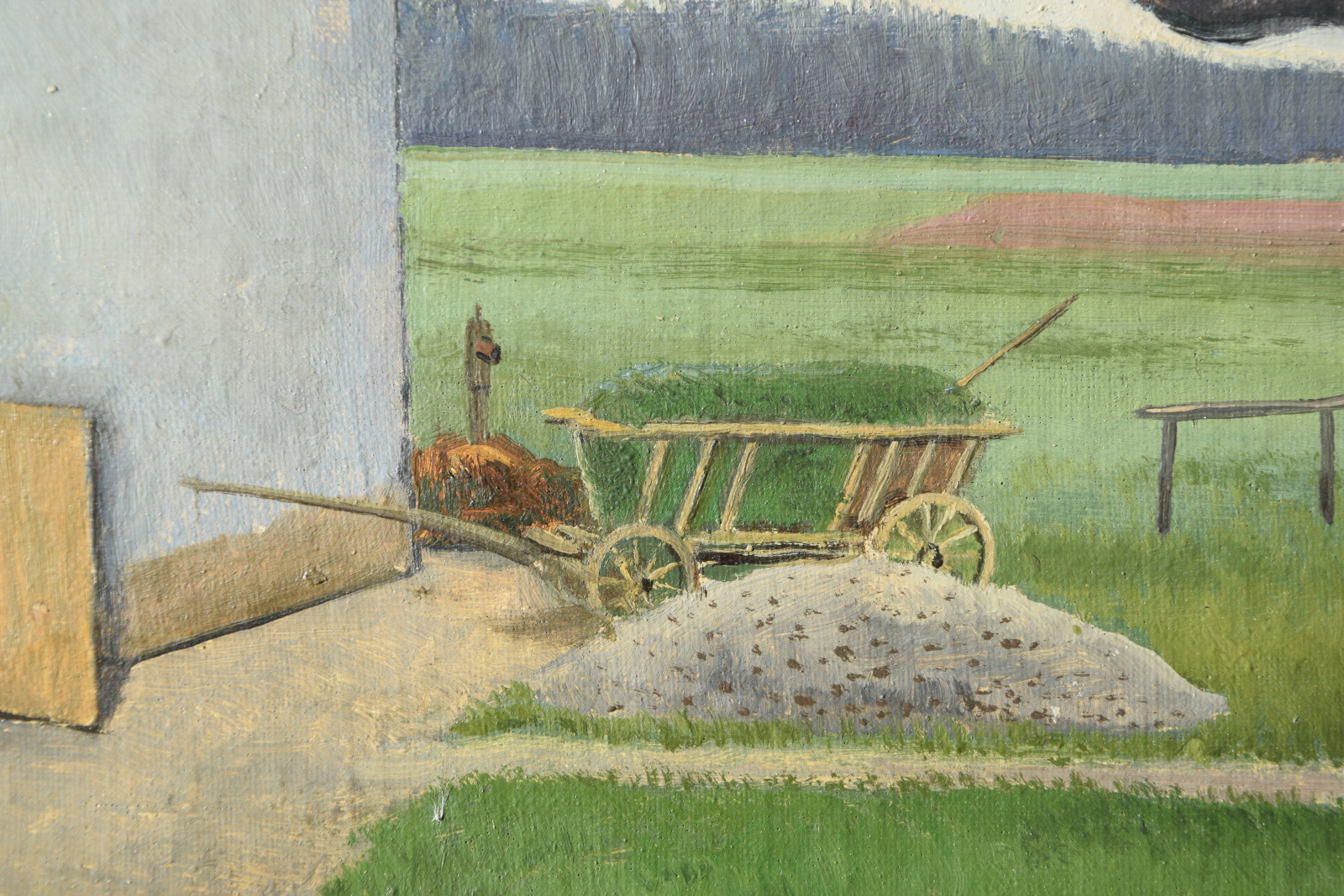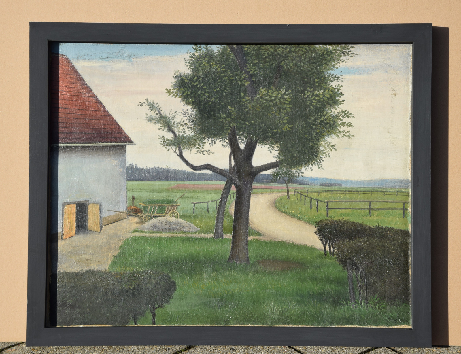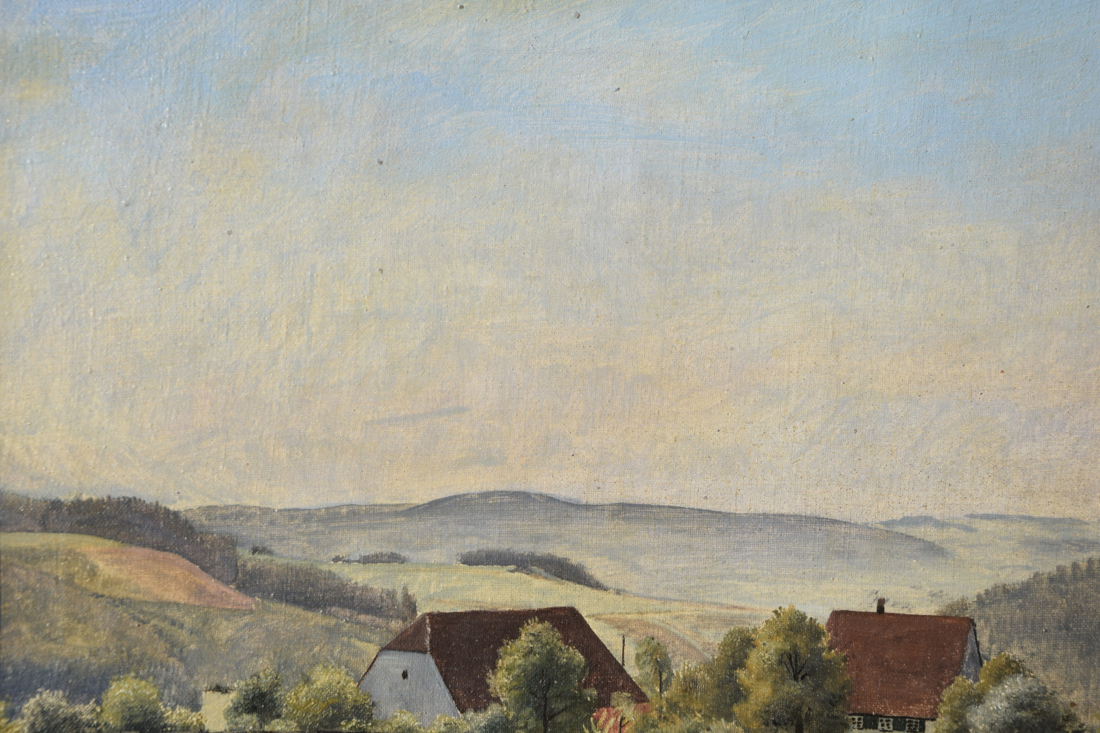 Vom Künstler wurde der weite Blick über die Felder, Ackerflächen hin zu den Gebäuden und dem Wald als Vorderseite gewählt, wodurch sich auch erklärt, dass nur diese Seite signiert und datiert (1928) ist. Demnach war die damalige Rückseite an den Rändern durch den früheren Keilrahmen verdeckt. Um nun beide Seiten sichtbar und hängbar zu machen, wurde der (noch vorhandene) Keilrahmen abgenommen und die Leinwand so gespannt, dass man bei der Hängung stets wählen kann.