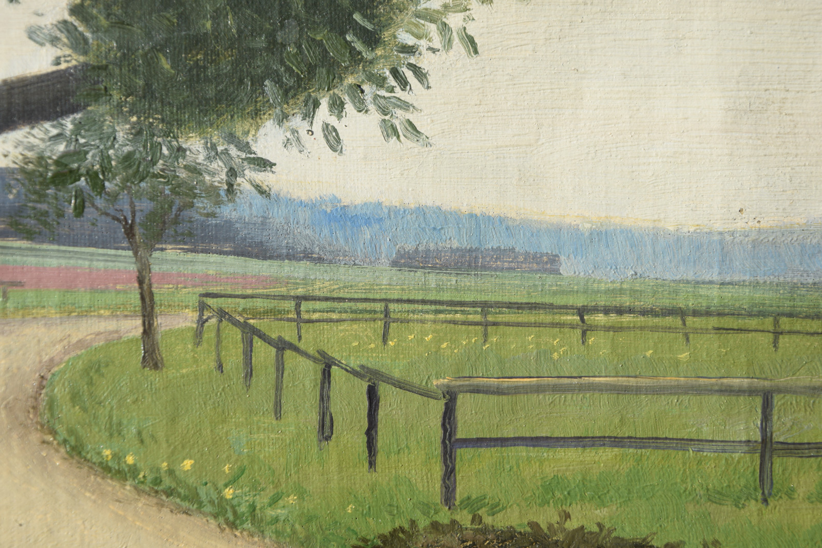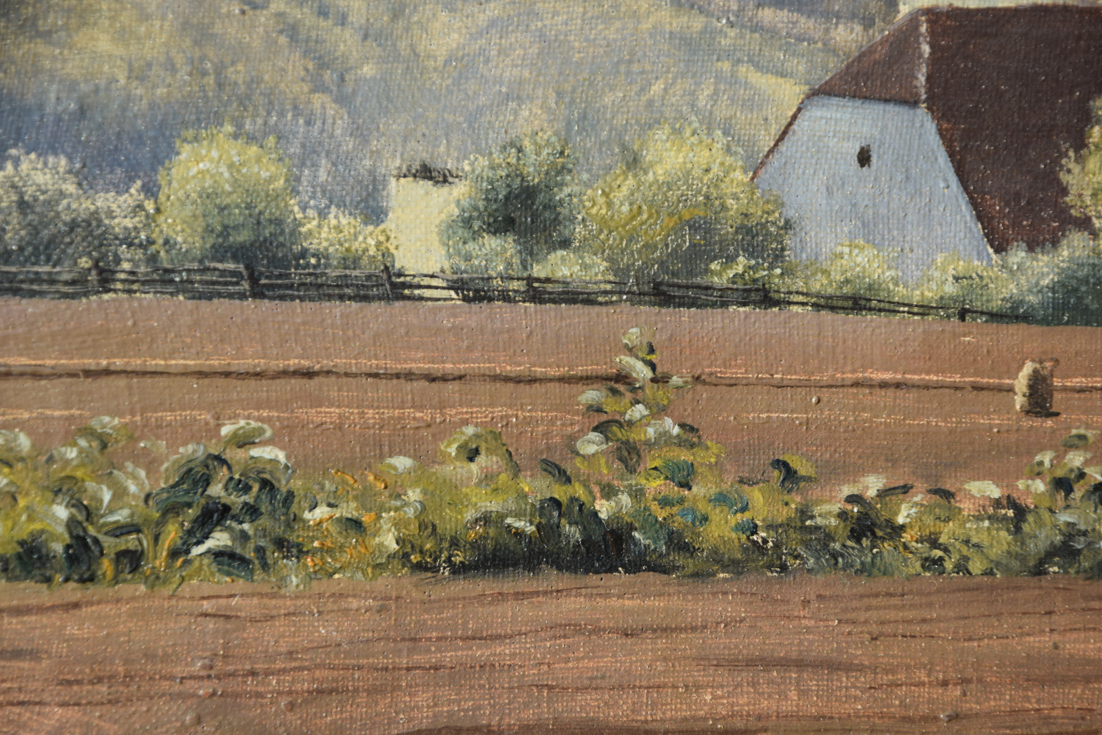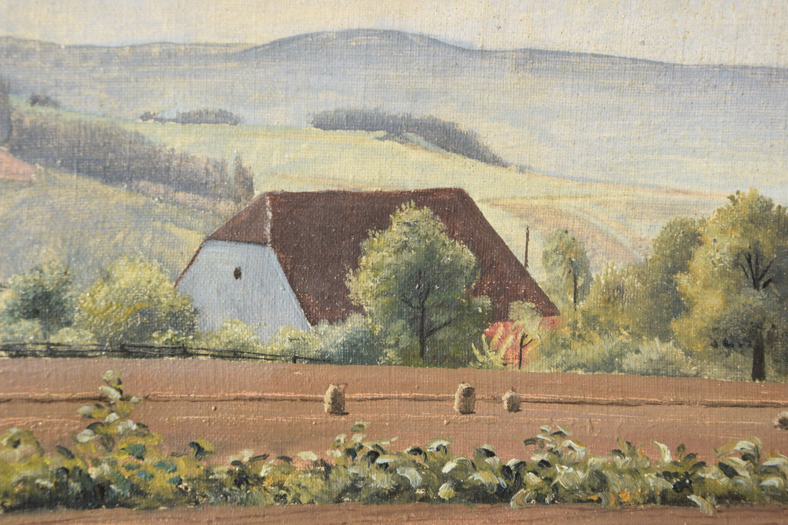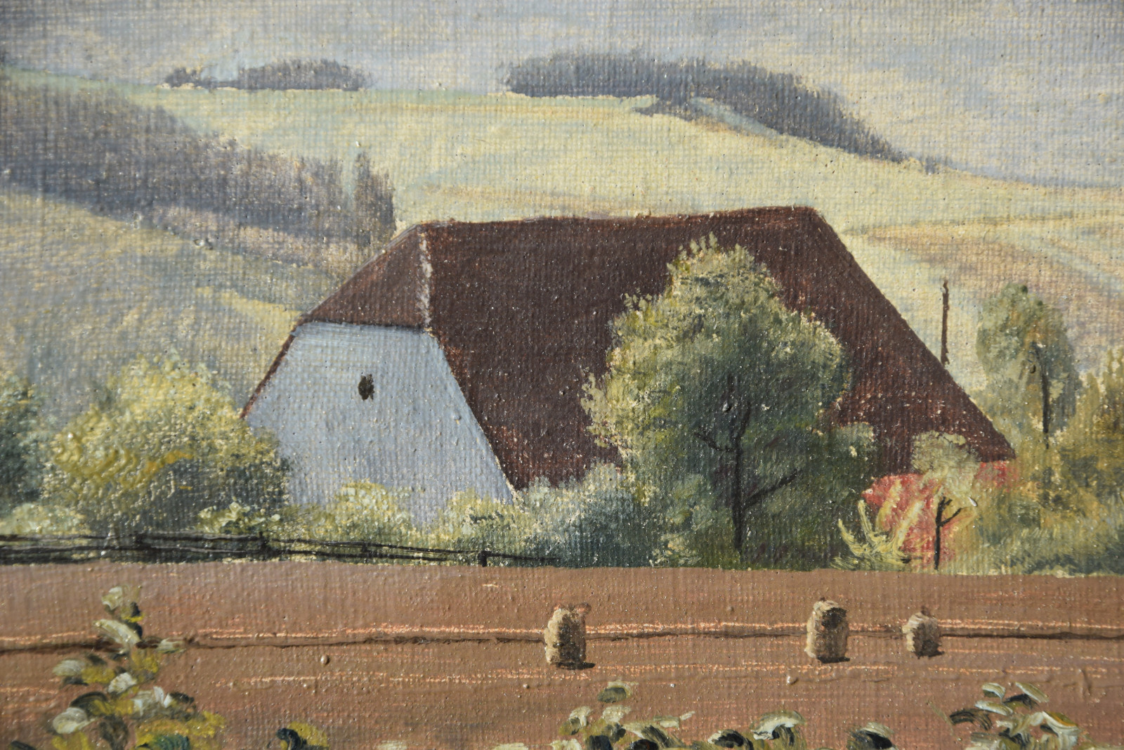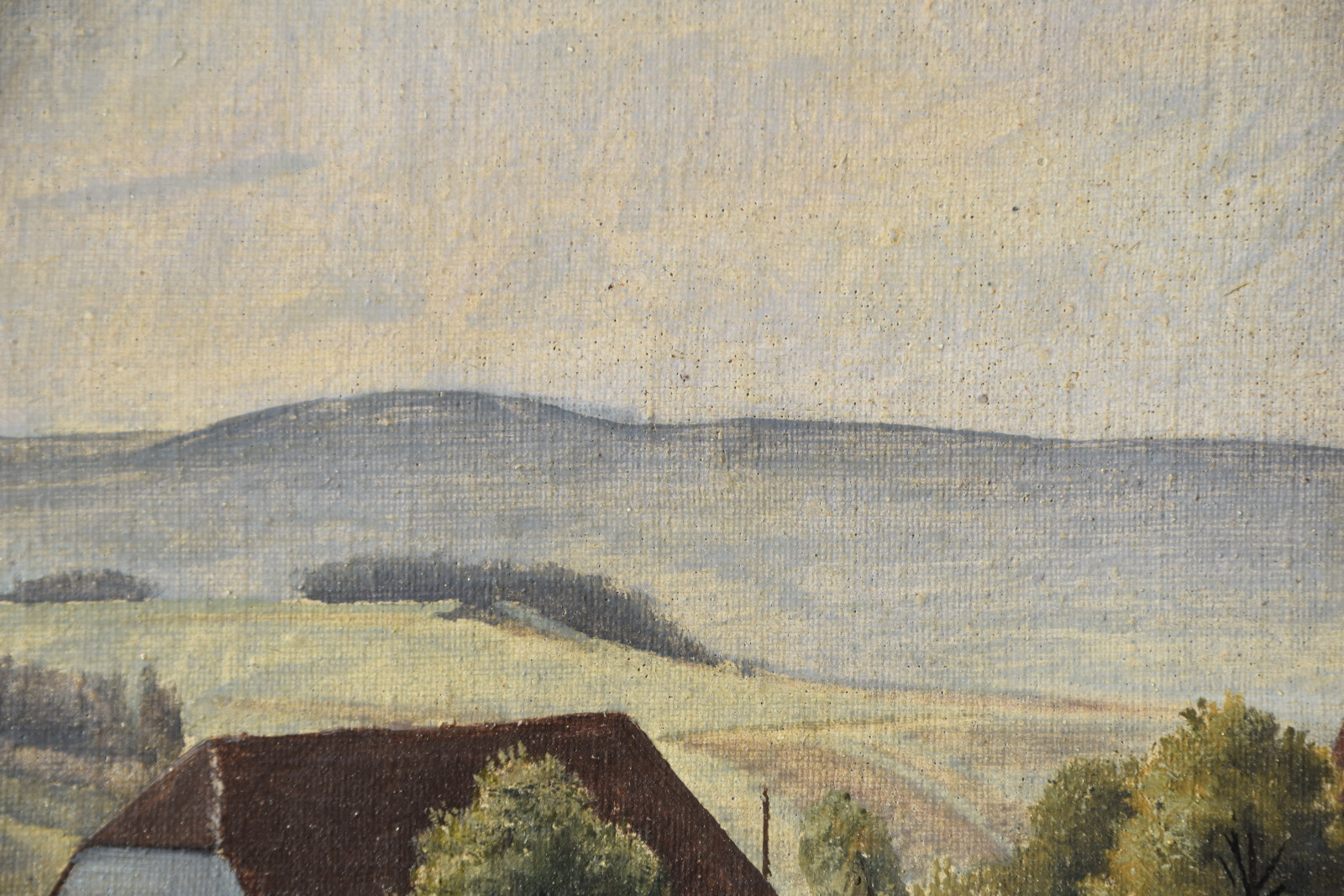 Vom Künstler wurde der weite Blick über die Felder, Ackerflächen hin zu den Gebäuden und dem Wald als Vorderseite gewählt, wodurch sich auch erklärt, dass nur diese Seite signiert und datiert (1928) ist. Demnach war die damalige Rückseite an den Rändern durch den früheren Keilrahmen verdeckt. Um nun beide Seiten sichtbar und hängbar zu machen, wurde der (noch vorhandene) Keilrahmen abgenommen und die Leinwand so gespannt, dass man bei der Hängung stets wählen kann.