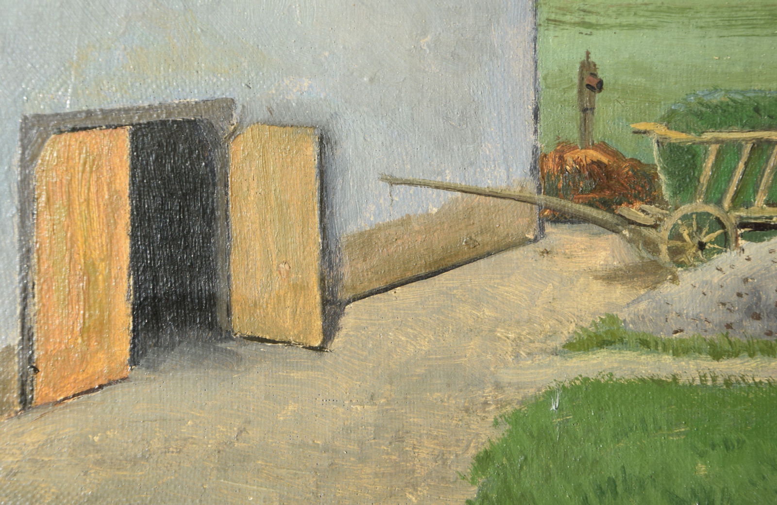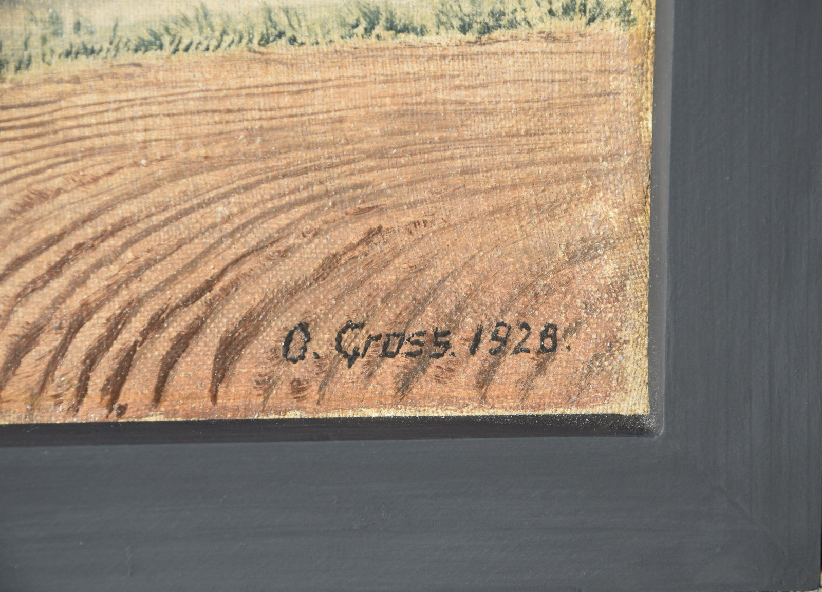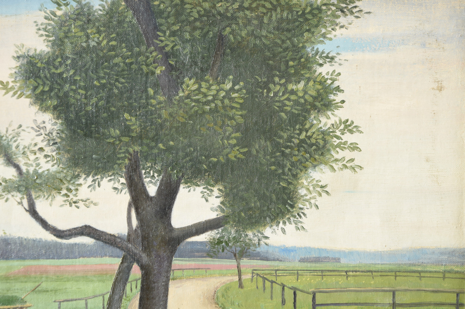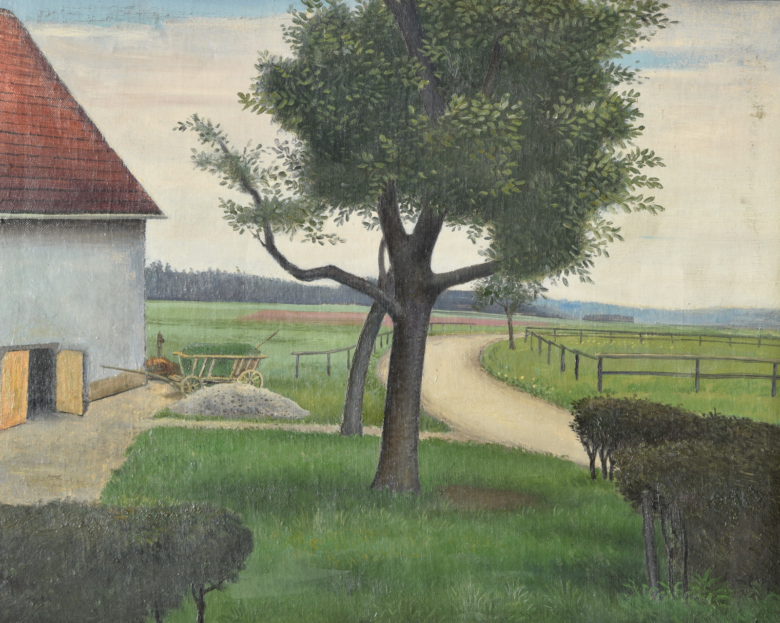 Vom Künstler wurde der weite Blick über die Felder, Ackerflächen hin zu den Gebäuden und dem Wald als Vorderseite gewählt, wodurch sich auch erklärt, dass nur diese Seite signiert und datiert (1928) ist. Demnach war die damalige Rückseite an den Rändern durch den früheren Keilrahmen verdeckt. Um nun beide Seiten sichtbar und hängbar zu machen, wurde der (noch vorhandene) Keilrahmen abgenommen und die Leinwand so gespannt, dass man bei der Hängung stets wählen kann.
