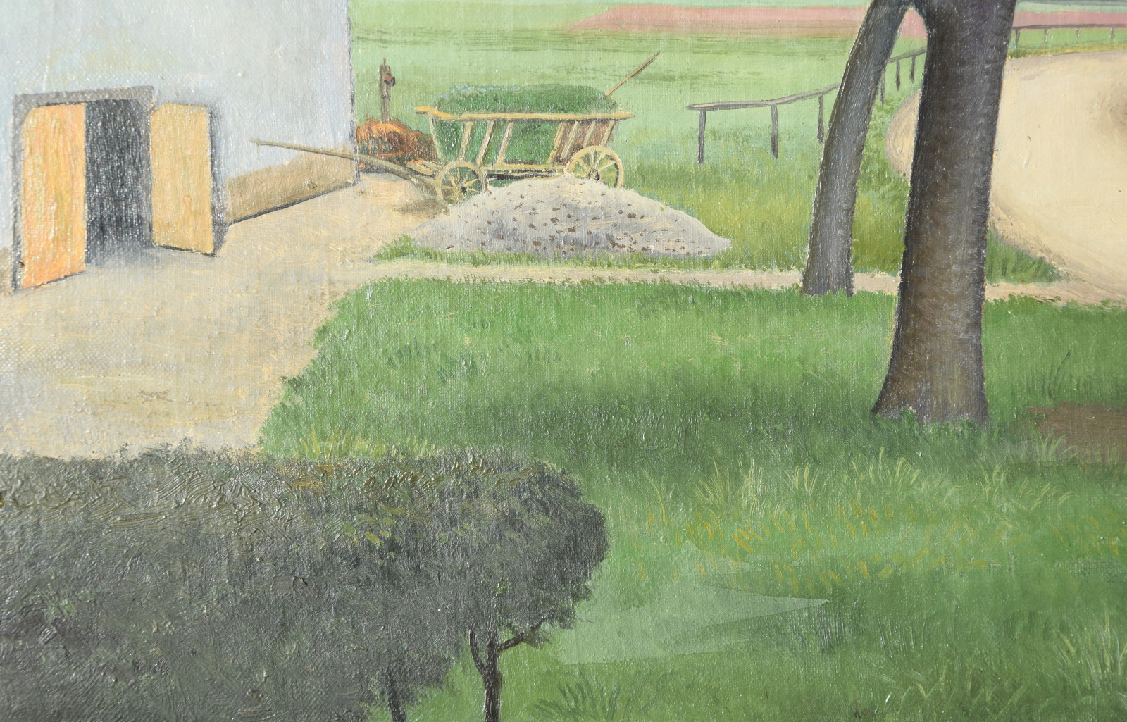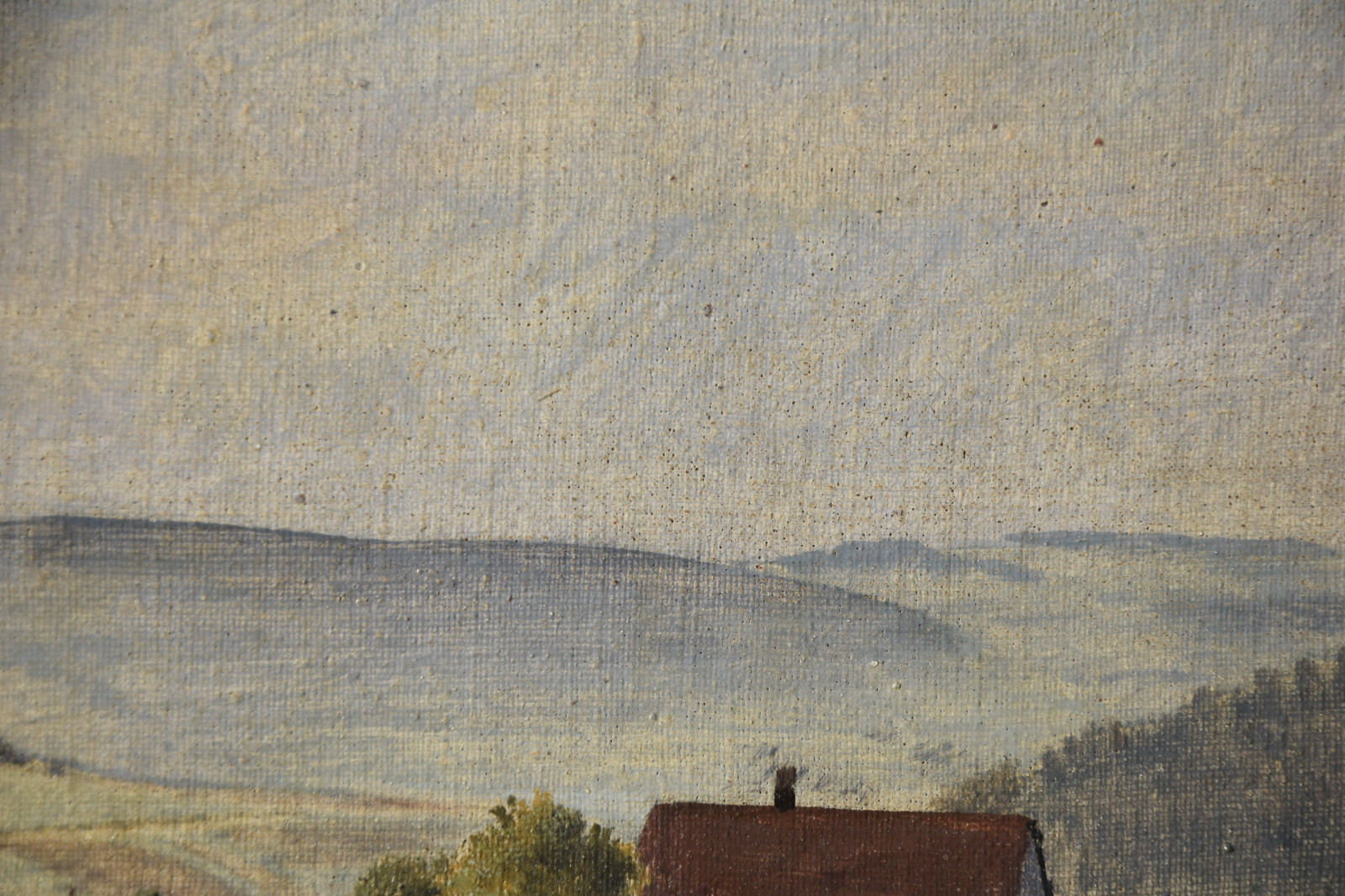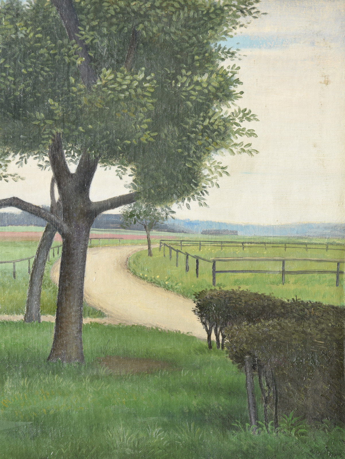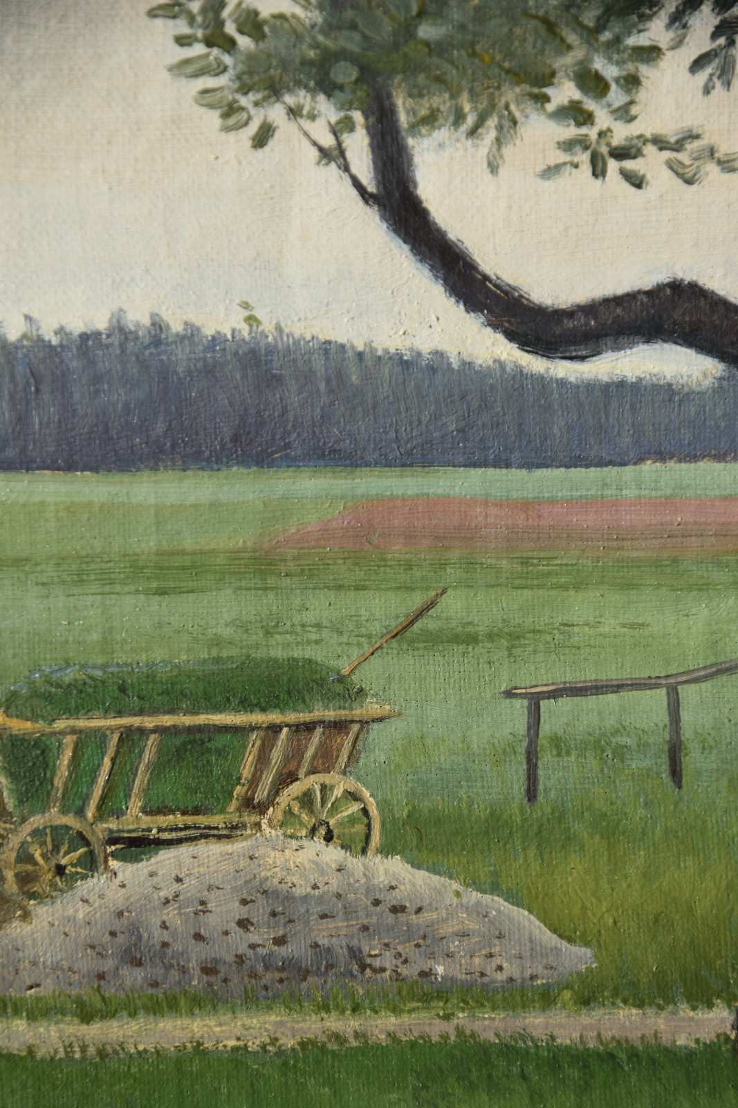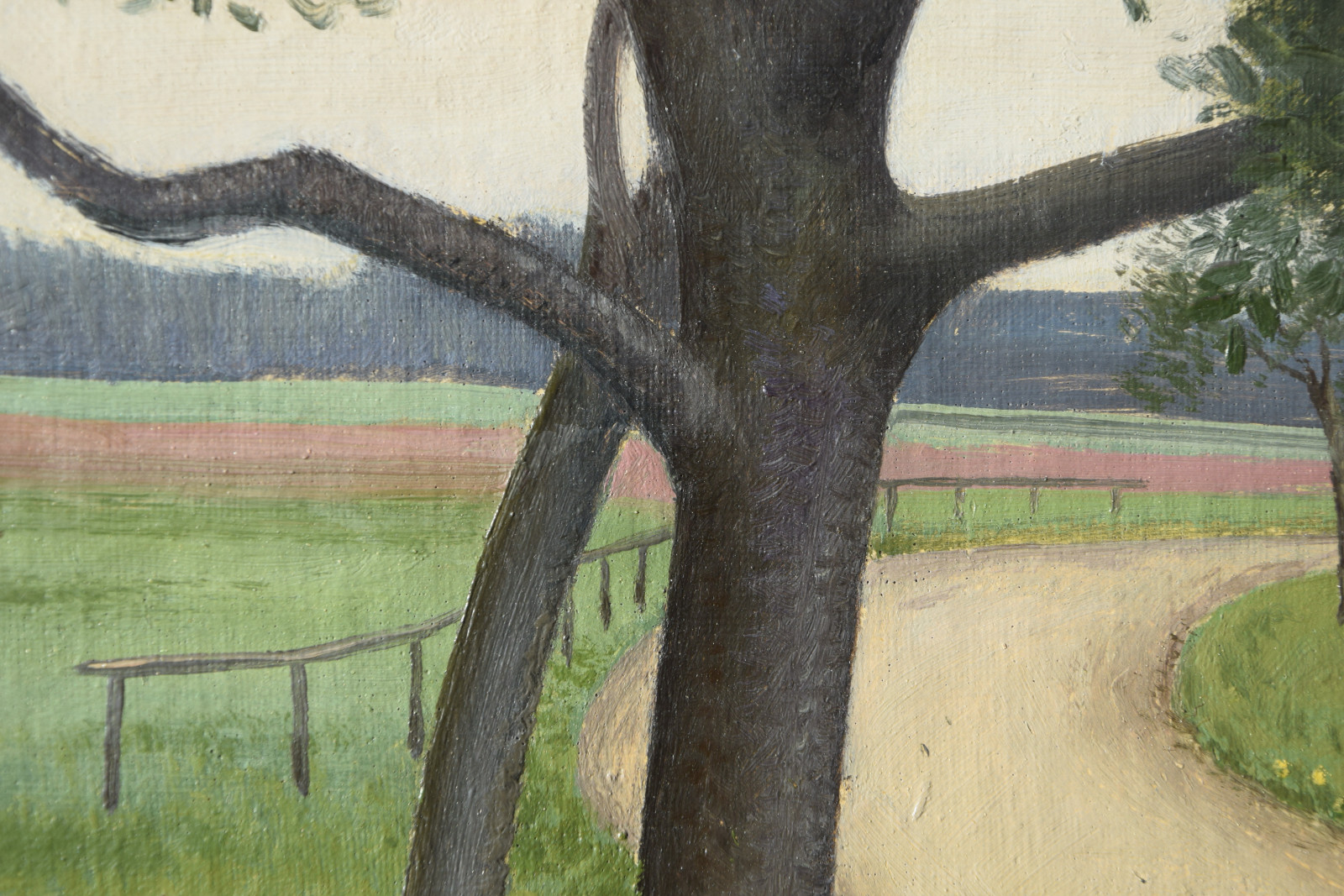 Vom Künstler wurde der weite Blick über die Felder, Ackerflächen hin zu den Gebäuden und dem Wald als Vorderseite gewählt, wodurch sich auch erklärt, dass nur diese Seite signiert und datiert (1928) ist. Demnach war die damalige Rückseite an den Rändern durch den früheren Keilrahmen verdeckt. Um nun beide Seiten sichtbar und hängbar zu machen, wurde der (noch vorhandene) Keilrahmen abgenommen und die Leinwand so gespannt, dass man bei der Hängung stets wählen kann.
