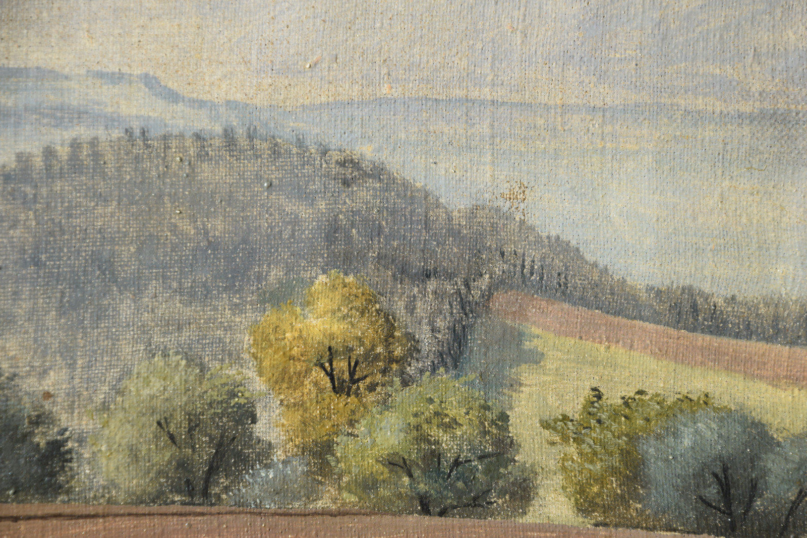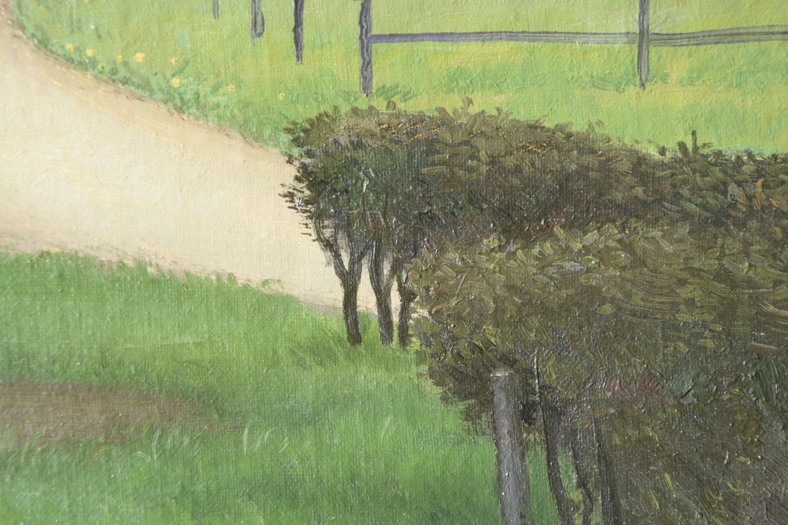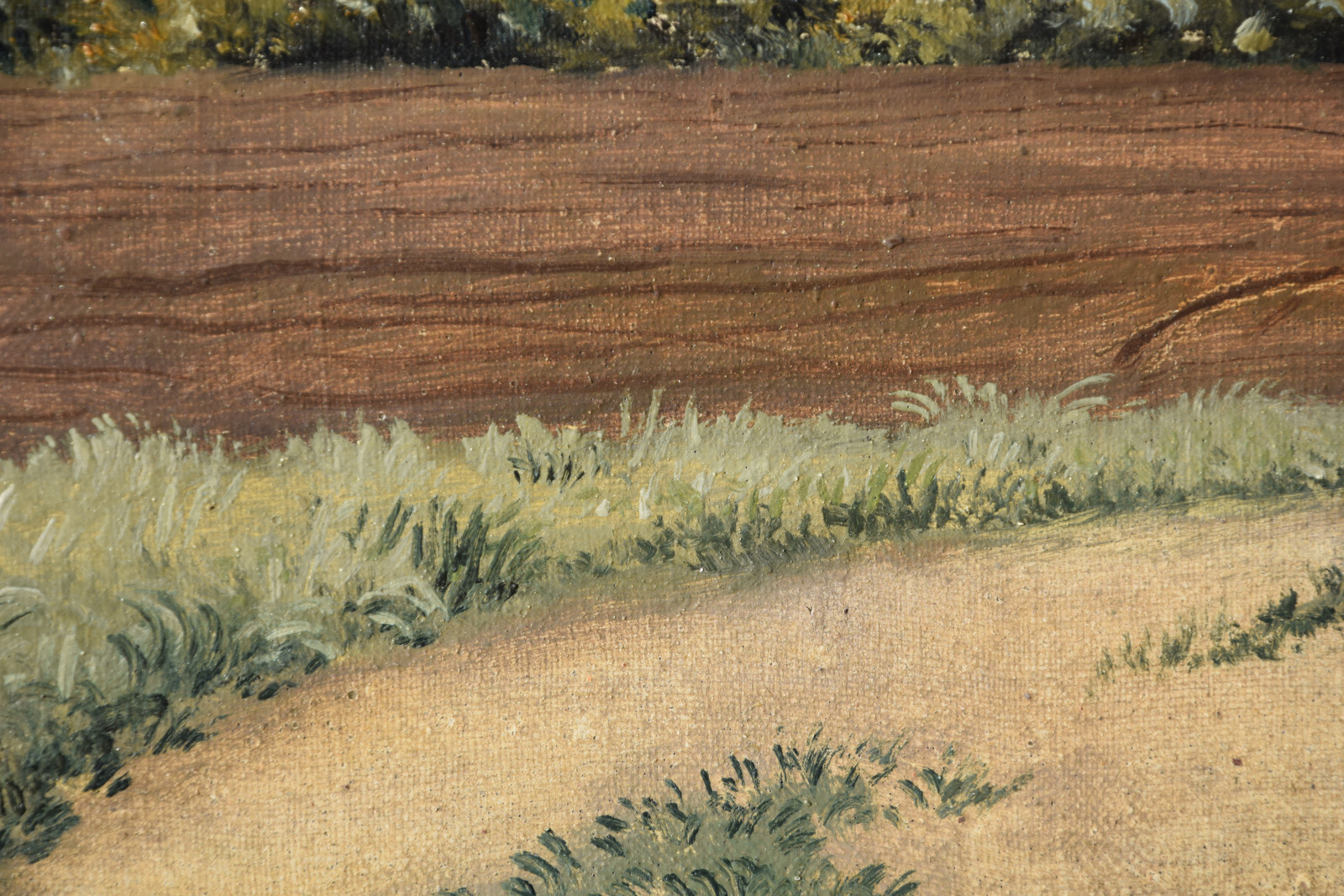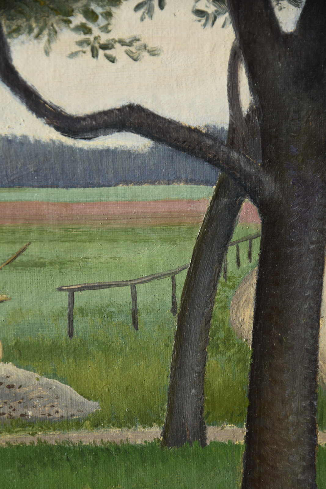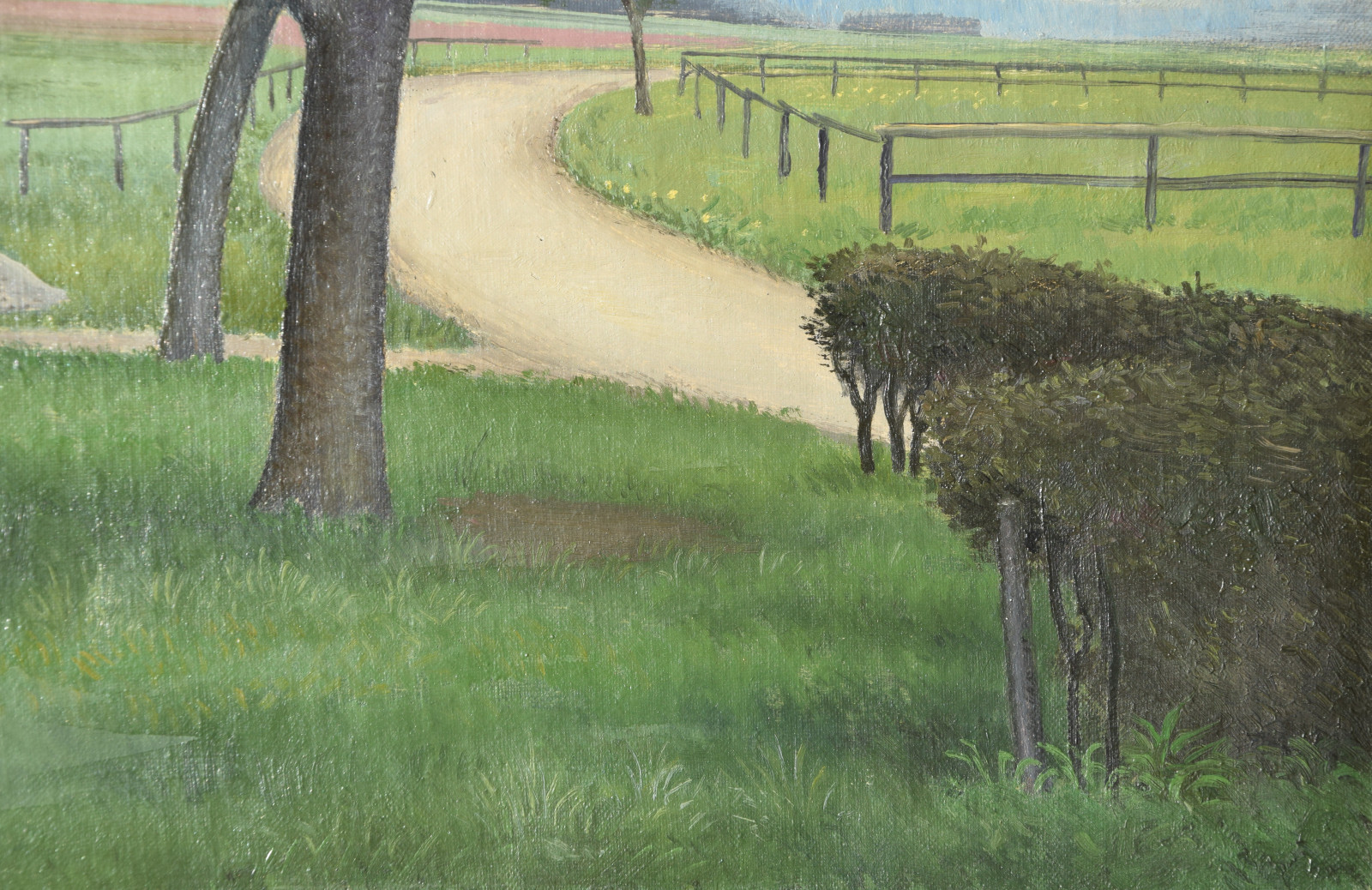 Vom Künstler wurde der weite Blick über die Felder, Ackerflächen hin zu den Gebäuden und dem Wald als Vorderseite gewählt, wodurch sich auch erklärt, dass nur diese Seite signiert und datiert (1928) ist. Demnach war die damalige Rückseite an den Rändern durch den früheren Keilrahmen verdeckt. Um nun beide Seiten sichtbar und hängbar zu machen, wurde der (noch vorhandene) Keilrahmen abgenommen und die Leinwand so gespannt, dass man bei der Hängung stets wählen kann.