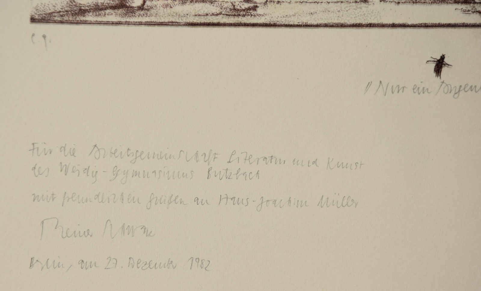 „Für die Arbeitsgemeinschaft Literatur und Kunst des Weidig-Gymnasiums Butzbach mit freundlichen Grüßen an Hans-Joachim Müller / Reiner Schwarz / Berlin, am 27. Dezember 1982“