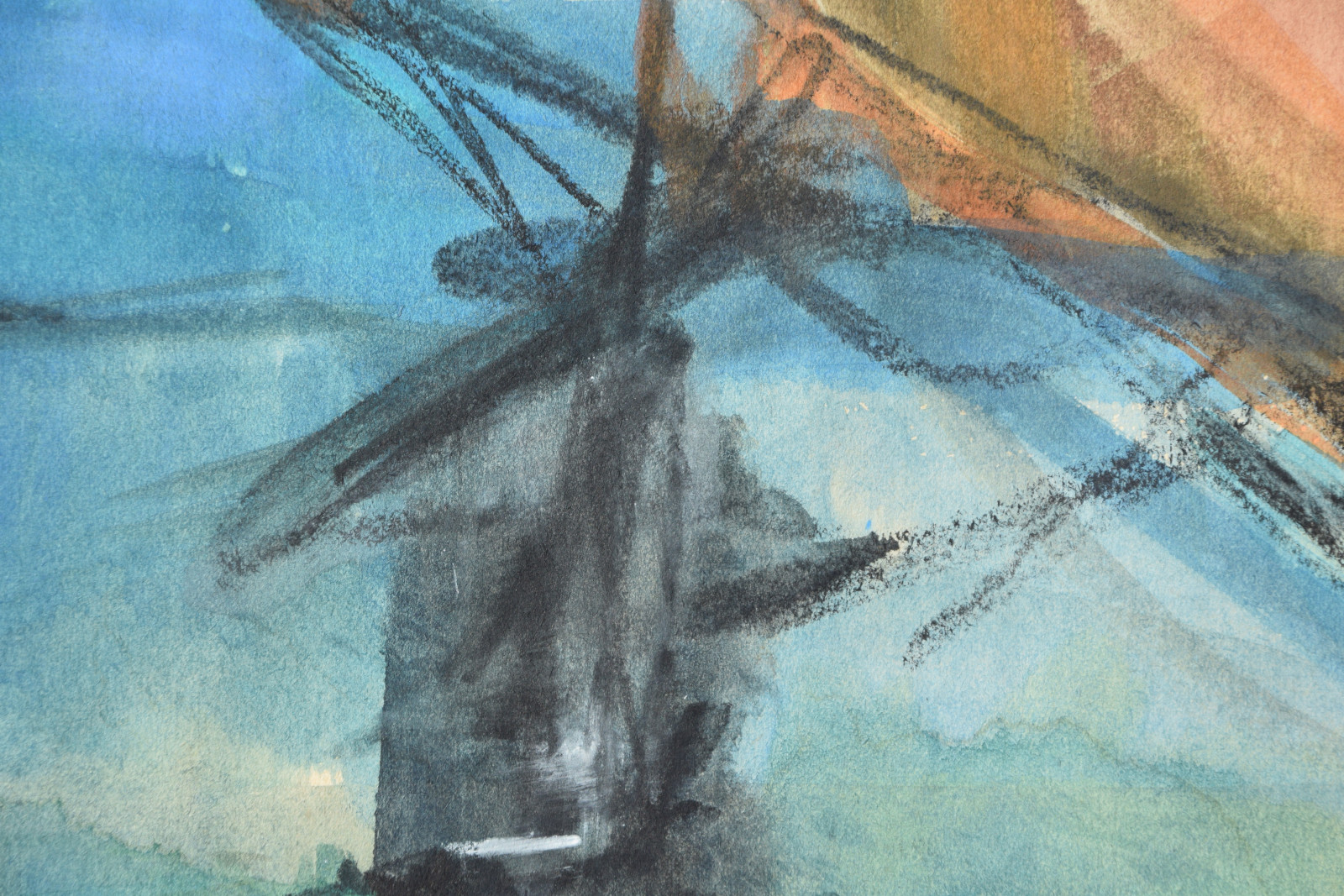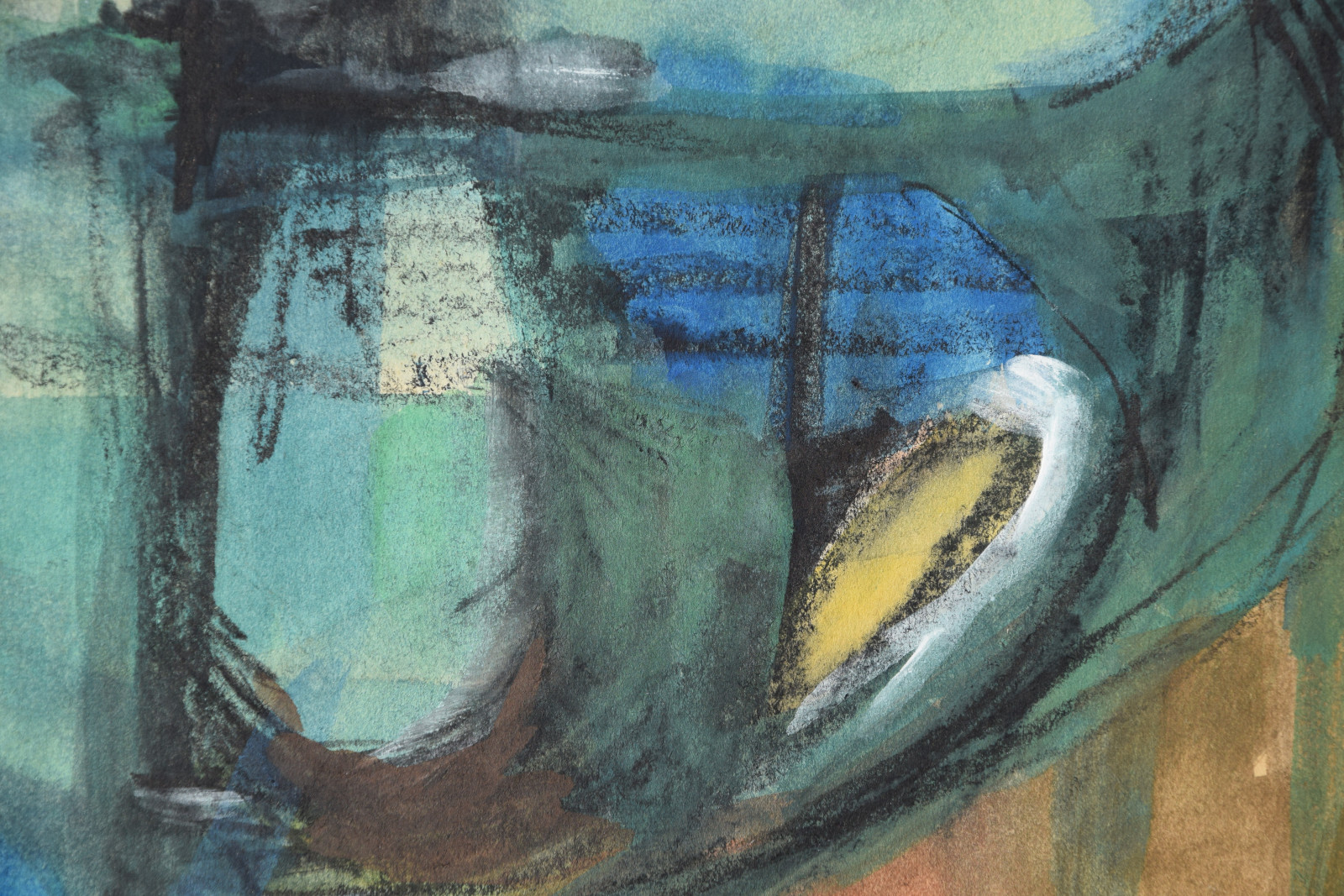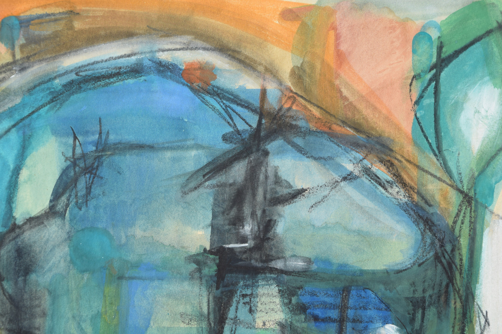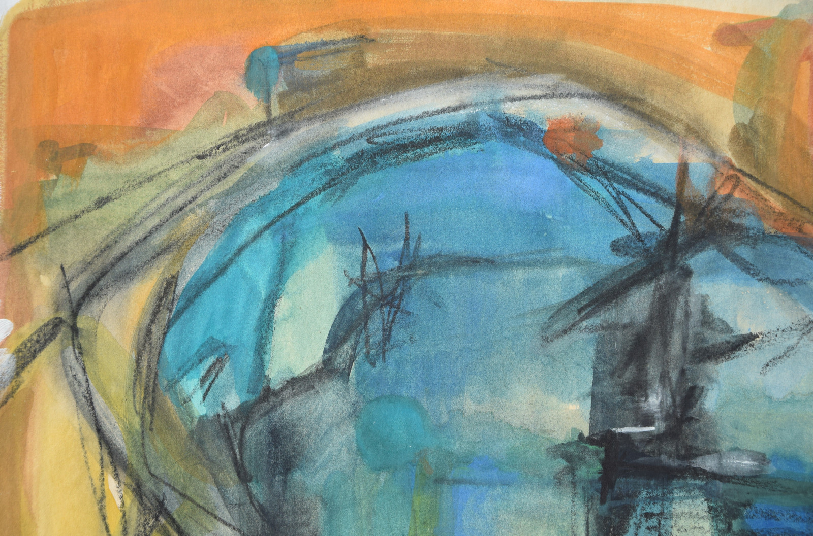 Bei der vorliegenden Arbeit war die Künstlerin gerade einmal 18 Jahre alt. Vordergründig scheint man hier eine Abstraktion vor sich zu haben, doch fügen sich die Farbflächen und Strukturen nach einigem Betrachten doch zu einer gegenständlichen Landschaftsdarstellung zusammen. Rechts am Rand markant ein hoher Laubbaum, in den vier Eckbereichen quasi innerbildlich einrahmend hellbraune Flächen und in der Bildmitte schließlich ein Gewässer – vielleicht ein See oder ein Fluss – sowie im Hintergrund ein dunkles Bauwerk, dass gerade im oberen Bereich deutlich an eine Windmühle denken lässt.