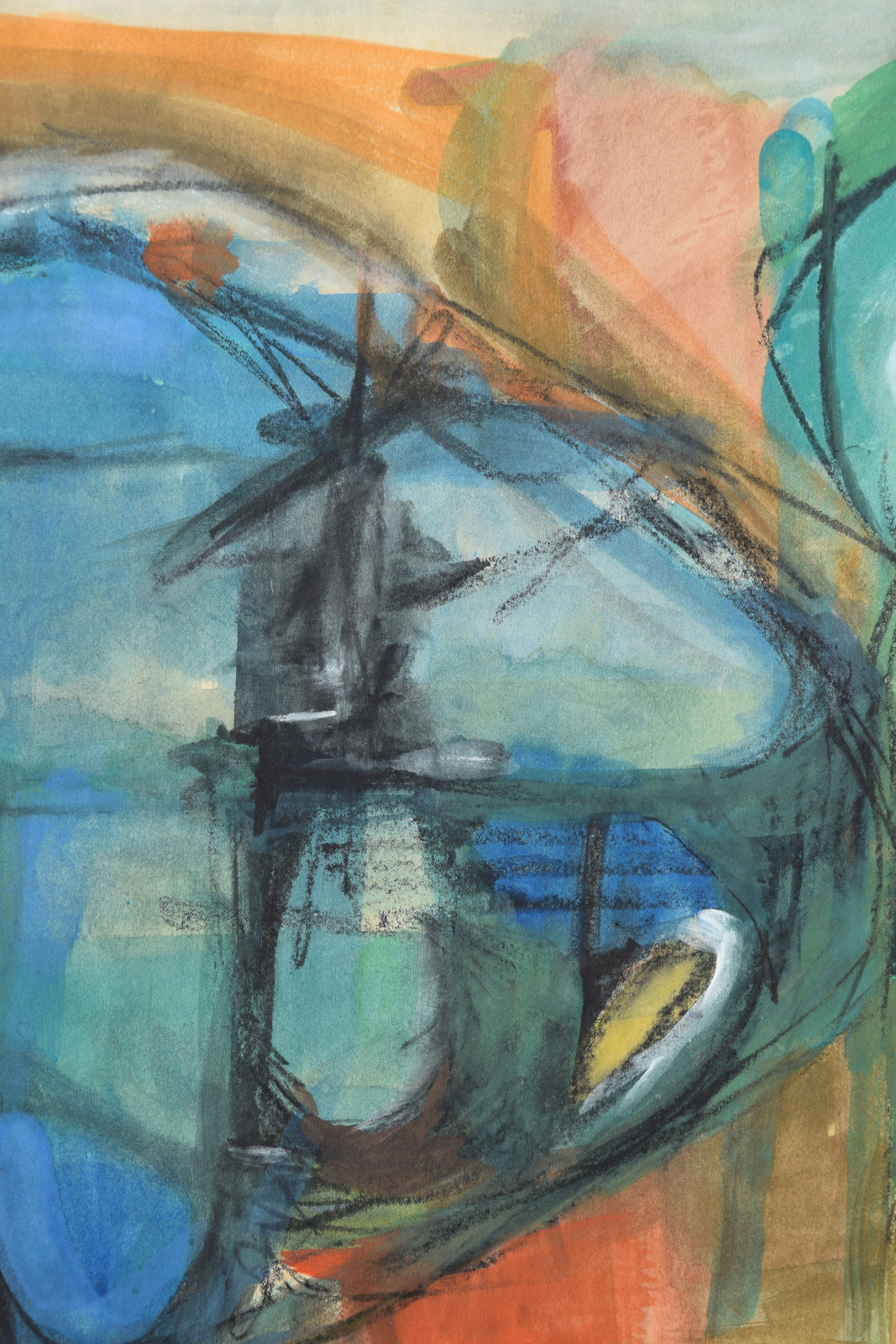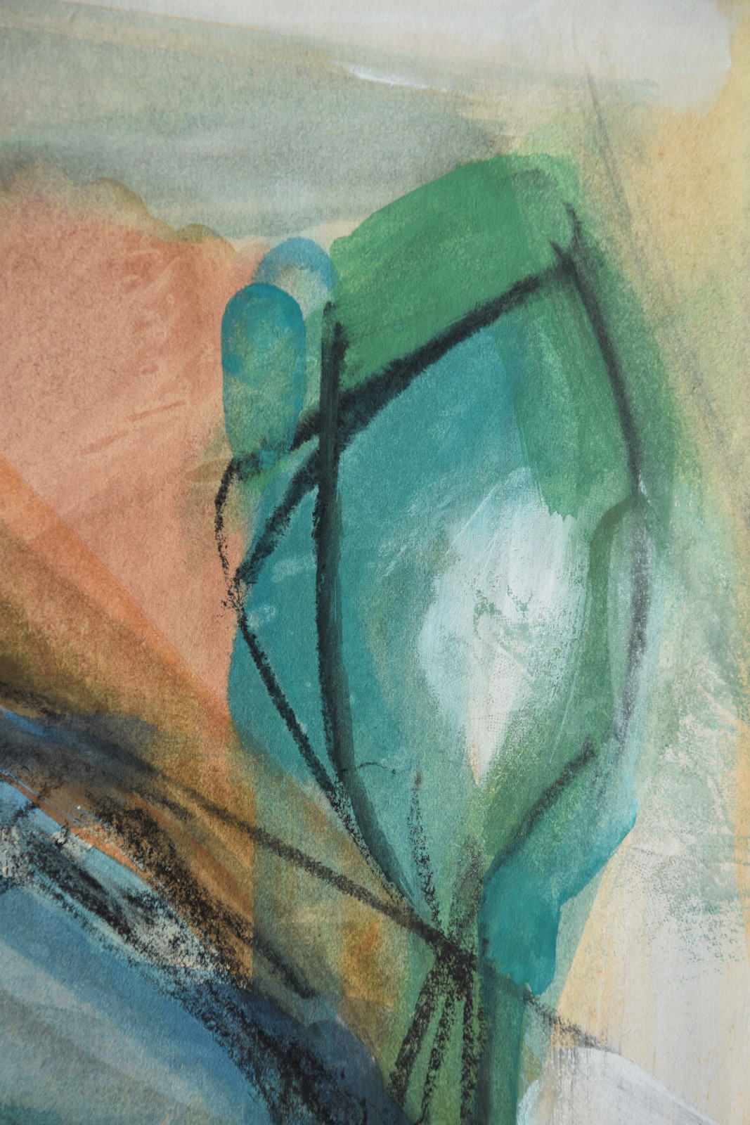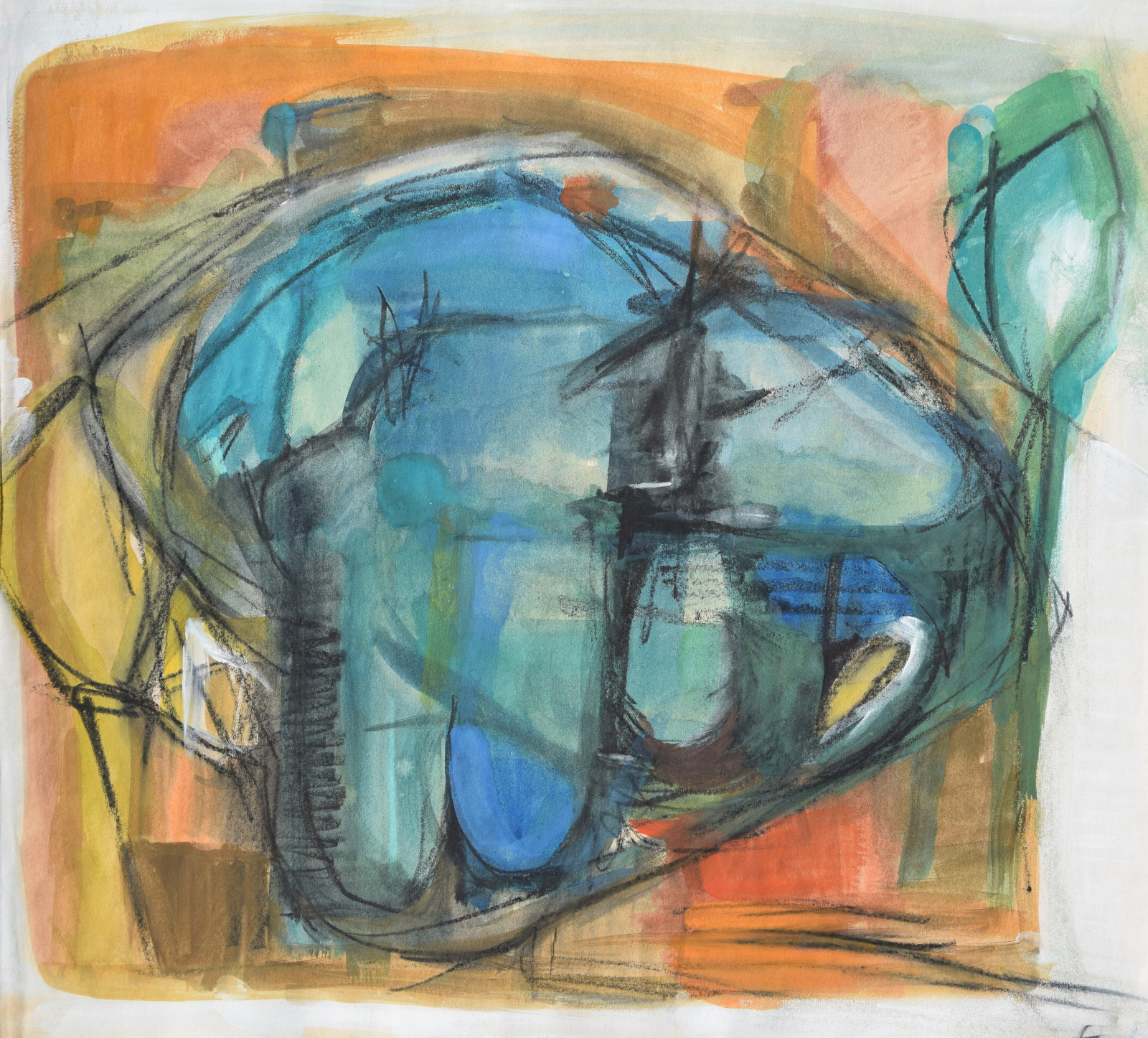 Bei der vorliegenden Arbeit war die Künstlerin gerade einmal 18 Jahre alt. Vordergründig scheint man hier eine Abstraktion vor sich zu haben, doch fügen sich die Farbflächen und Strukturen nach einigem Betrachten doch zu einer gegenständlichen Landschaftsdarstellung zusammen. Rechts am Rand markant ein hoher Laubbaum, in den vier Eckbereichen quasi innerbildlich einrahmend hellbraune Flächen und in der Bildmitte schließlich ein Gewässer – vielleicht ein See oder ein Fluss – sowie im Hintergrund ein dunkles Bauwerk, dass gerade im oberen Bereich deutlich an eine Windmühle denken lässt.