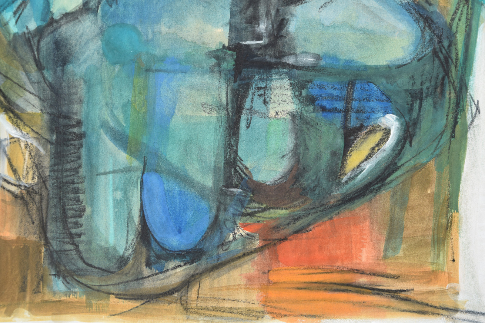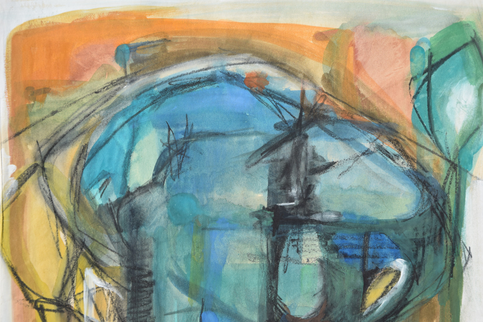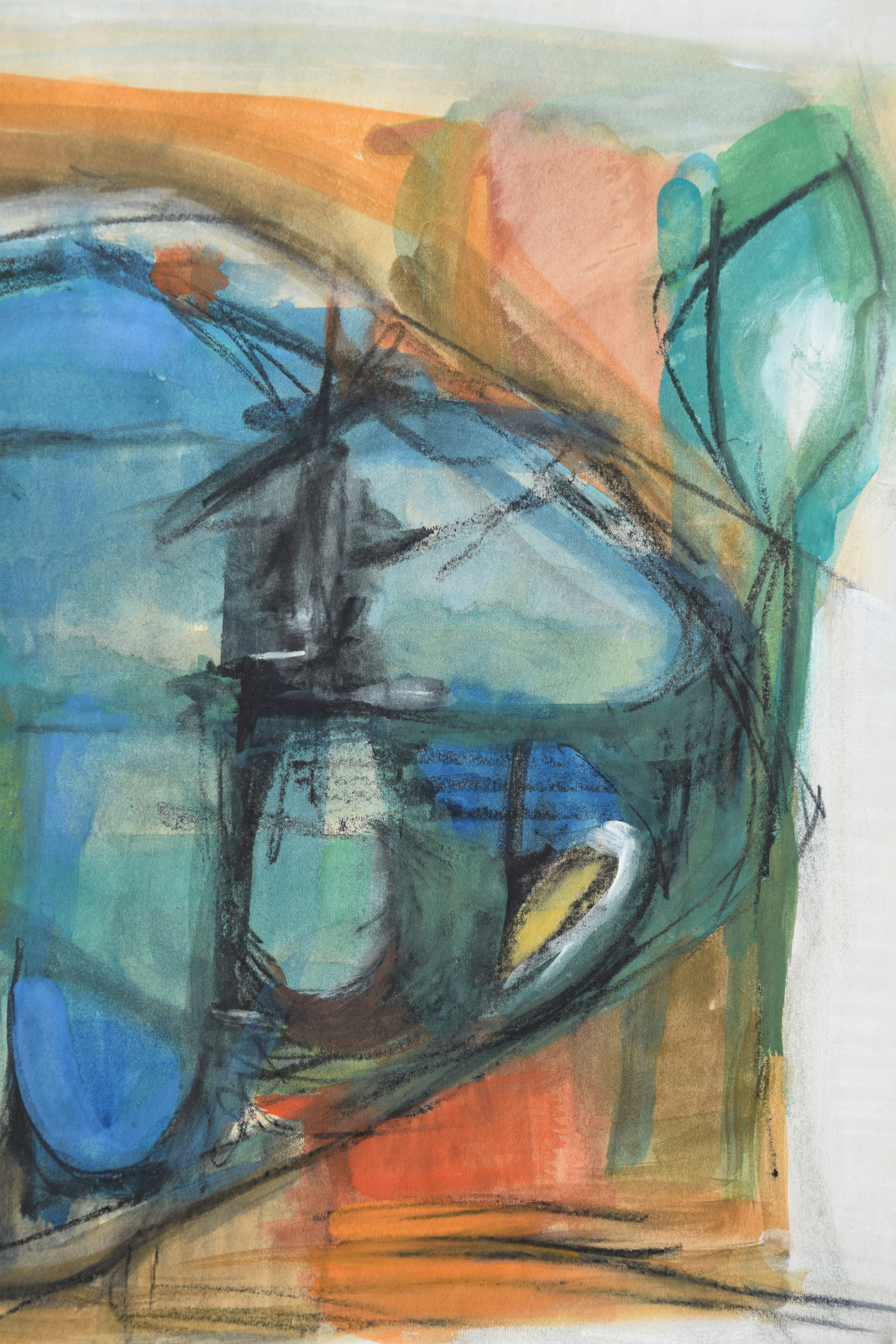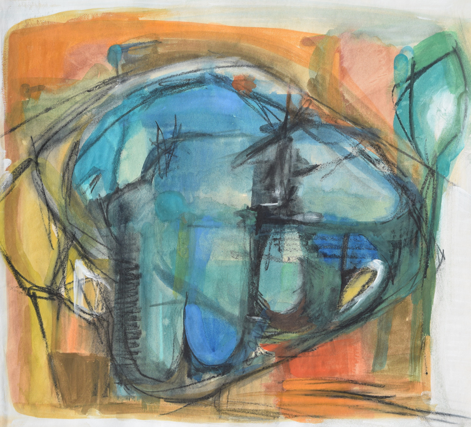 Bei der vorliegenden Arbeit war die Künstlerin gerade einmal 18 Jahre alt. Vordergründig scheint man hier eine Abstraktion vor sich zu haben, doch fügen sich die Farbflächen und Strukturen nach einigem Betrachten doch zu einer gegenständlichen Landschaftsdarstellung zusammen. Rechts am Rand markant ein hoher Laubbaum, in den vier Eckbereichen quasi innerbildlich einrahmend hellbraune Flächen und in der Bildmitte schließlich ein Gewässer – vielleicht ein See oder ein Fluss – sowie im Hintergrund ein dunkles Bauwerk, dass gerade im oberen Bereich deutlich an eine Windmühle denken lässt.