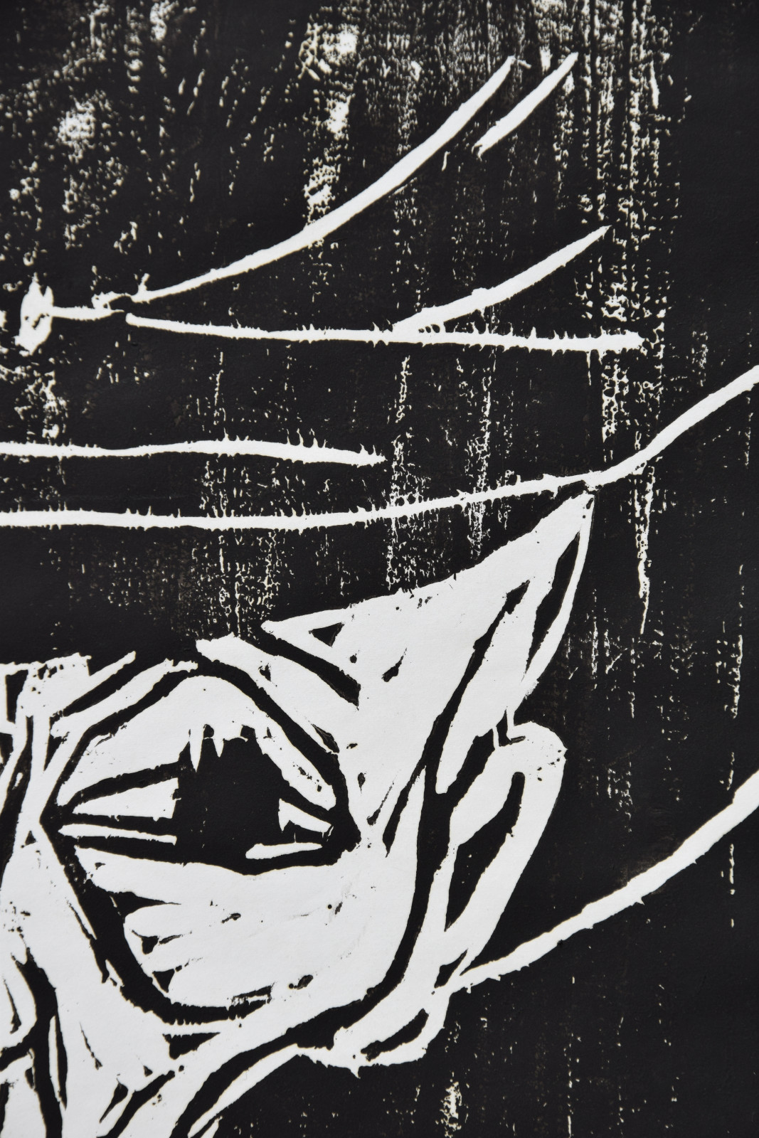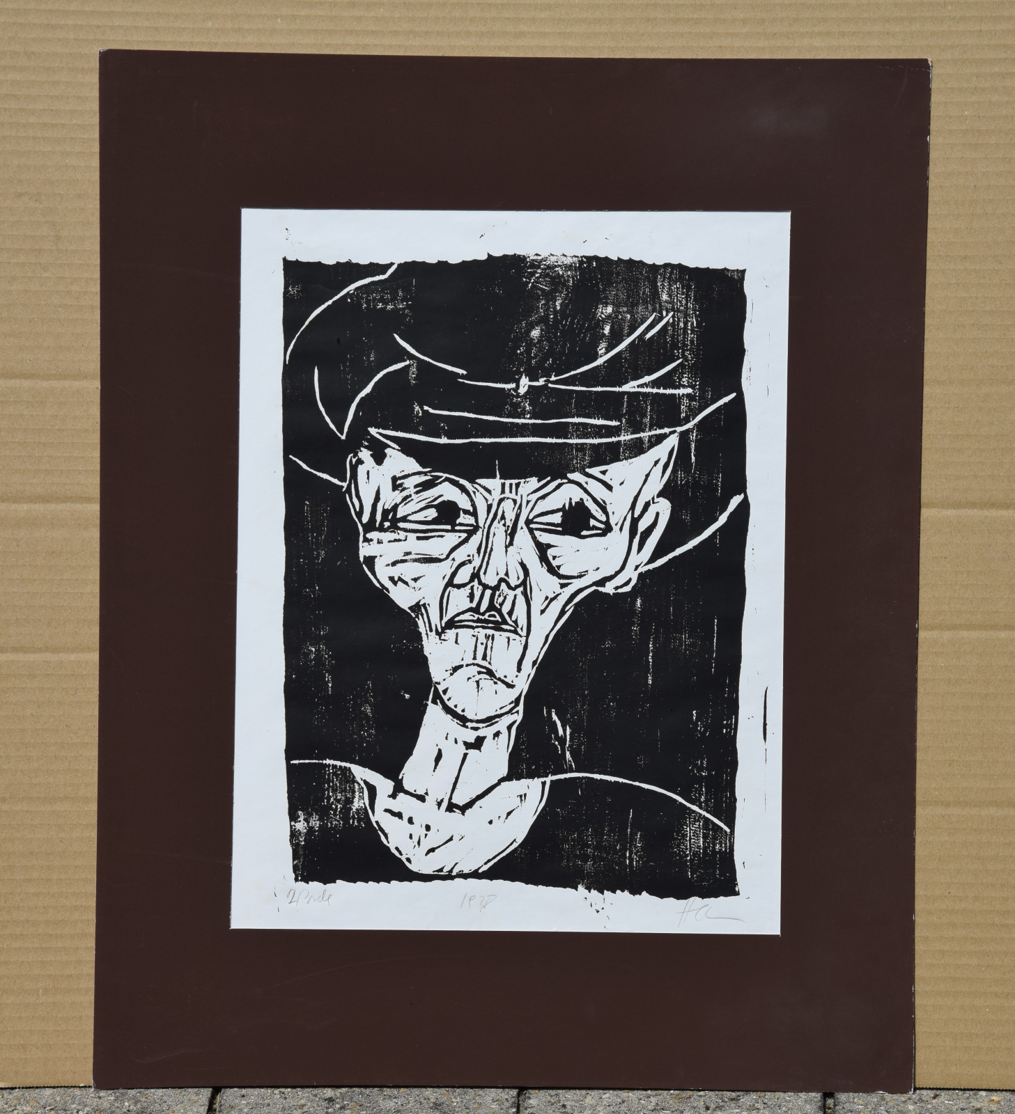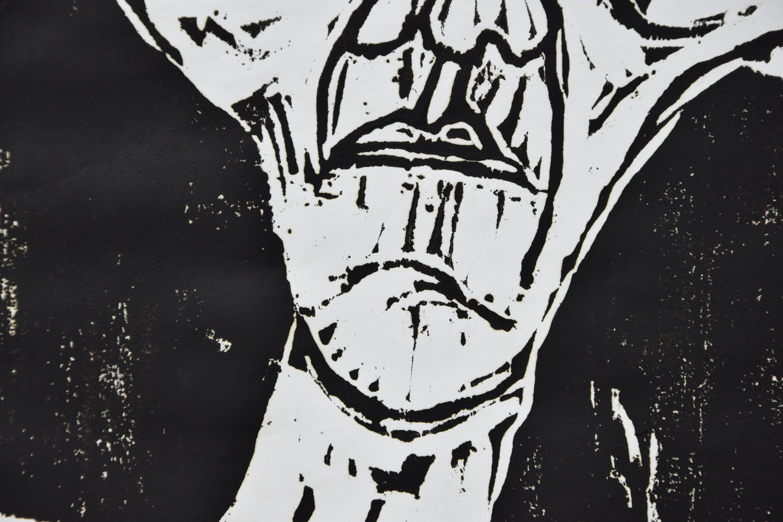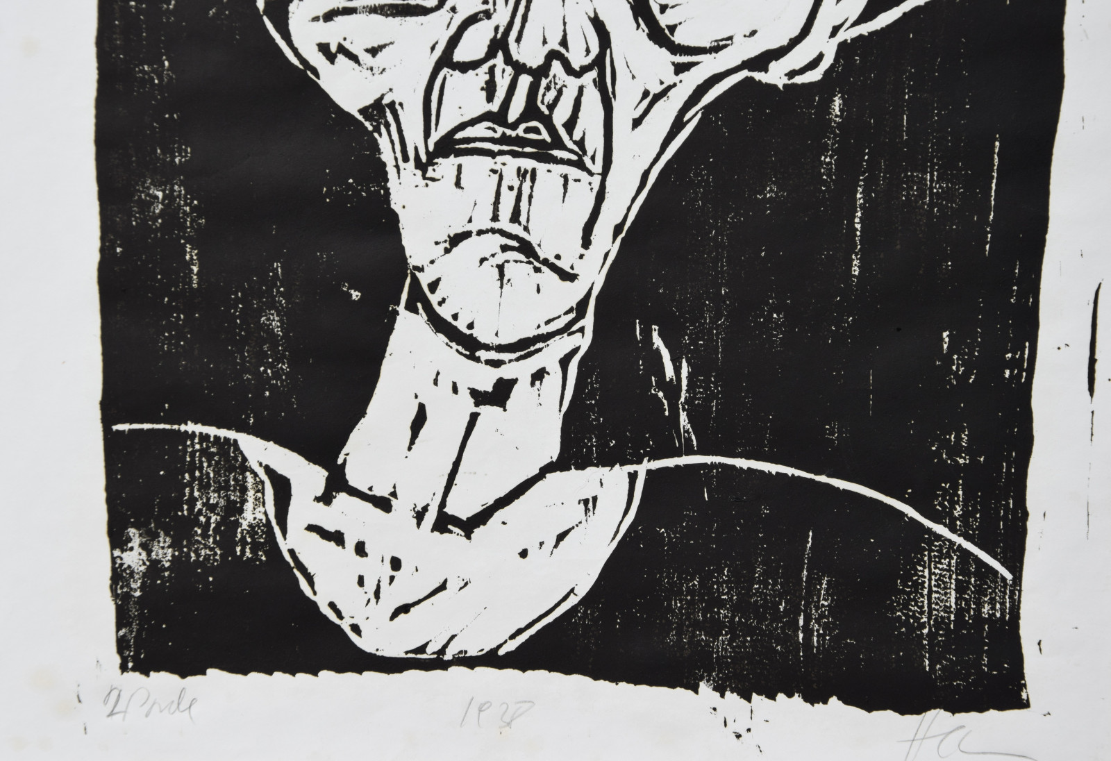Der hier vorliegende Linolschnitt wird ebenso in dieser nachweisbaren Zeit Walter Hehns entstanden sein. Ganz dezidiert greift auch dieses Blatt ein politisches Thema auf: den sogenannten „Anschluss“ Österreichs an das Deutsche Reich im Jahre 1938. Womöglich könnte dies darauf verweisen, dass Hehn diese Mappe zum 30. Jahrestag 1968 schuf.