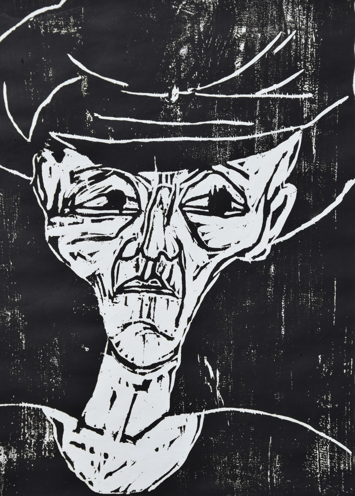 Hehn zeigt einen hageren, ernst oder auch mürrisch blickenden Mann unter einer breiten, in wenigen Strichen angedeuteten Schirmmütze. Es dürfte sich dabei um einen Soldaten handeln, der in diesem Kontext die ausführende Gewalt des “Anschlusses” personifiziert.