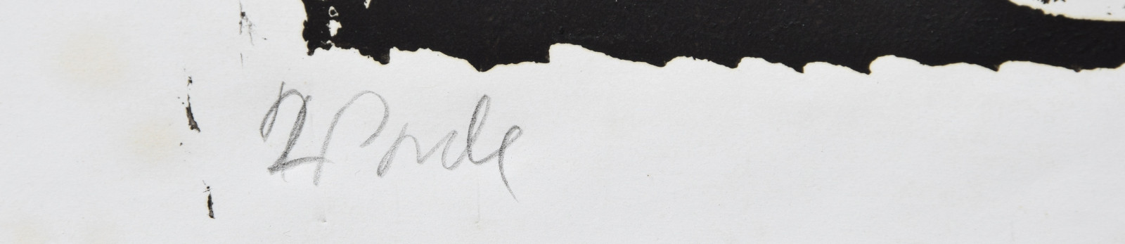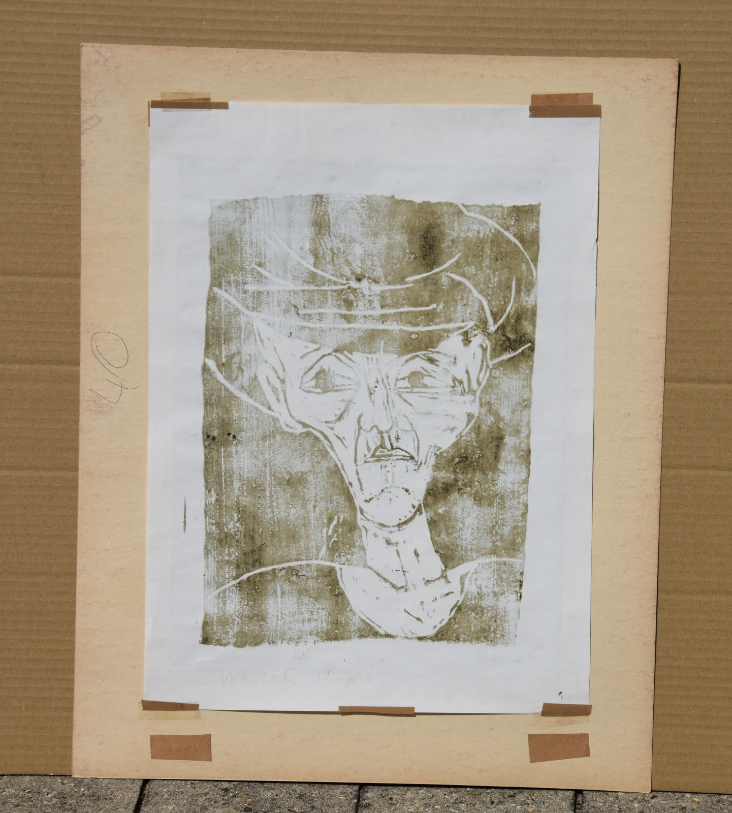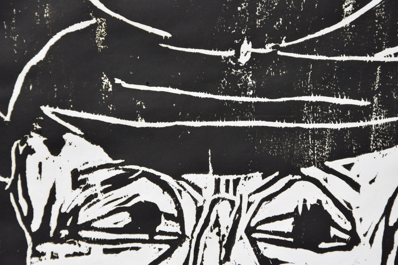 Linolschnitt auf Glanzpapier, verso am oberen und unteren Rand durch Klebestreifen unter Passepartoutmaske