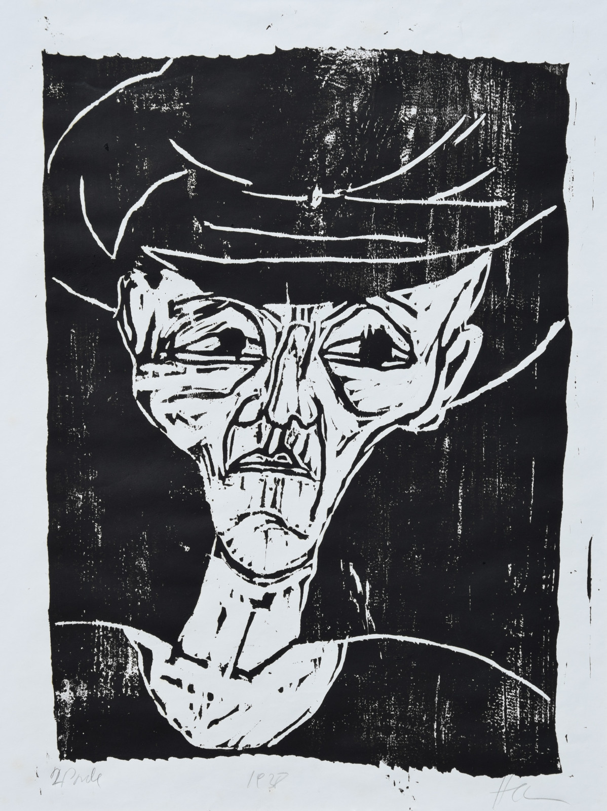 ohne Titel [Bildnis eines hageren Mannes (Soldaten?), Blatt aus der „1938“-Mappe, hierzu mittig in Blei bez. „1938“]