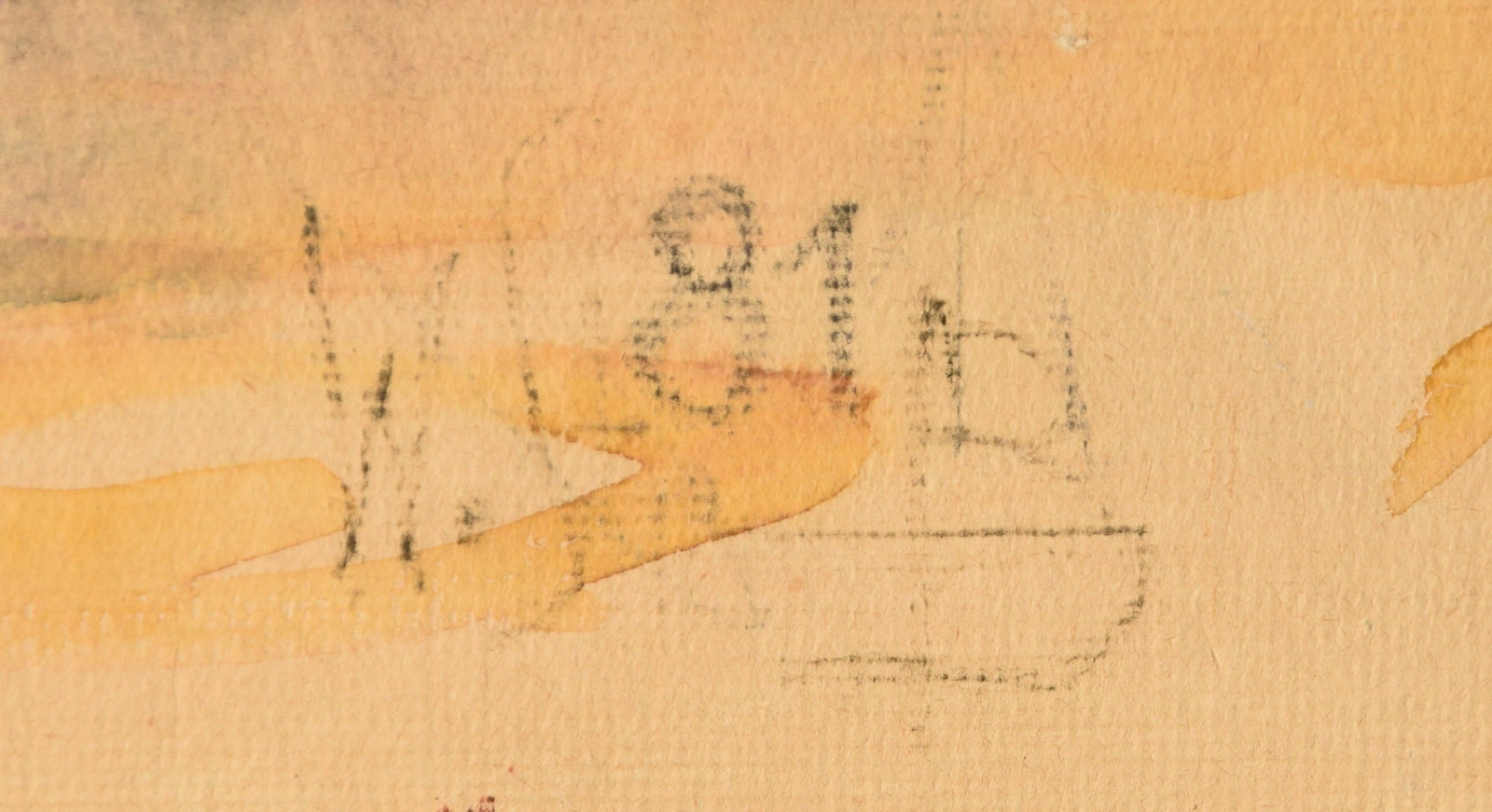 Aquarell & Deckweiß über leichten Bleistiftvorzeichnungen auf Bütten, Papier vom Künstler umgeschlagen über Karton und dort mit Klebestreifen befestigt