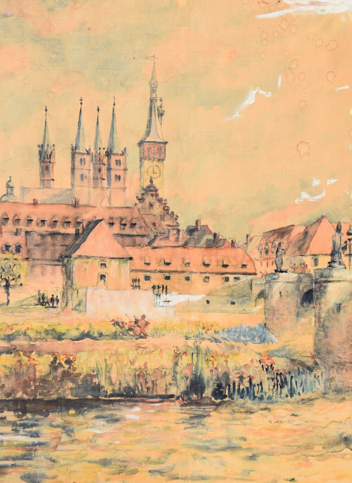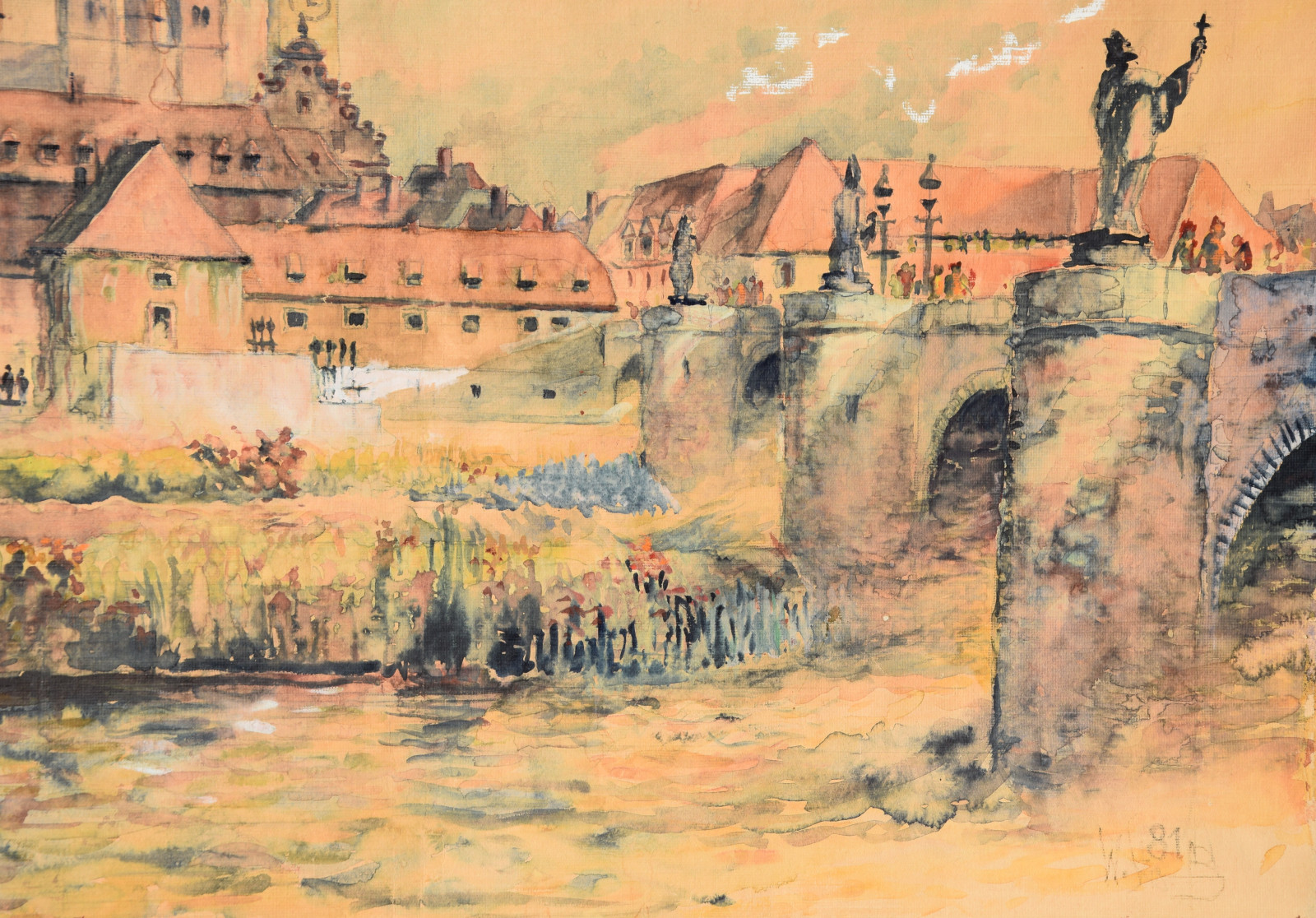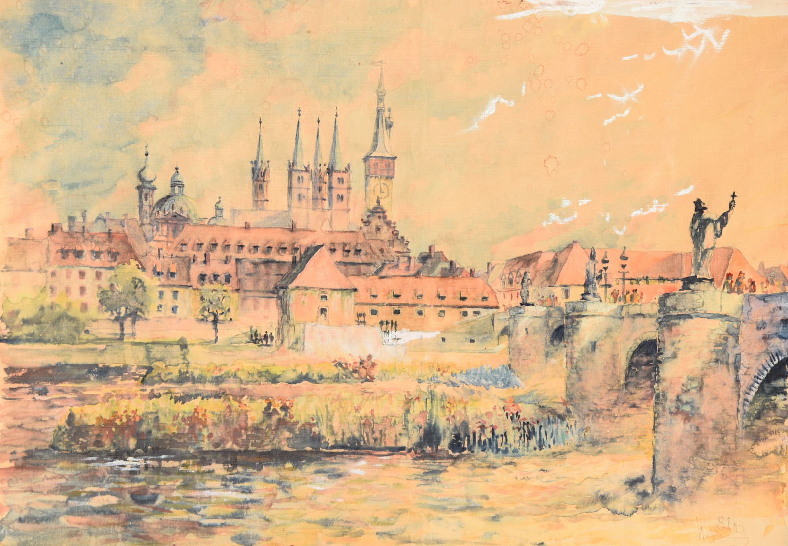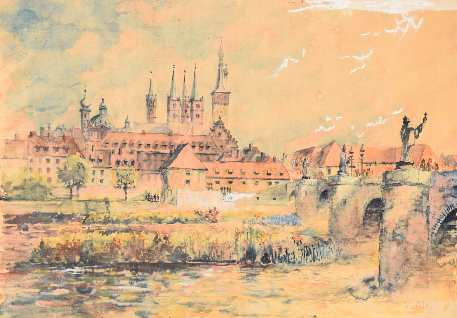 „Stadt am Fluss I“ [so verso auf Etikett handschriftlich betitelt, Blick auf Würzburg mit u. a. Alter Mainbrücke, Neumünster, Dom]