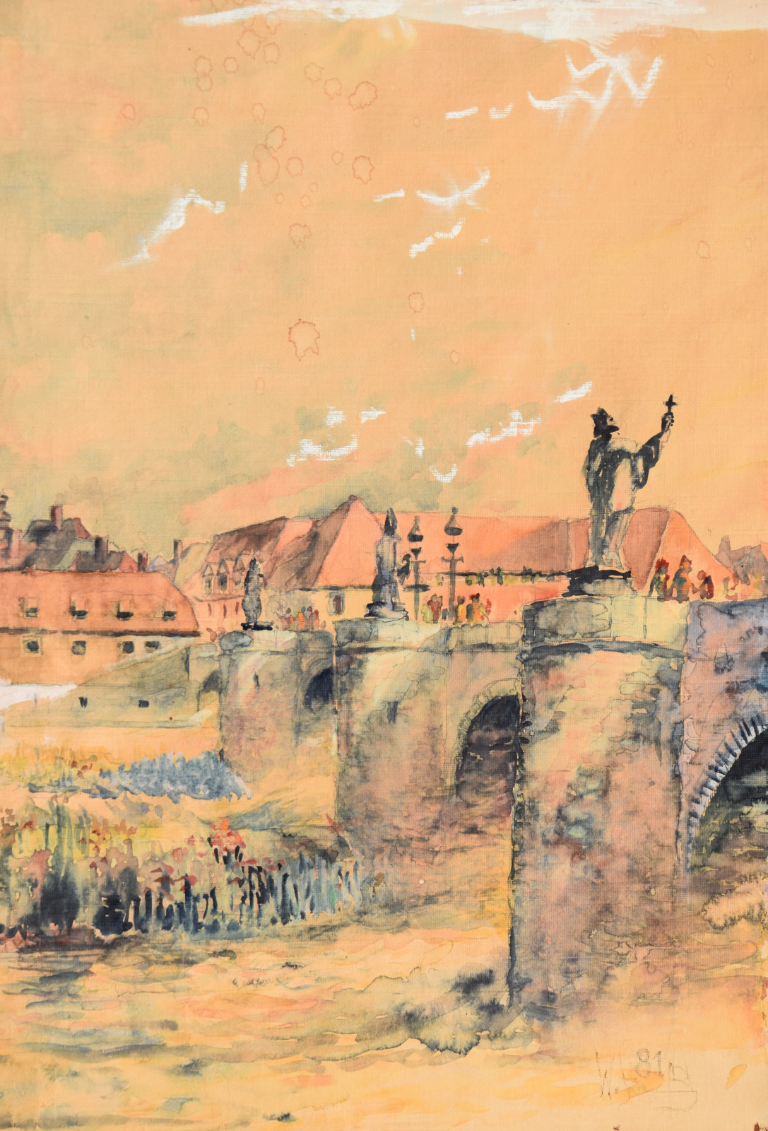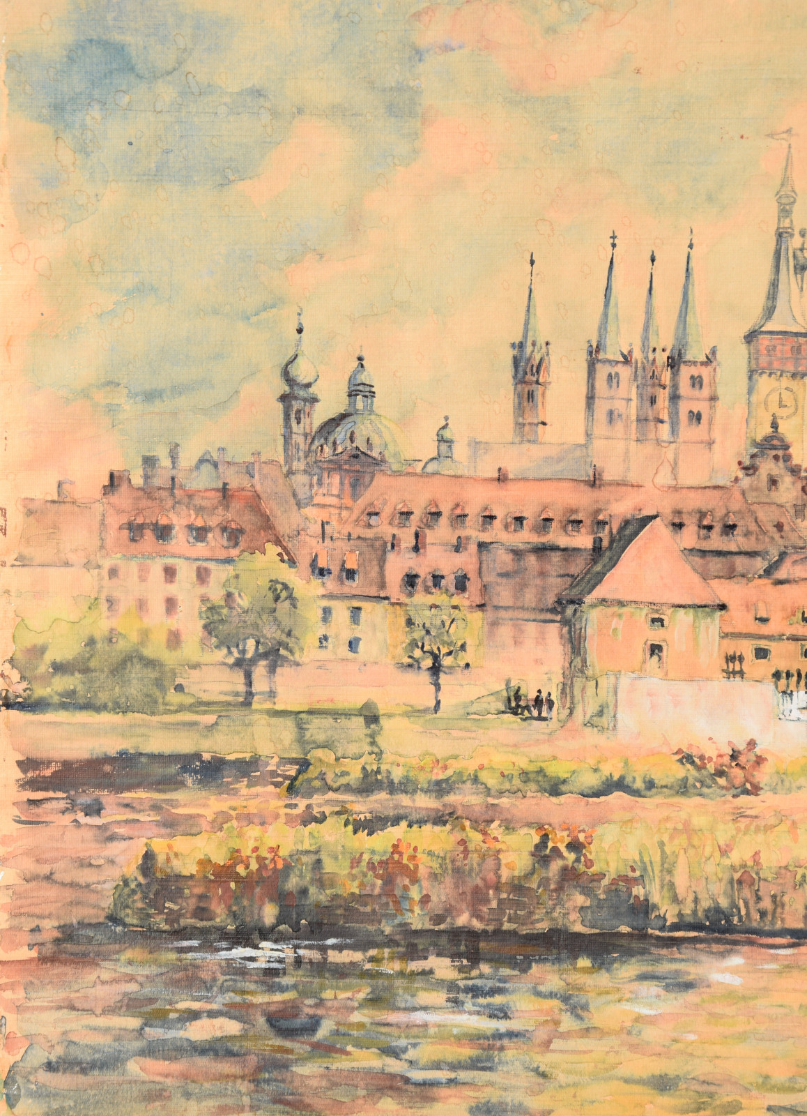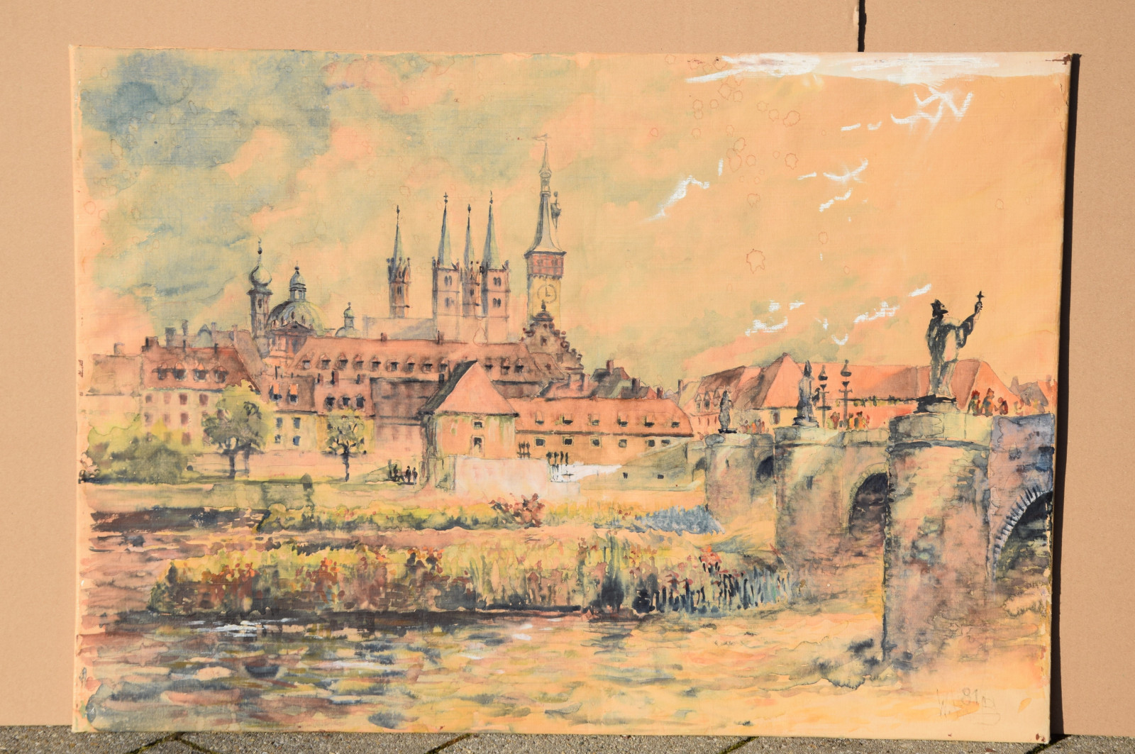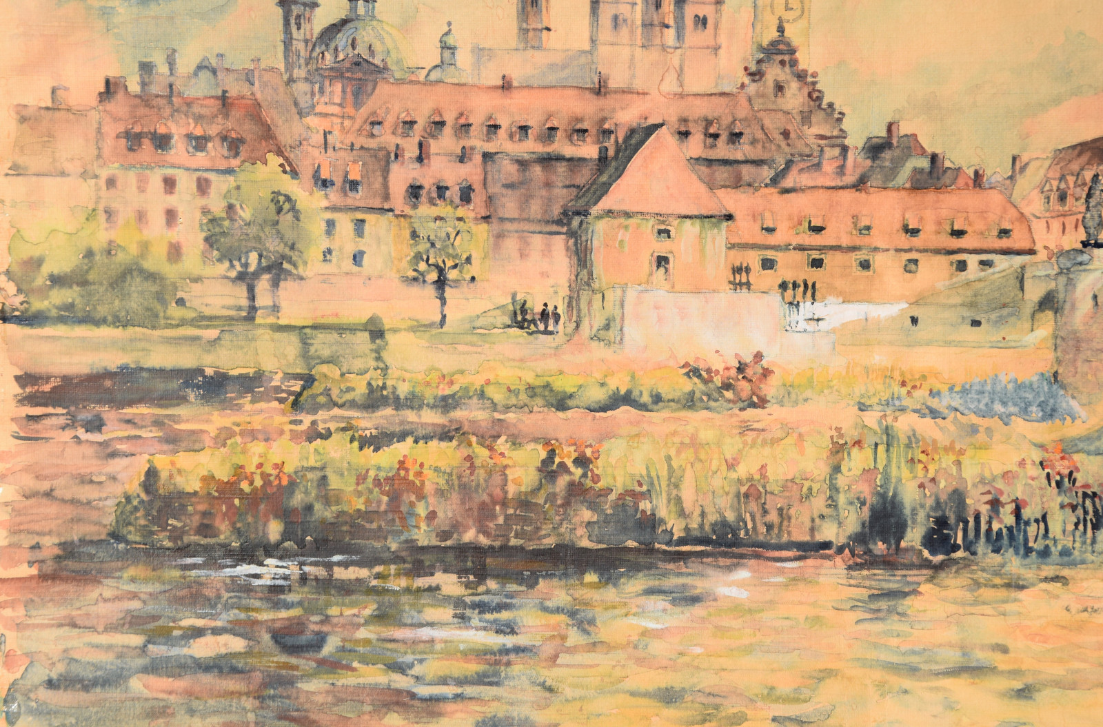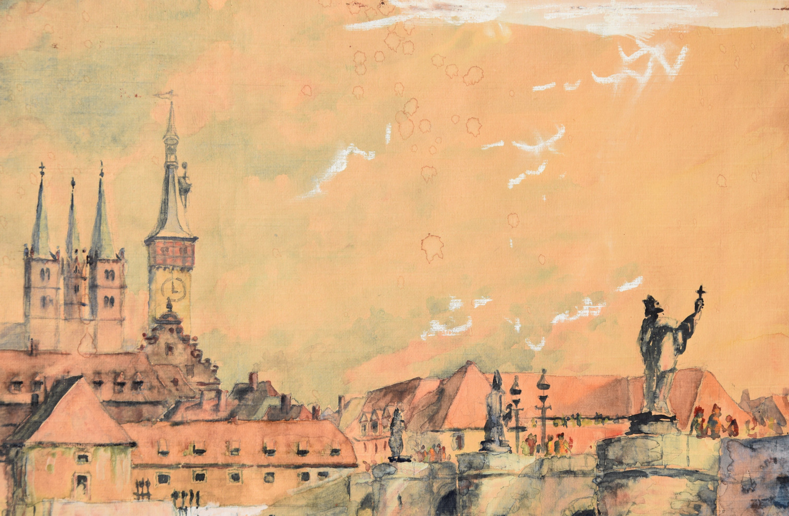 „Stadt am Fluss I“ [so verso auf Etikett handschriftlich betitelt, Blick auf Würzburg mit u. a. Alter Mainbrücke, Neumünster, Dom]