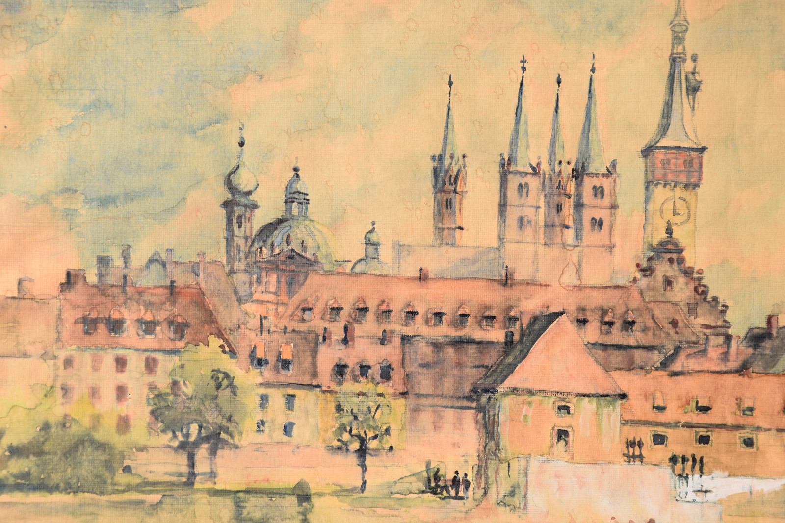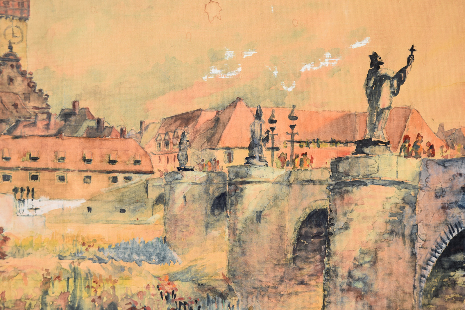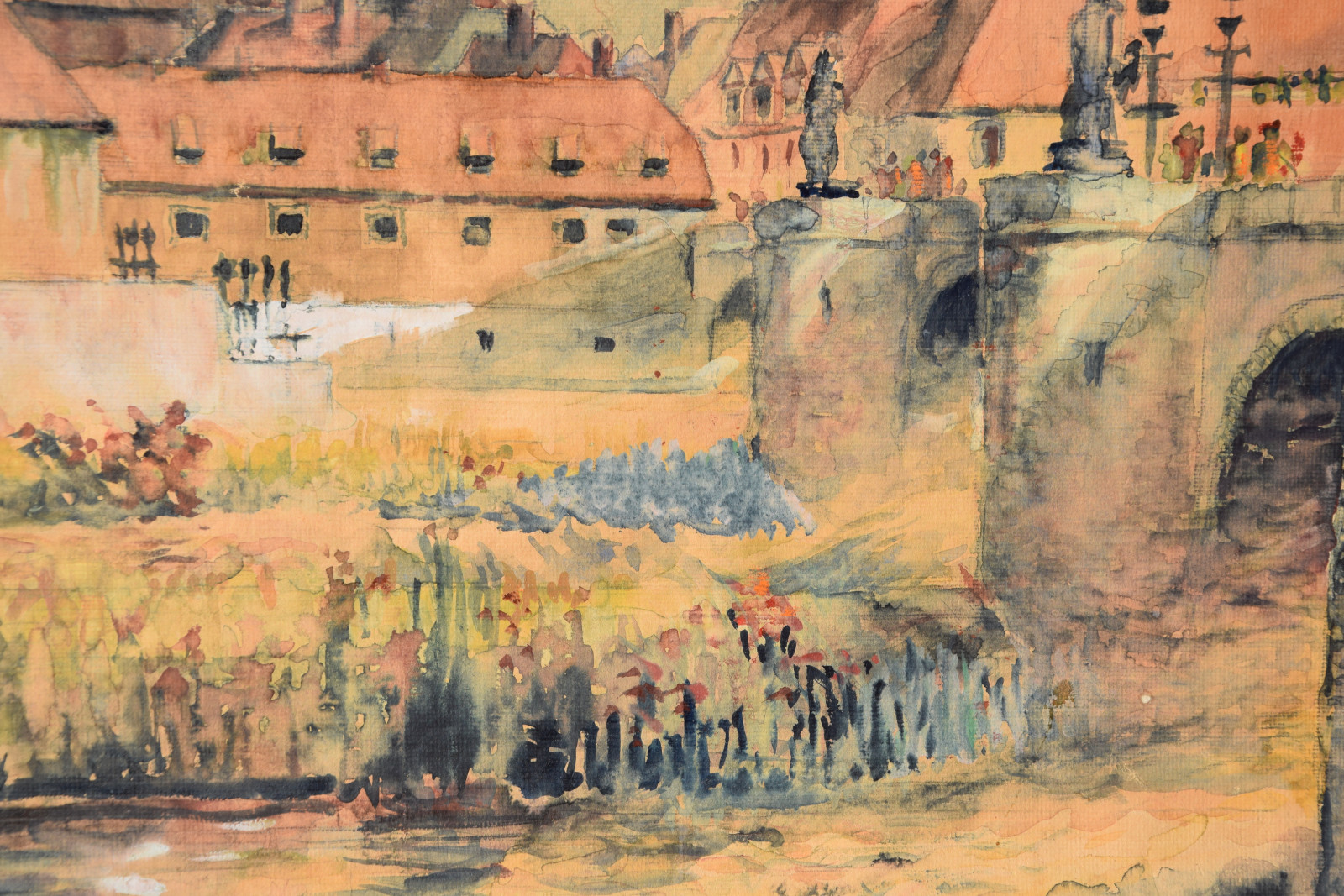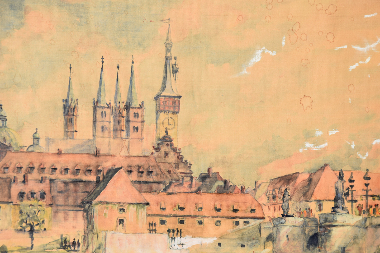 „Stadt am Fluss I“ [so verso auf Etikett handschriftlich betitelt, Blick auf Würzburg mit u. a. Alter Mainbrücke, Neumünster, Dom]