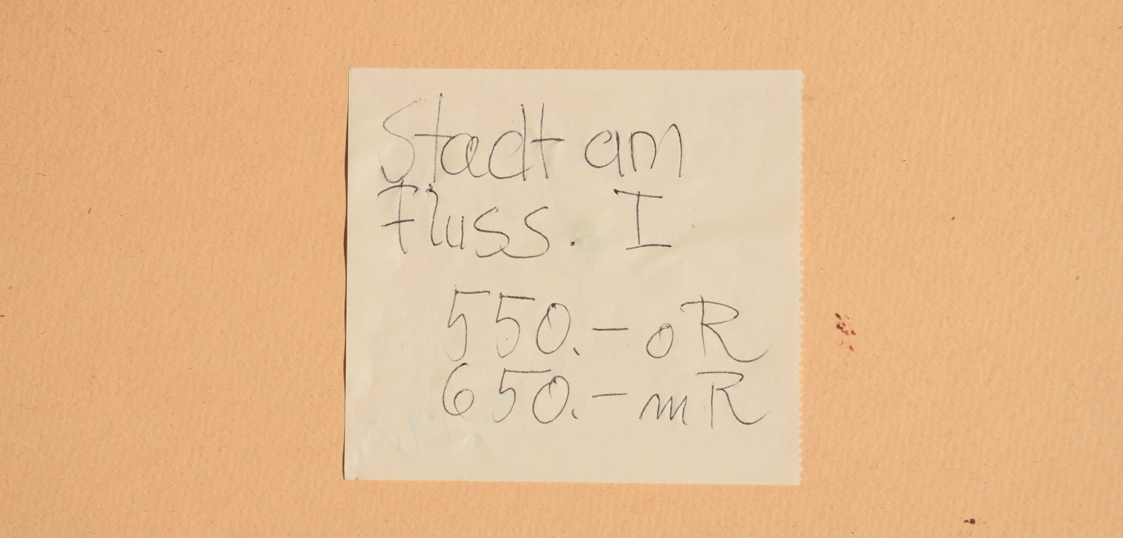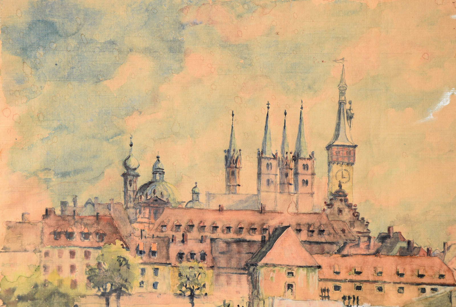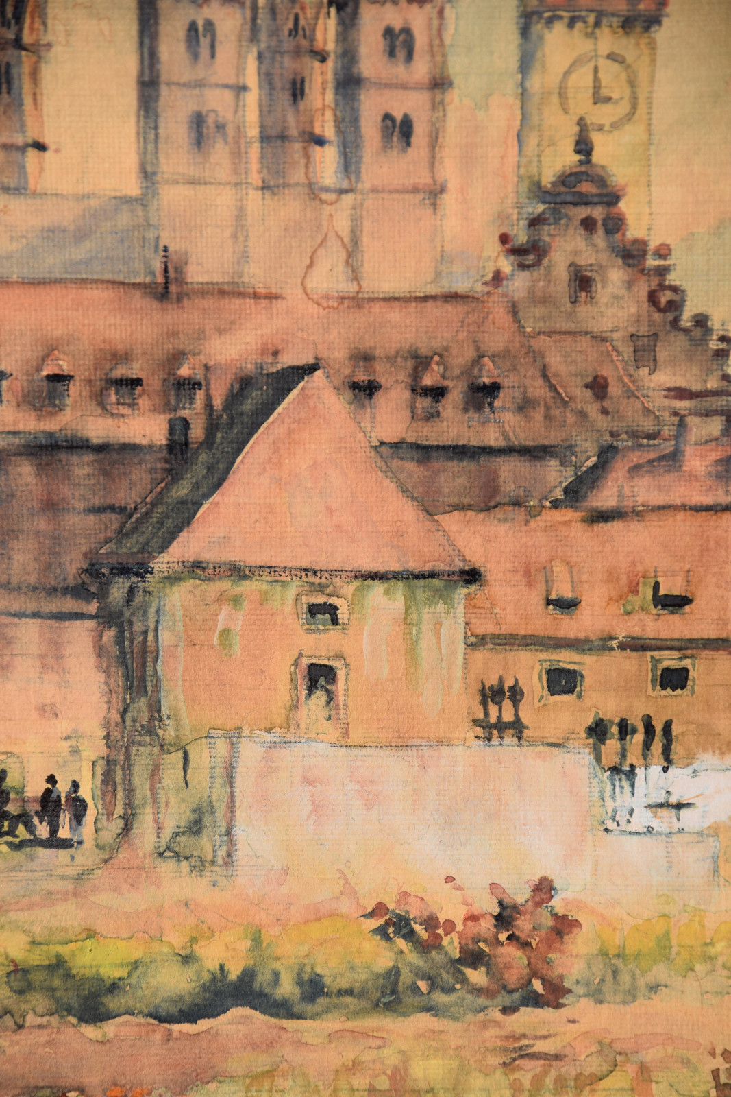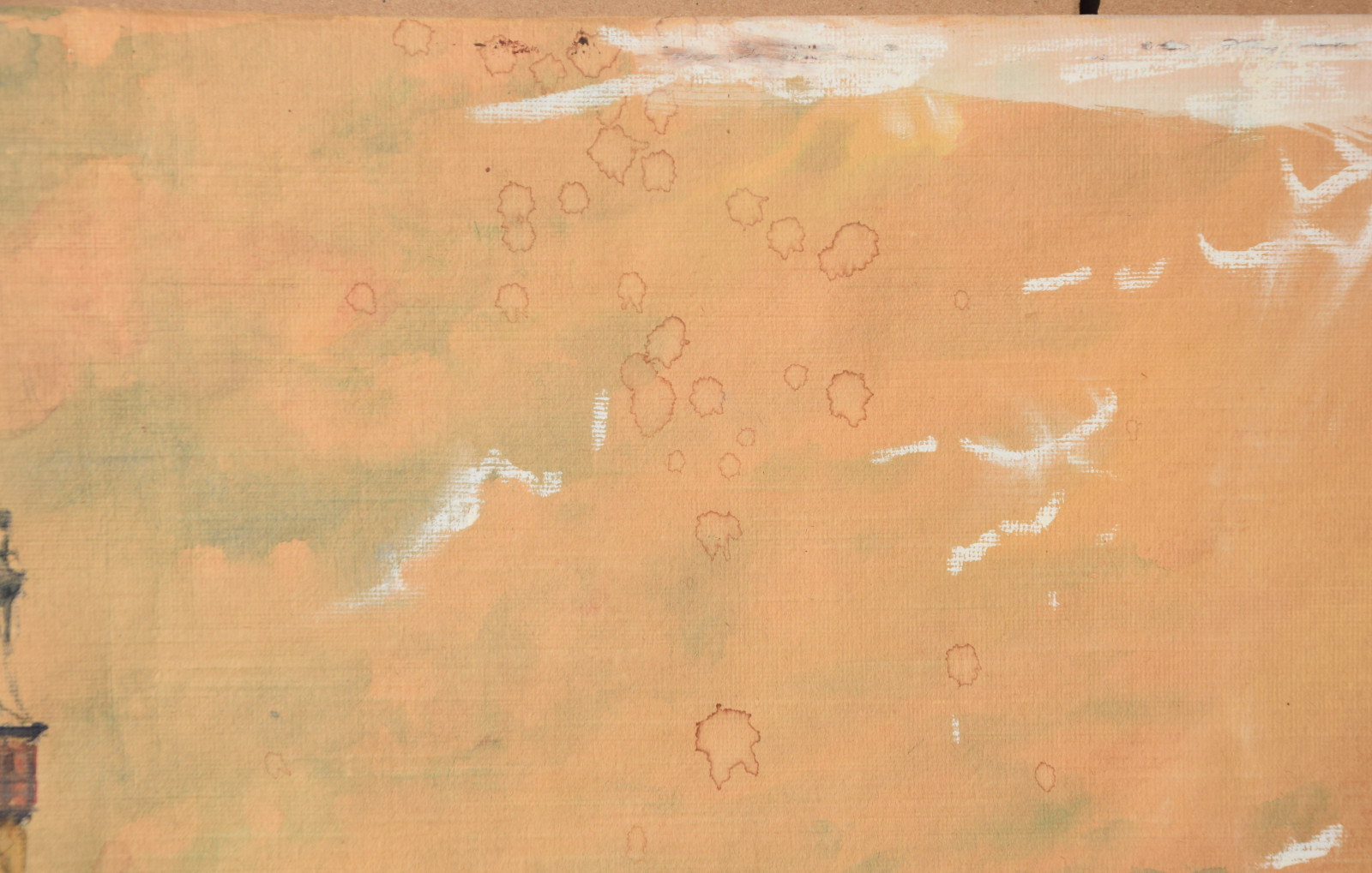 Papier vom Künstler umgeschlagen über Karton und dort mit Klebestreifen nicht säurefrei befestigt; im oberen Blattbereich (in den Himmelspartien) mehrere Feuchtigkeitsschäden (tropfenförmig; im Bereich oben rechts etwas deutlicher sichtbar); Ecken bestoßen und kleine Einrisse; Papier insgesamt leicht nachgedunkelt