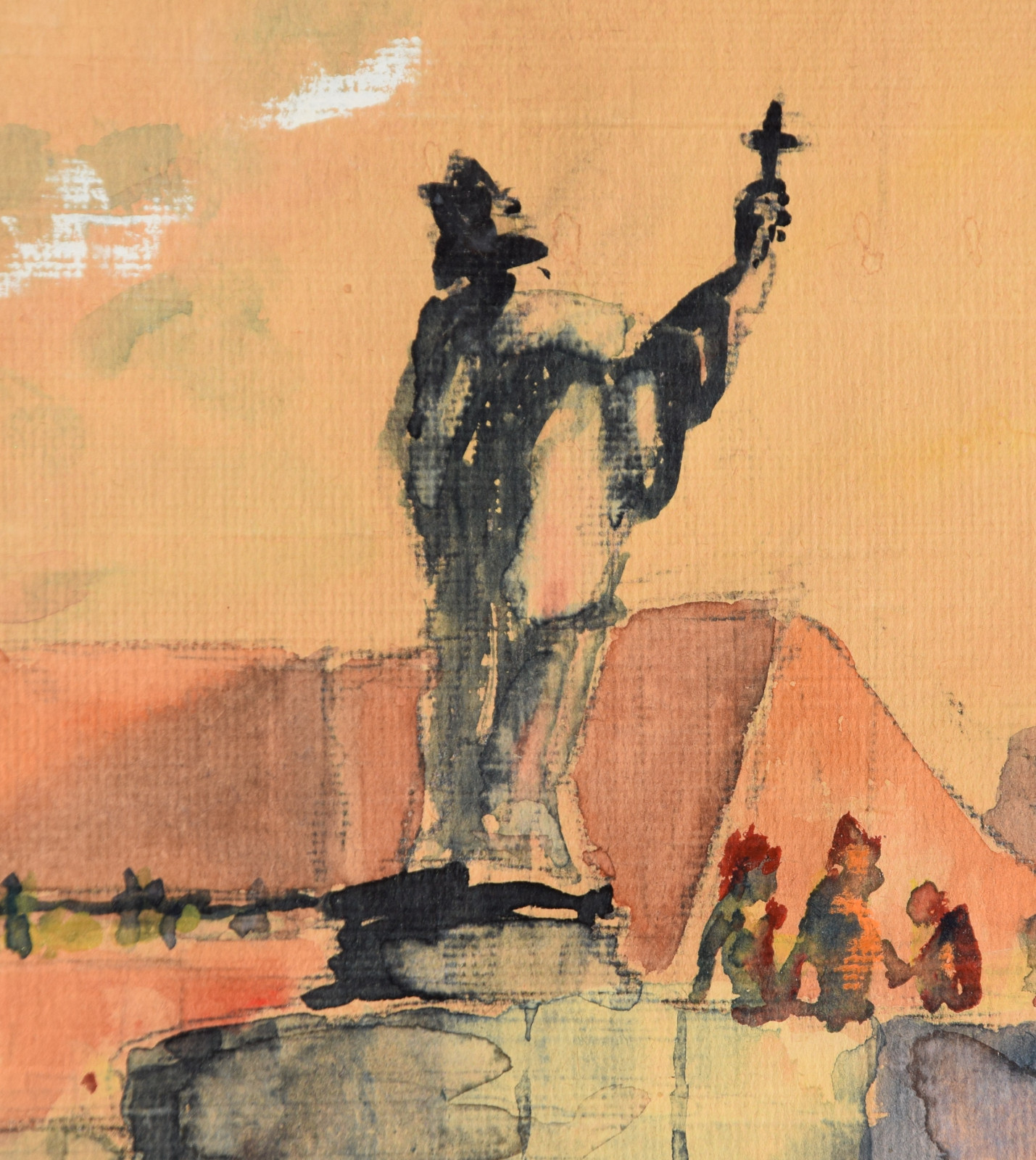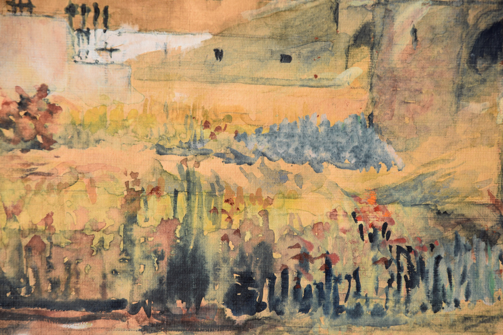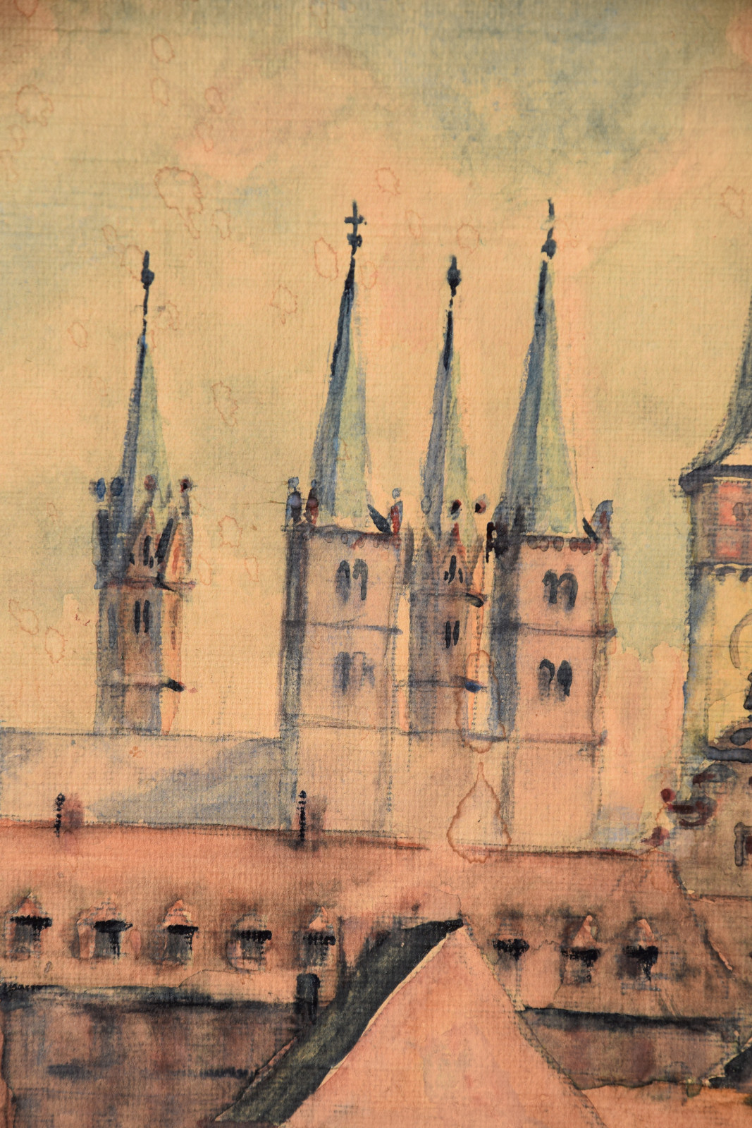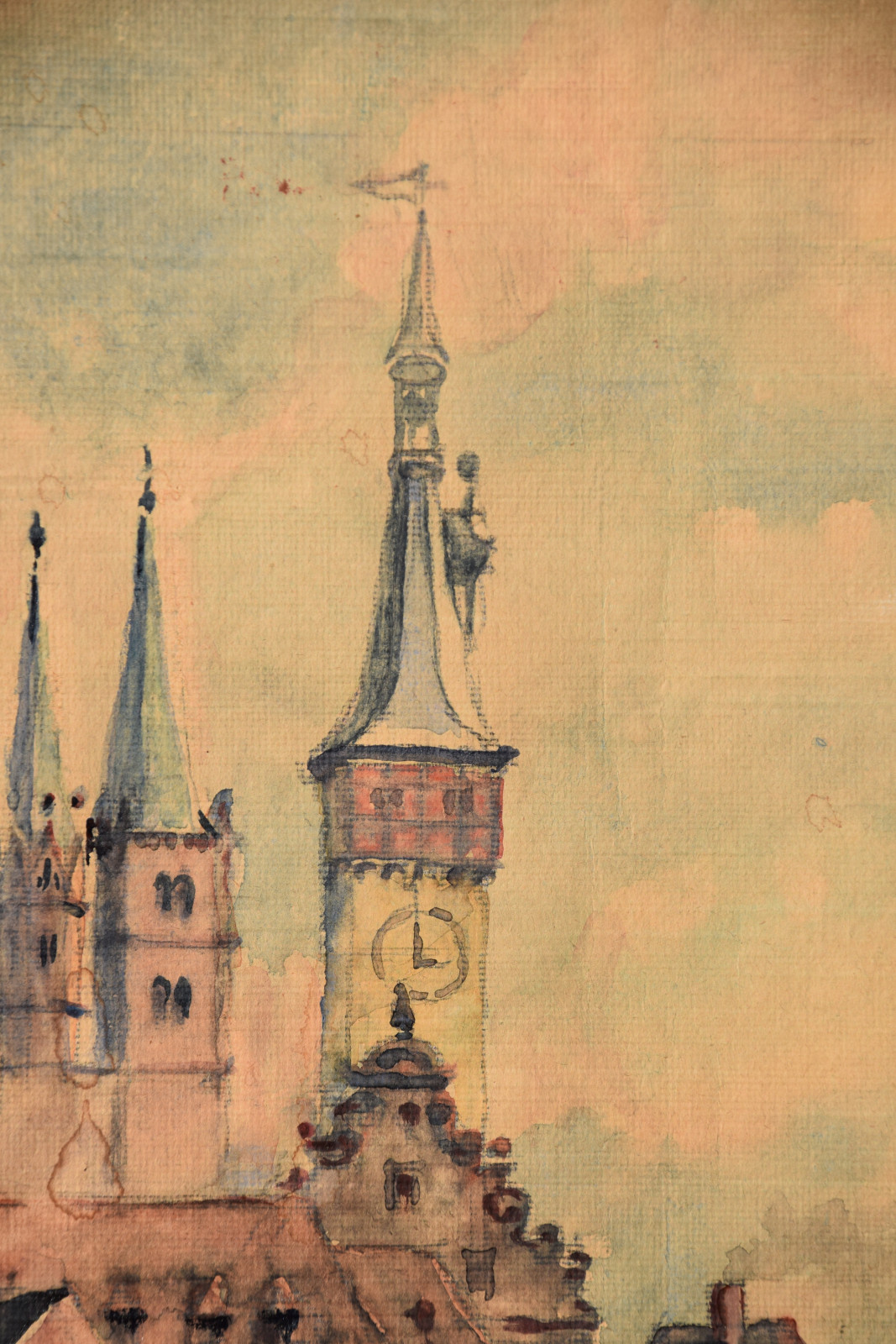 Papier vom Künstler umgeschlagen über Karton und dort mit Klebestreifen nicht säurefrei befestigt; im oberen Blattbereich (in den Himmelspartien) mehrere Feuchtigkeitsschäden (tropfenförmig; im Bereich oben rechts etwas deutlicher sichtbar); Ecken bestoßen und kleine Einrisse; Papier insgesamt leicht nachgedunkelt