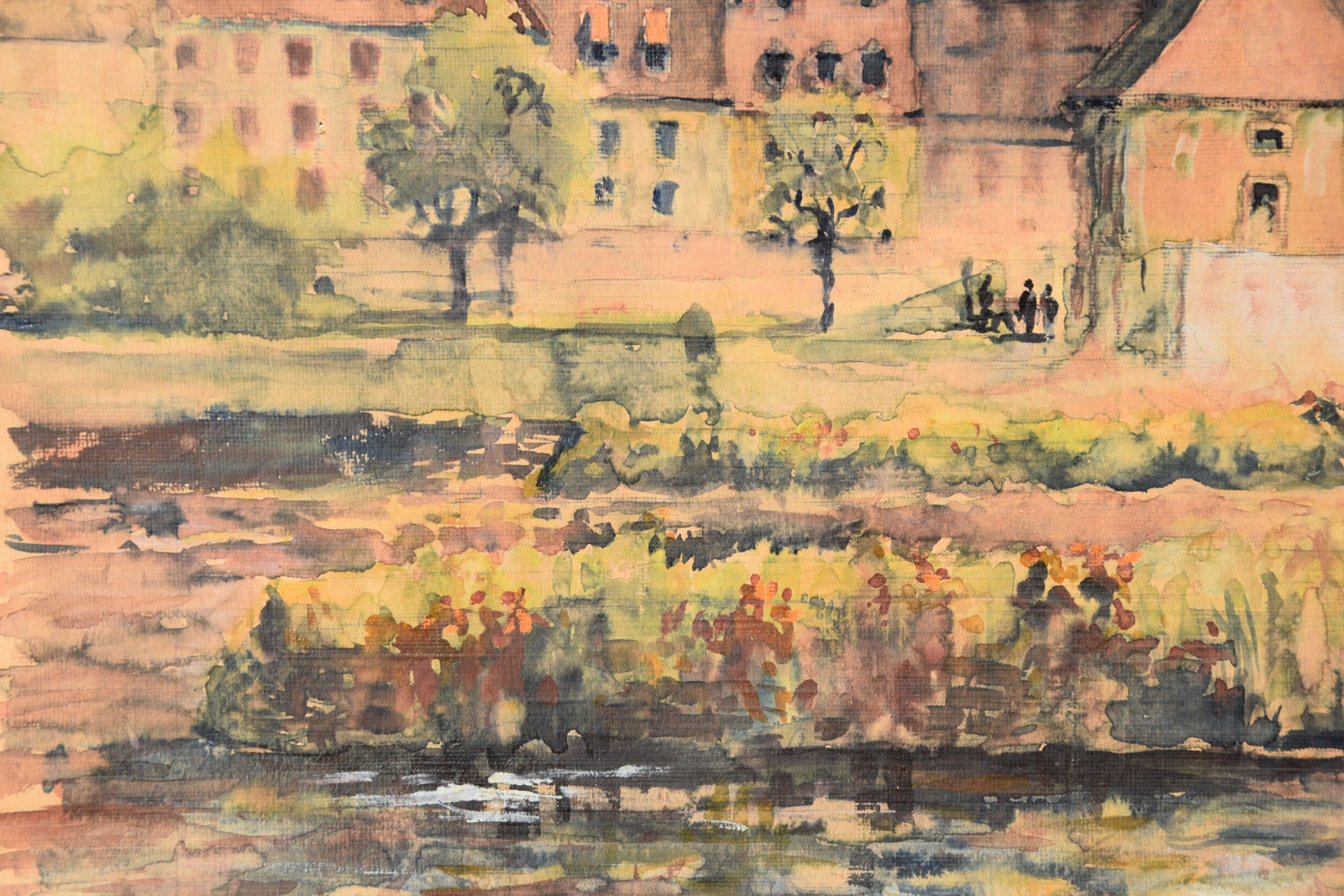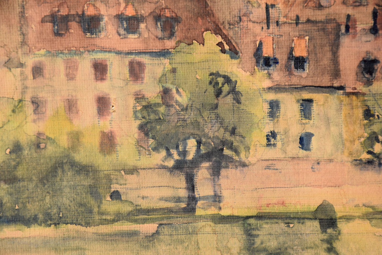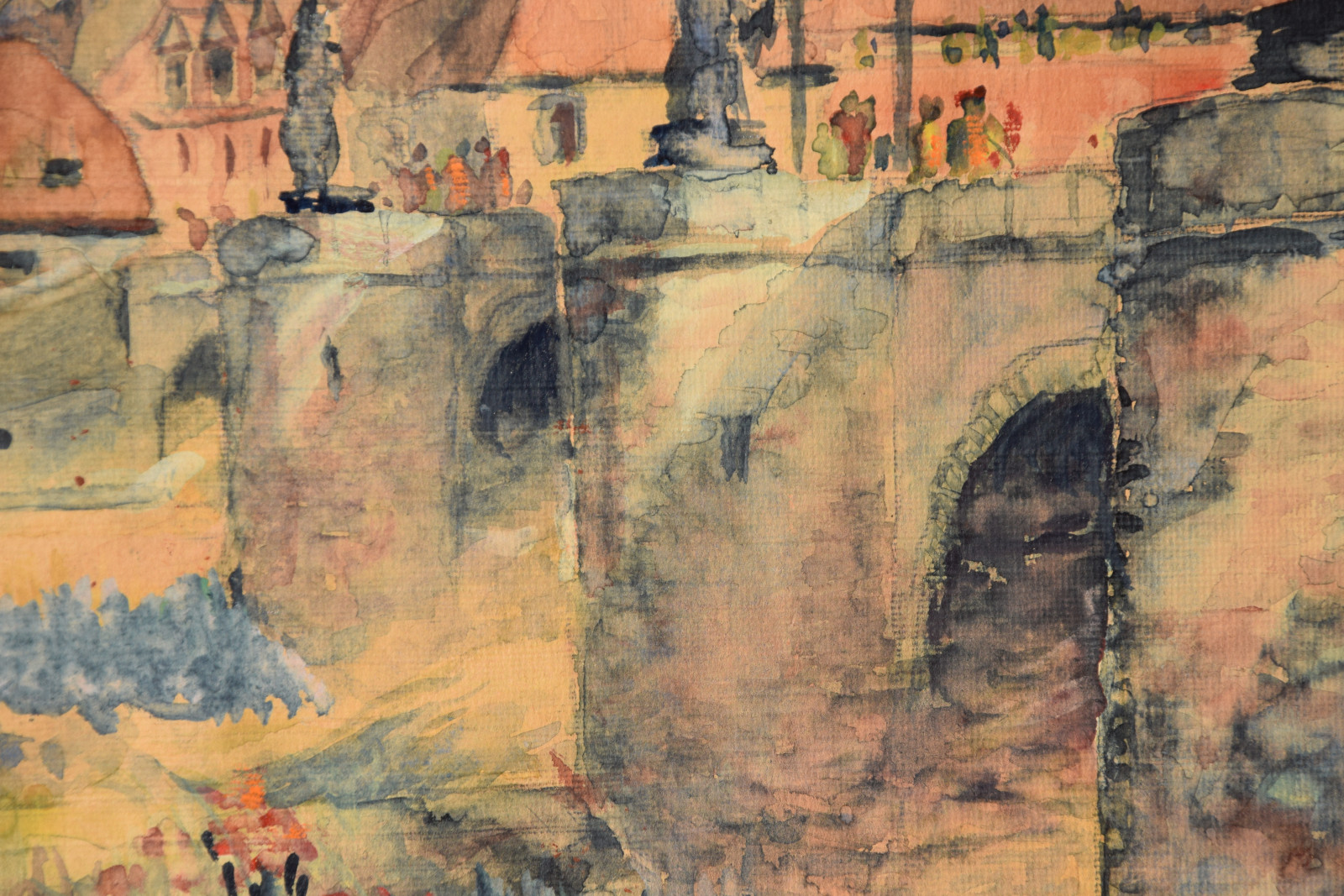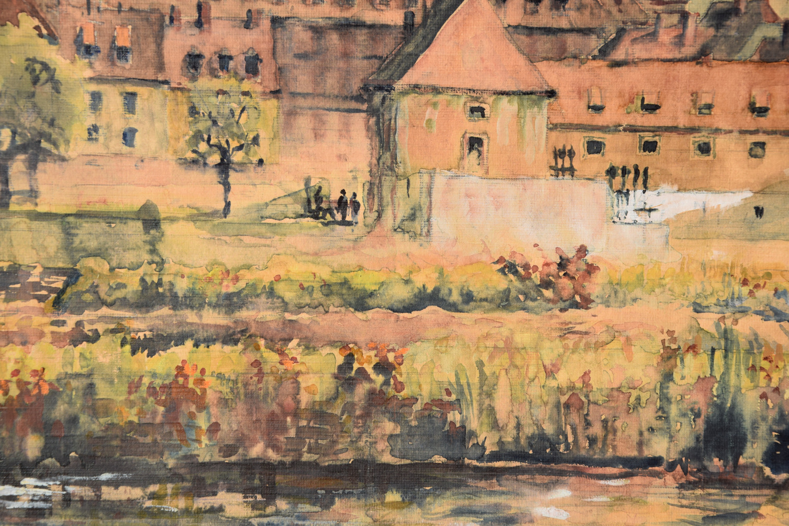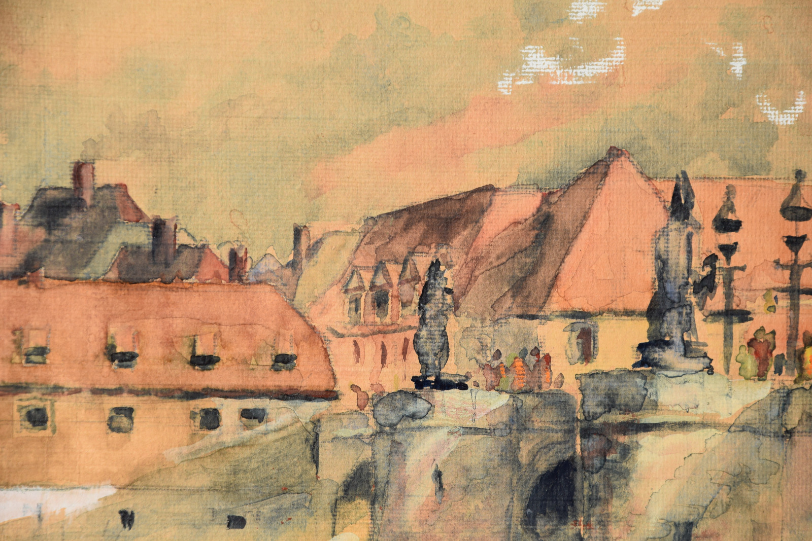 Papier vom Künstler umgeschlagen über Karton und dort mit Klebestreifen nicht säurefrei befestigt; im oberen Blattbereich (in den Himmelspartien) mehrere Feuchtigkeitsschäden (tropfenförmig; im Bereich oben rechts etwas deutlicher sichtbar); Ecken bestoßen und kleine Einrisse; Papier insgesamt leicht nachgedunkelt