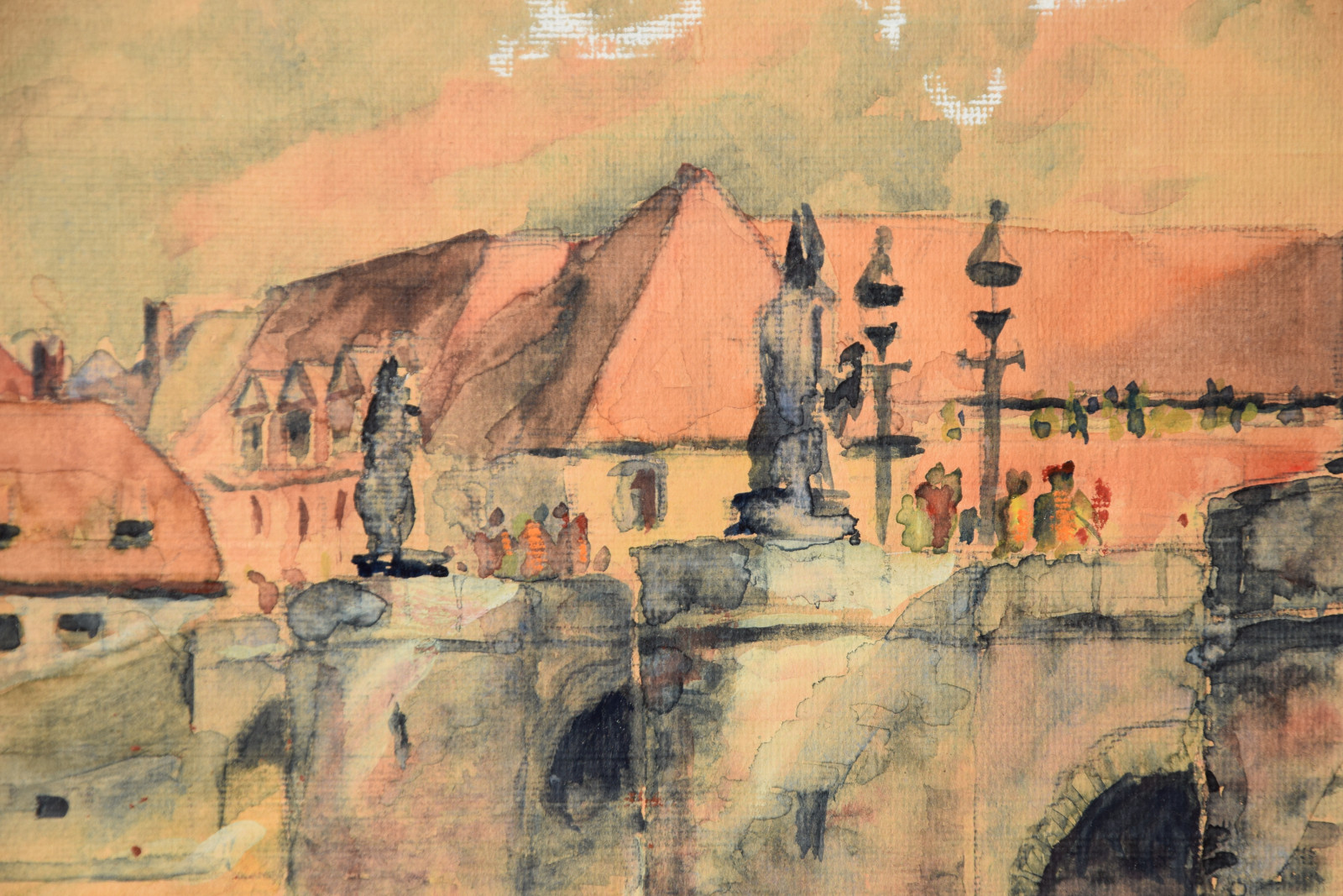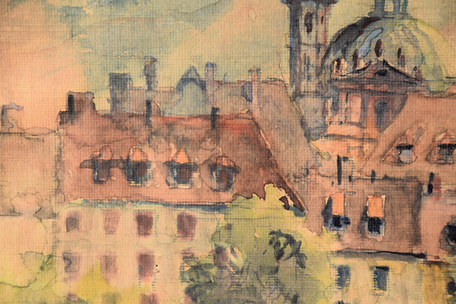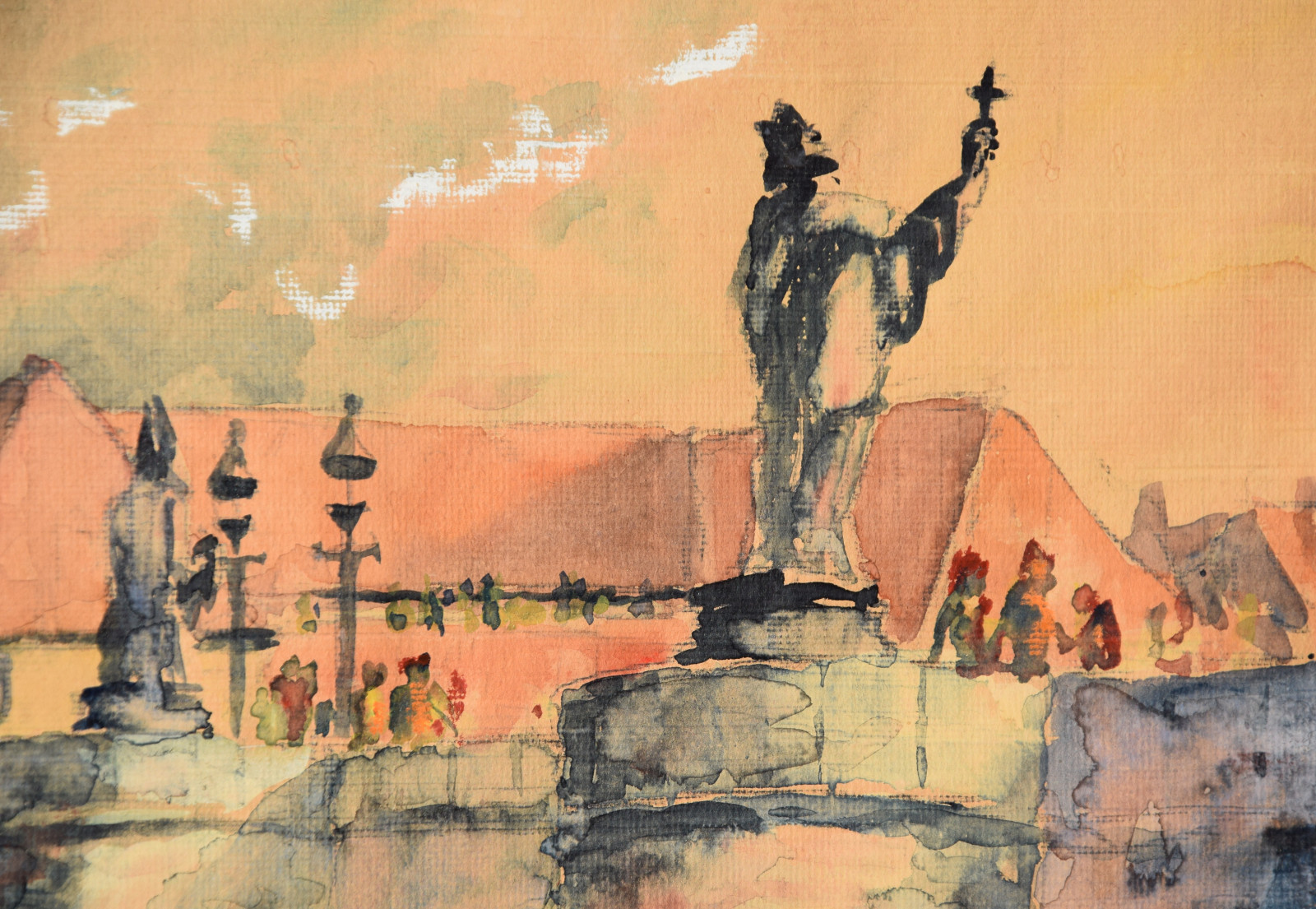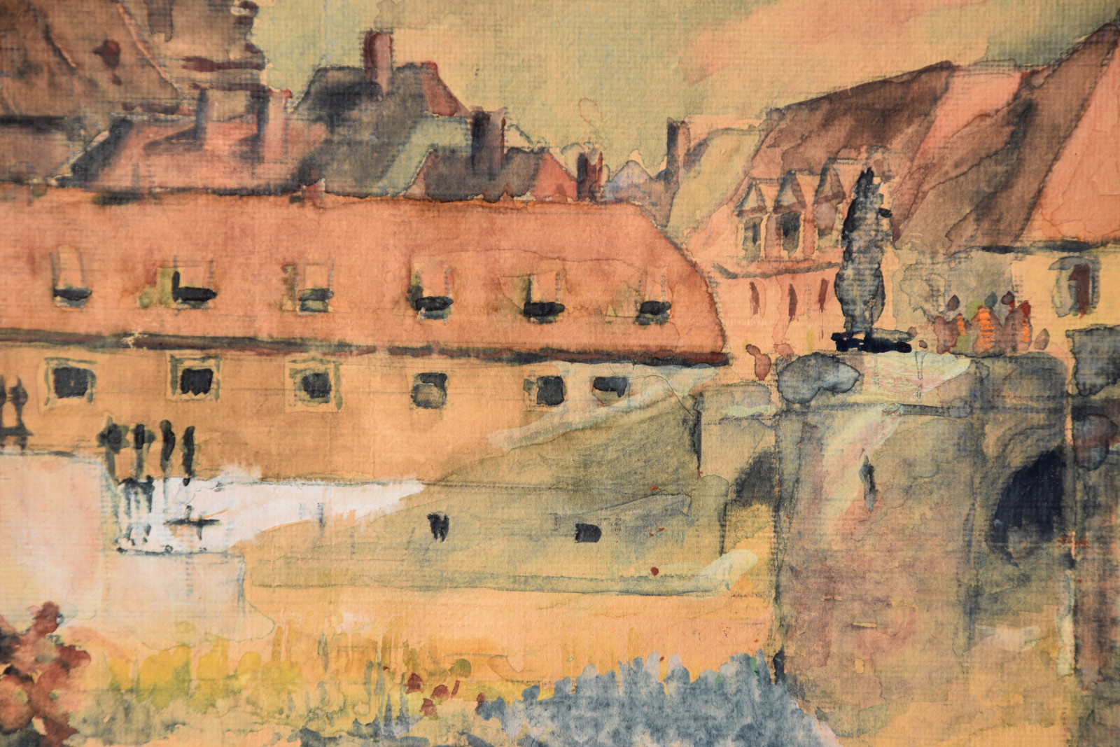 Papier vom Künstler umgeschlagen über Karton und dort mit Klebestreifen nicht säurefrei befestigt; im oberen Blattbereich (in den Himmelspartien) mehrere Feuchtigkeitsschäden (tropfenförmig; im Bereich oben rechts etwas deutlicher sichtbar); Ecken bestoßen und kleine Einrisse; Papier insgesamt leicht nachgedunkelt