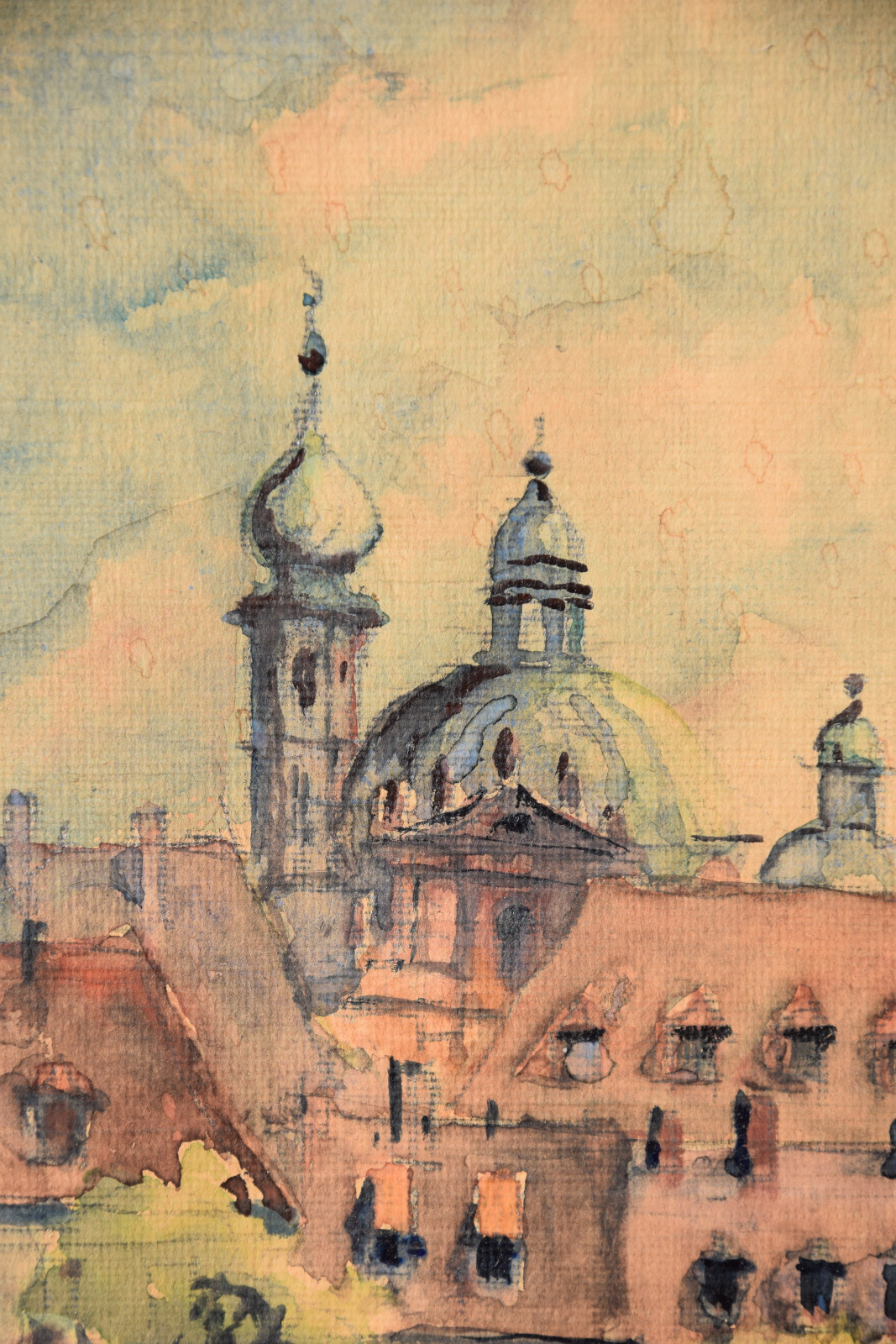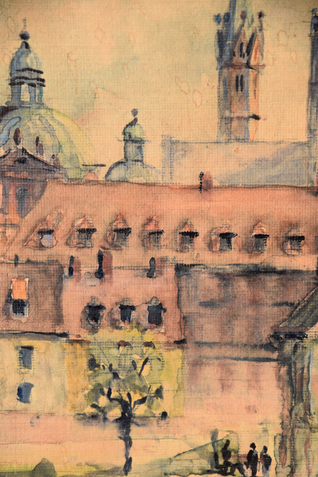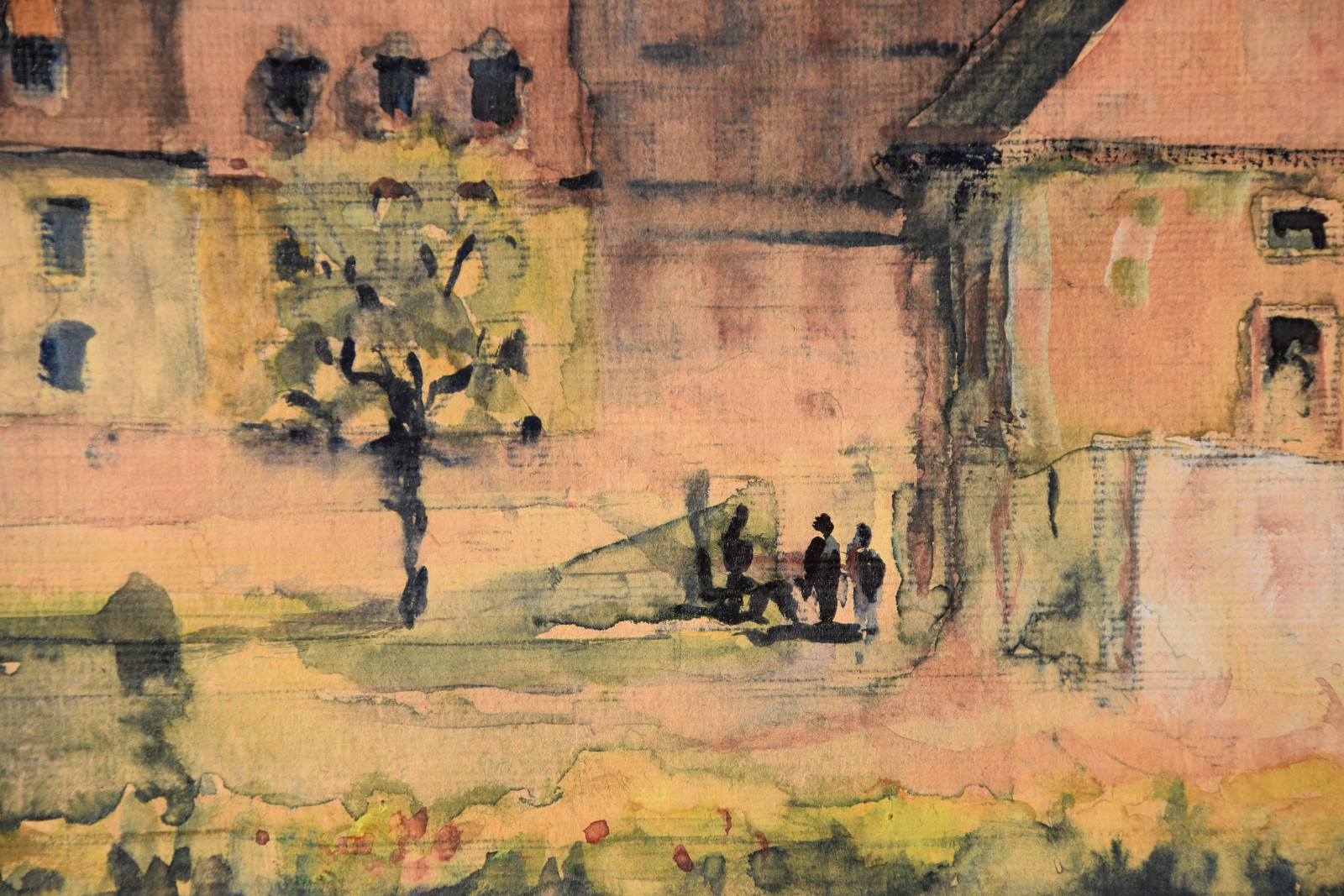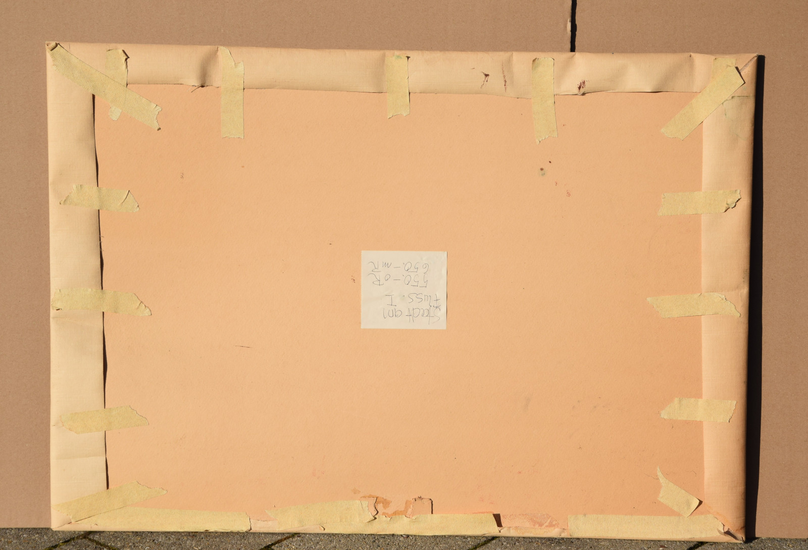 Papier vom Künstler umgeschlagen über Karton und dort mit Klebestreifen nicht säurefrei befestigt; im oberen Blattbereich (in den Himmelspartien) mehrere Feuchtigkeitsschäden (tropfenförmig; im Bereich oben rechts etwas deutlicher sichtbar); Ecken bestoßen und kleine Einrisse; Papier insgesamt leicht nachgedunkelt