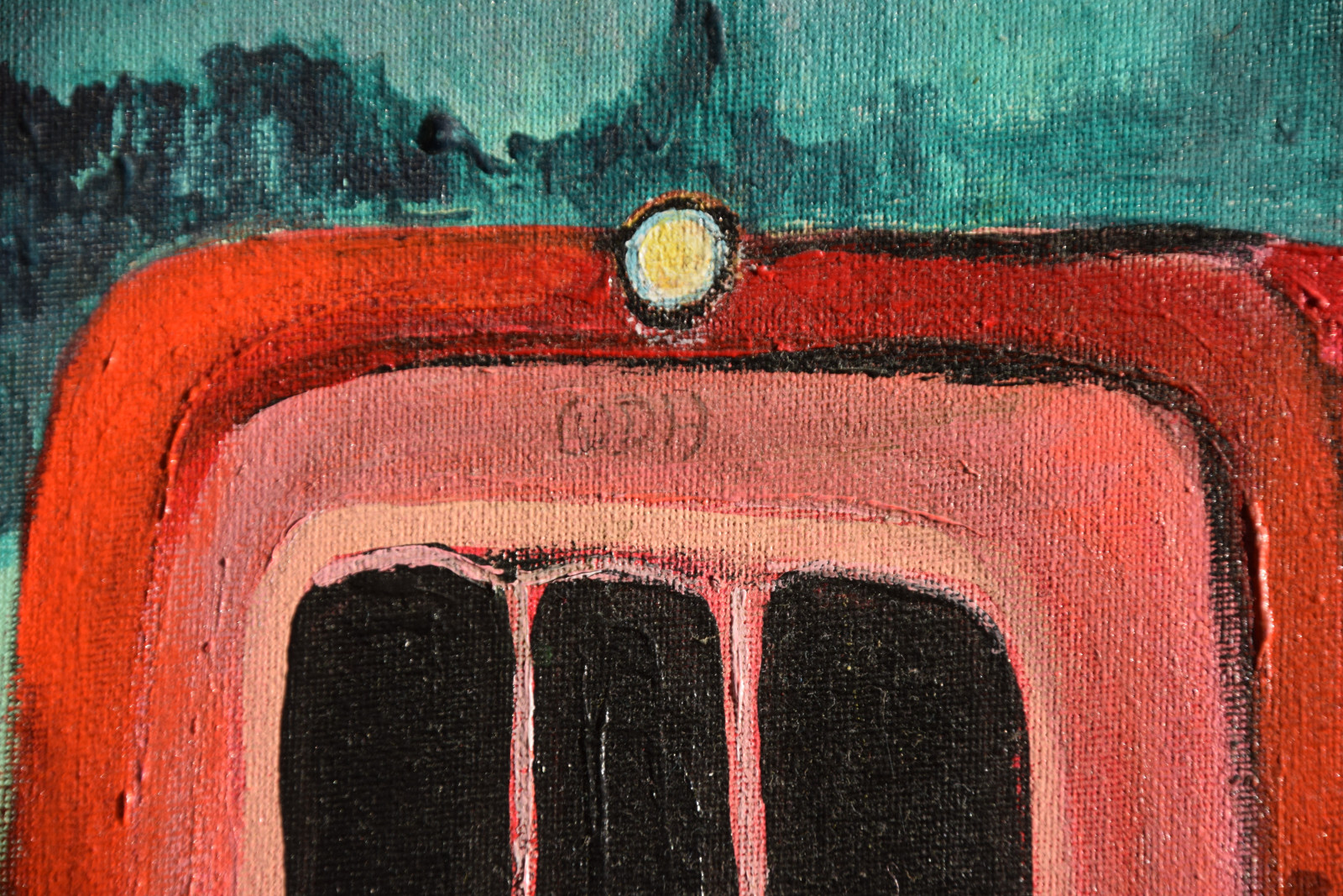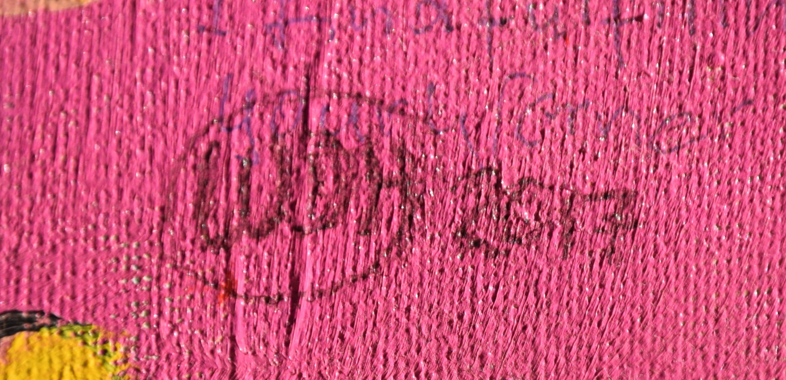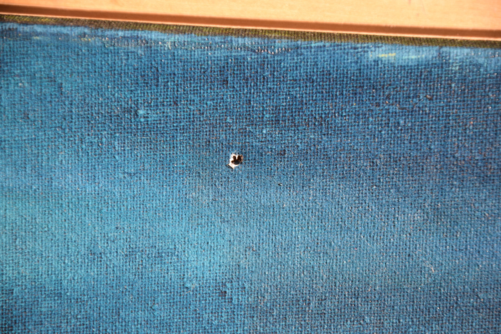 Leinwandränder leicht berieben; im Bereich oben links sehr kleines Löchlein in der Leinwand (etwa 2x2mm); im unteren Bereich rechts (etwas links der gelben Punkte) sehr kleine Beschädigung der Leinwand (etwa 1x1mm)