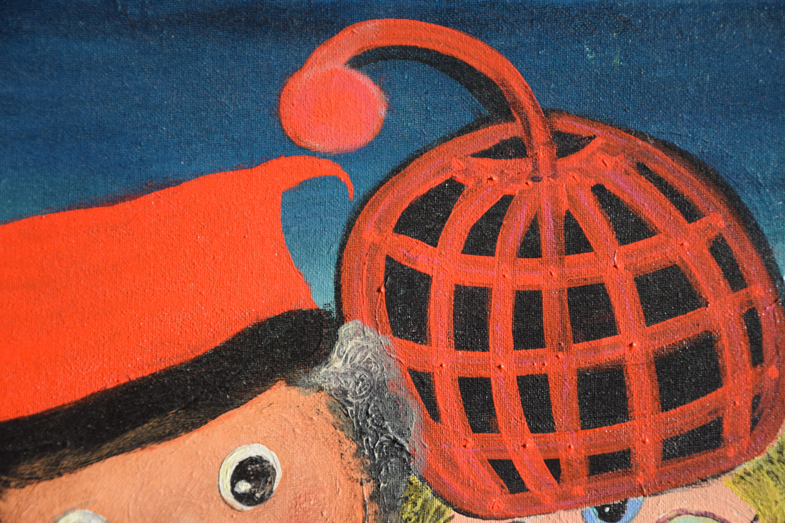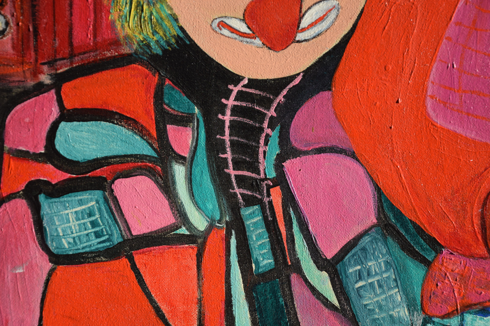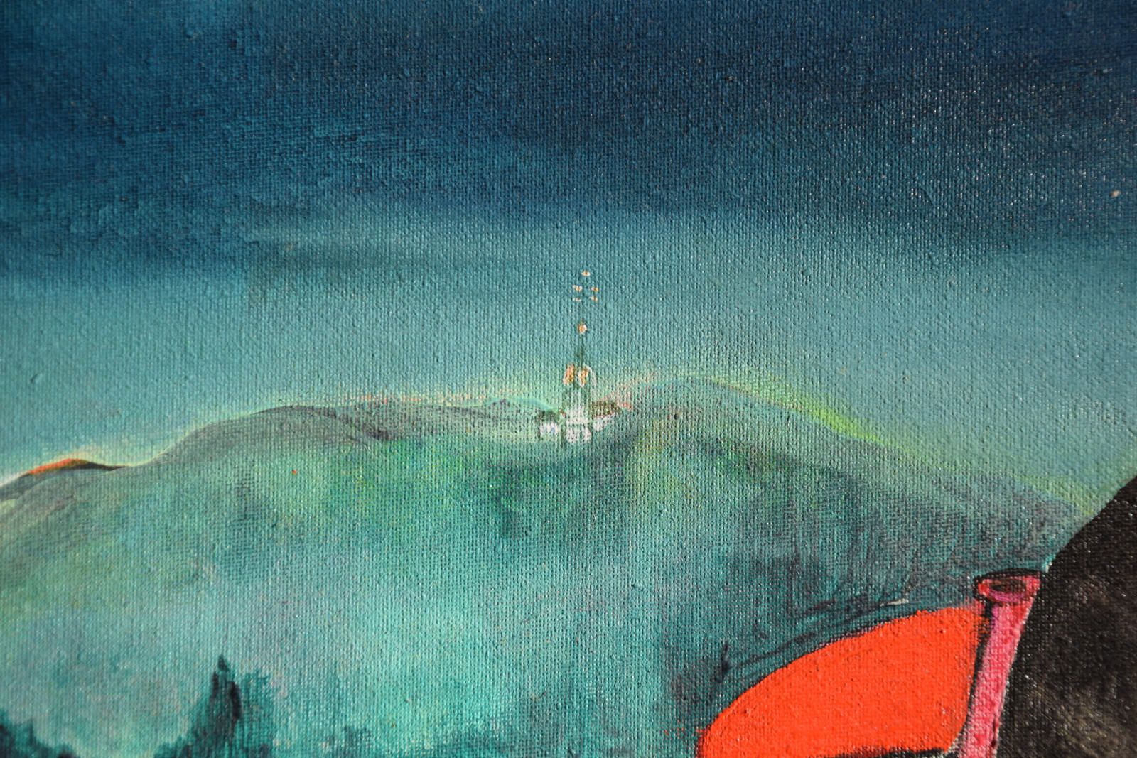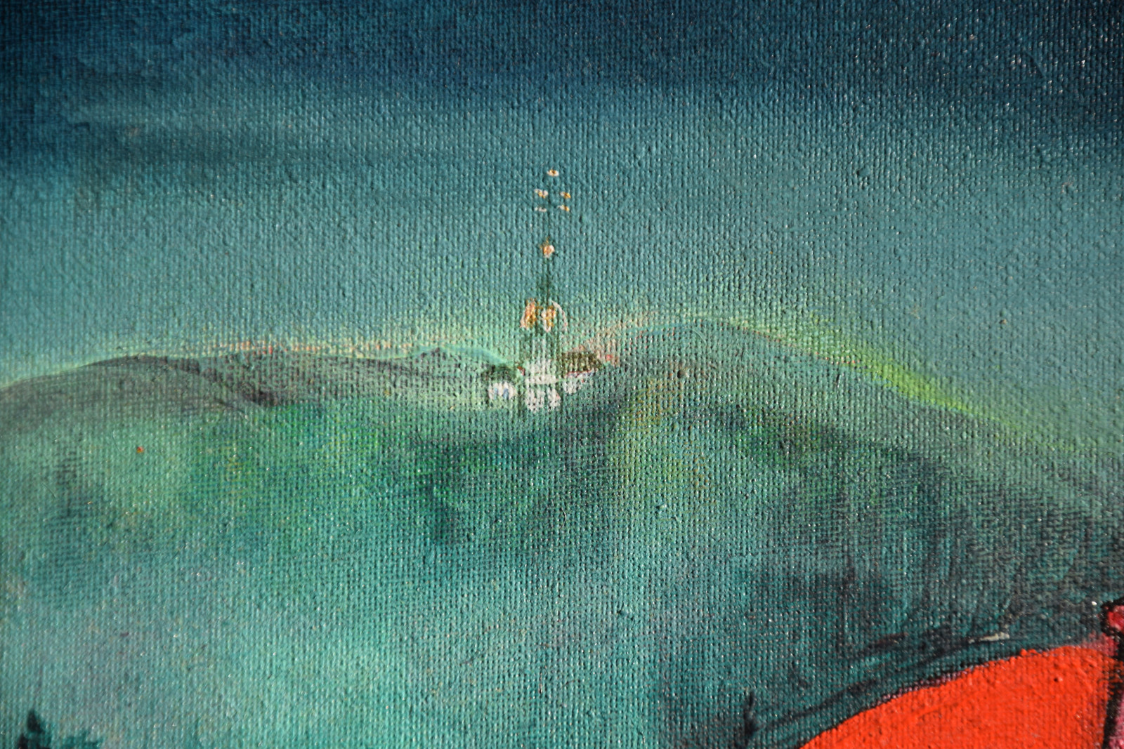 Leinwandränder leicht berieben; im Bereich oben links sehr kleines Löchlein in der Leinwand (etwa 2x2mm); im unteren Bereich rechts (etwas links der gelben Punkte) sehr kleine Beschädigung der Leinwand (etwa 1x1mm)