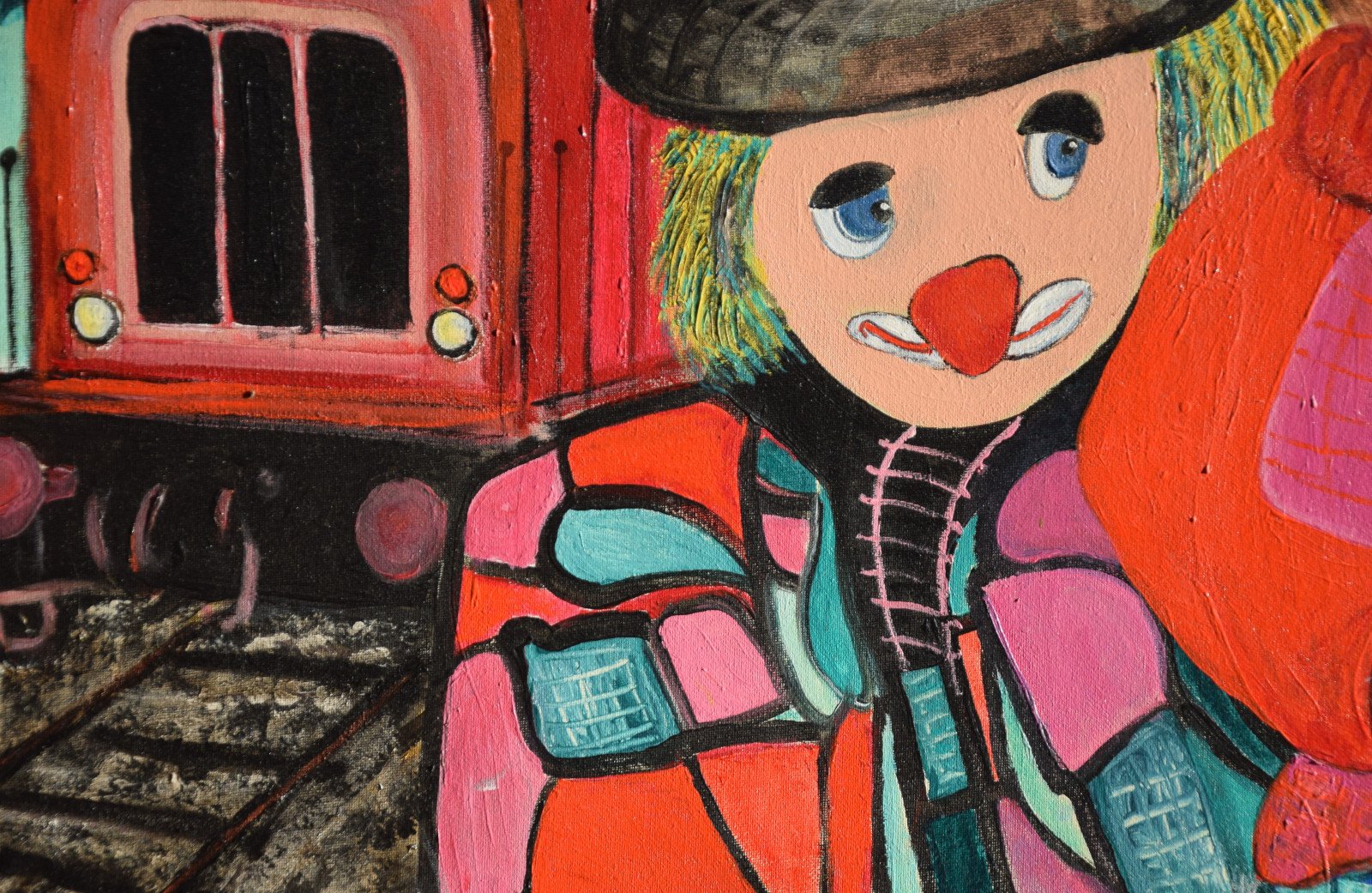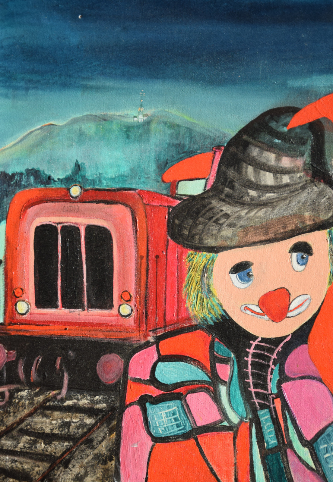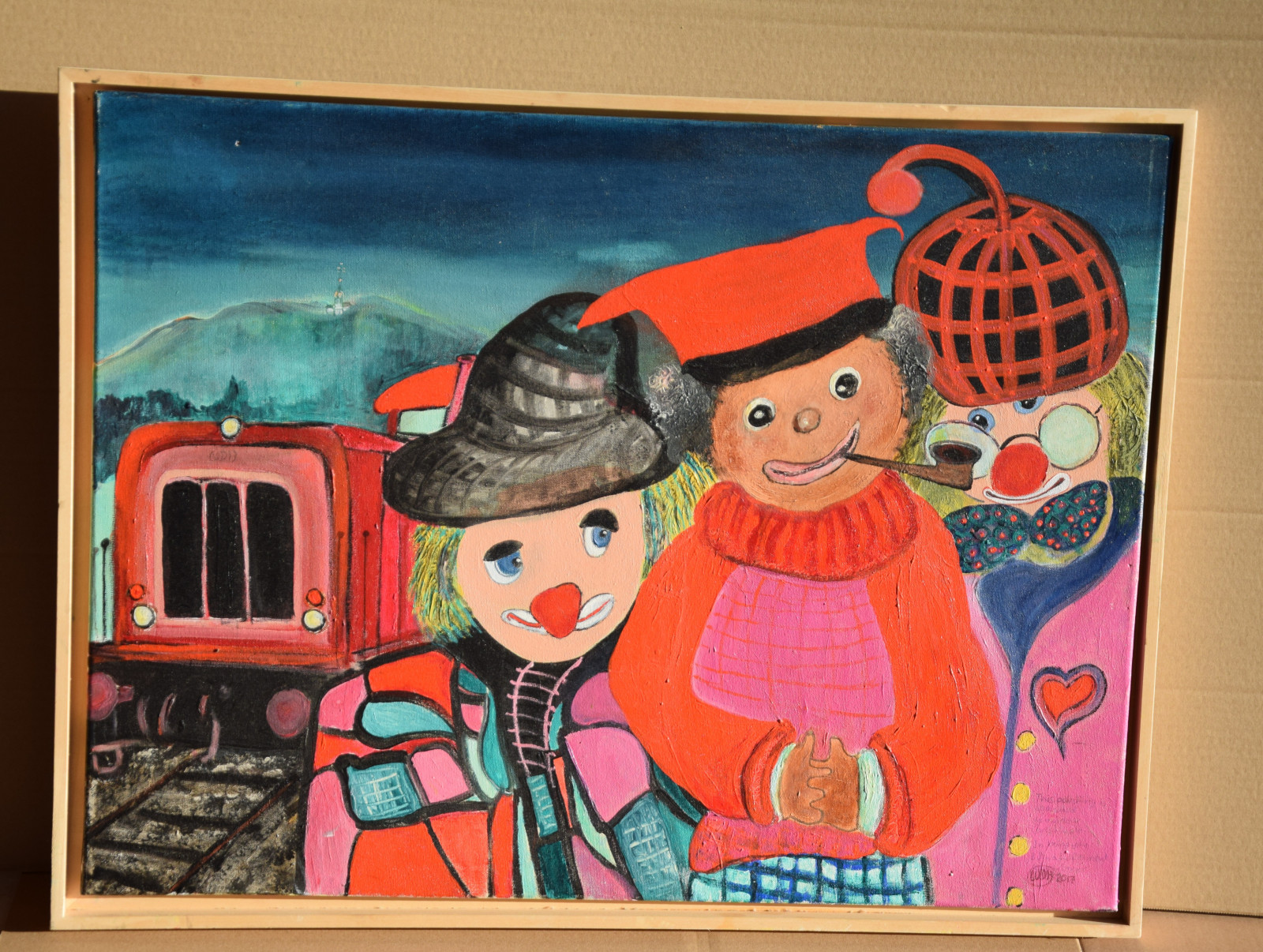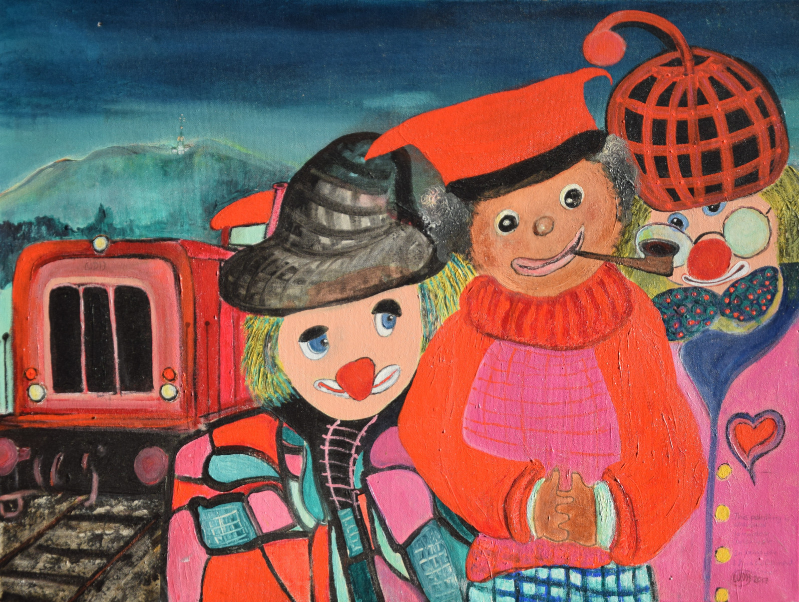 unten rechts monogrammiert „WDH“, sowie links mittig (auf der Eisenbahn) nochmals monogrammiert, sowie ebenso unten rechts am Ende der Widmung signiert „Werner“, sowie verso auf Etikett der „Querschnitt“-Jahresausstellung von 2017 mit Künstlernamen bezeichnet