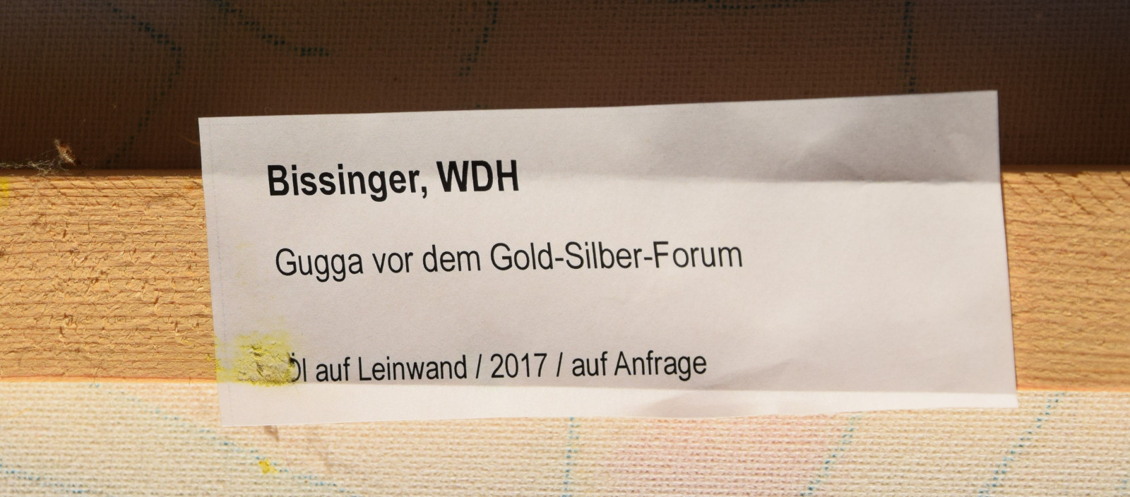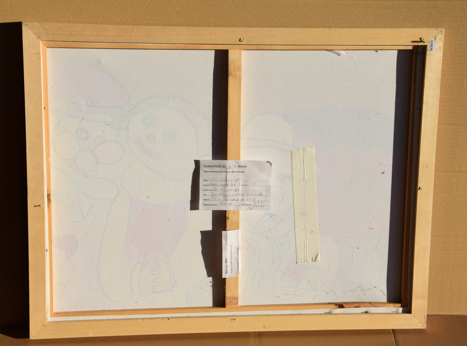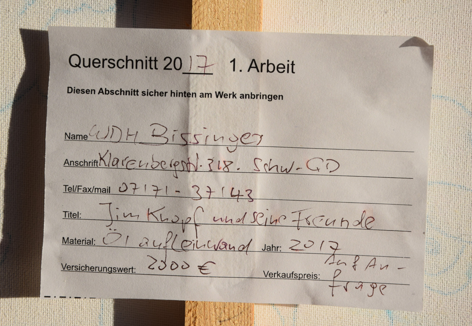 16.12.2017 – 21.01.2018, „Querschnitt“-Jahresausstellung des Gmünder Kunstvereins, Schwäbisch Gmünd [hierzu verso aufgeklebtes und vom Künstler ausgefülltes Etikett mit Angaben zu Adresse, Bildtitel, Technik, Versicherungswert, Verkaufspreis]