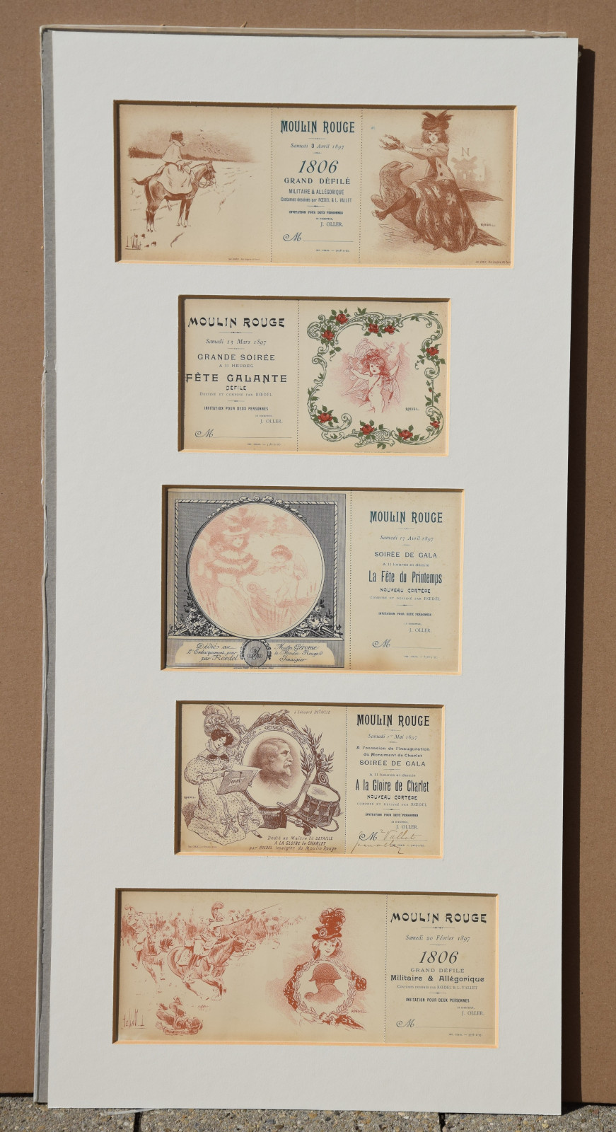 Das vorliegende Quintett ist ein seltenes Set aus (unzerstörten, nicht abgerissenen) Einladungskarten zu „Redoute“-Abenden im „Moulin Rouge“ des Jahres 1897. Solche Ephemera wurden zumeist weggeworfen, nicht aufgehoben oder gar gesammelt. Als eine Ausnahme in diesem Zusammenhang findet sich zumindest eine „Moulin Rouge“-Einladungskarte in der Sammlung des Art Institute of Chicago („Fête du Printemps“ am 13. Juni 1897).