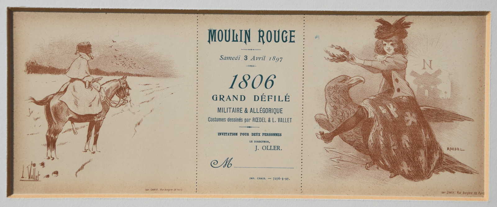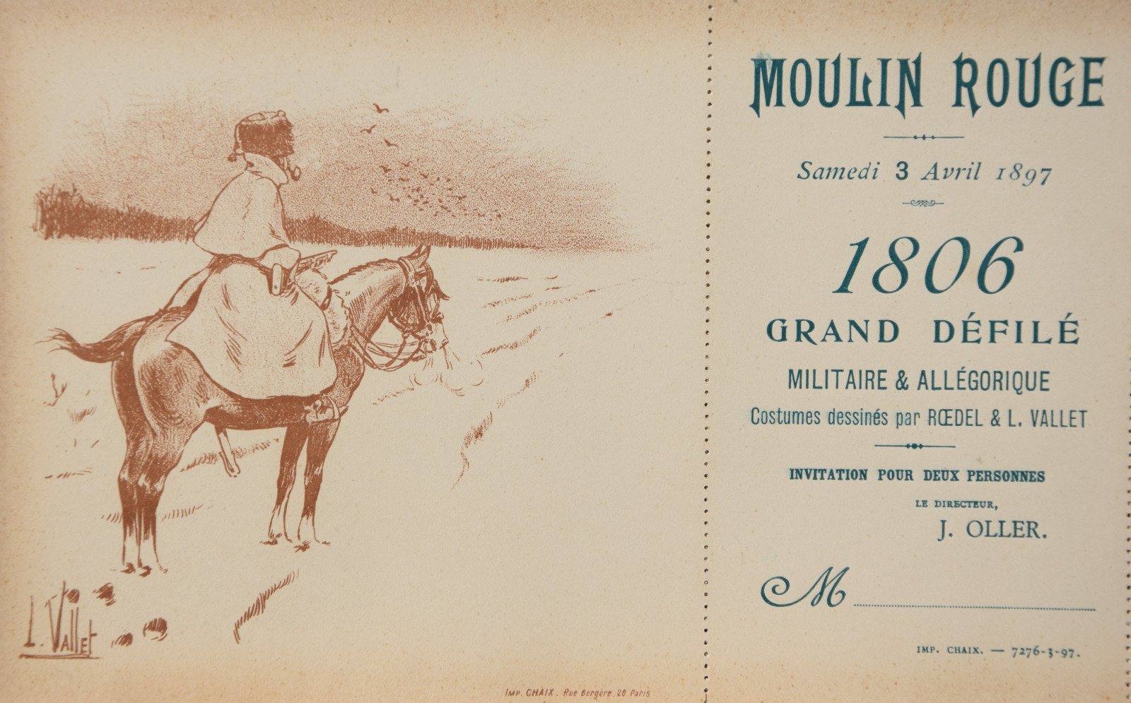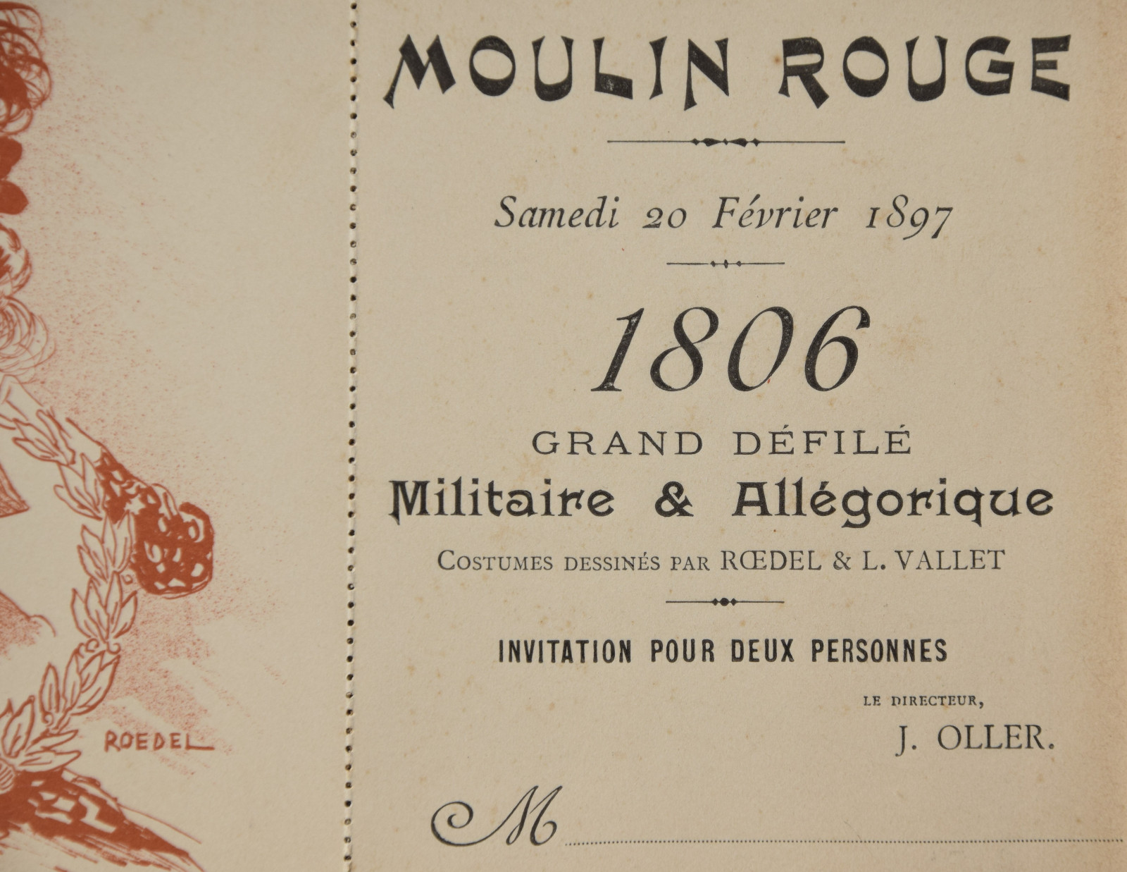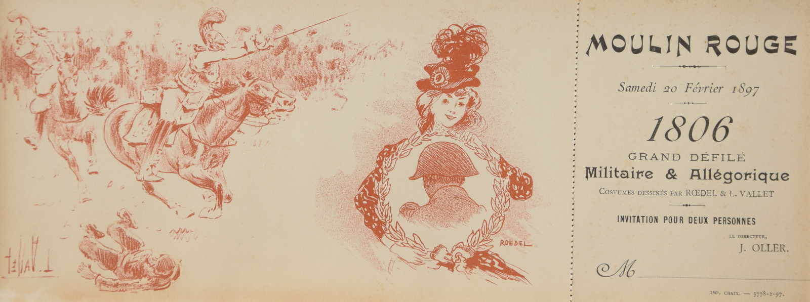 1) „Moulin Rouge. Samedi 20 Février 1897 / 1806 / Grande défilé / Militaire & Allégorique / Costumes dessinés par Roedel & L. Vallet – Invitation pir deux Personnes. / Le Directeur, / J. Oller [2].“