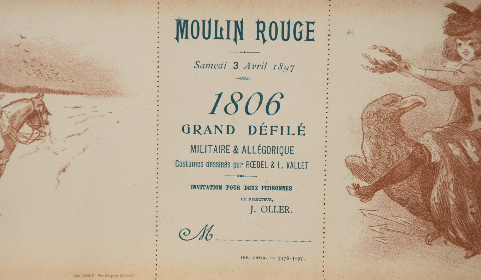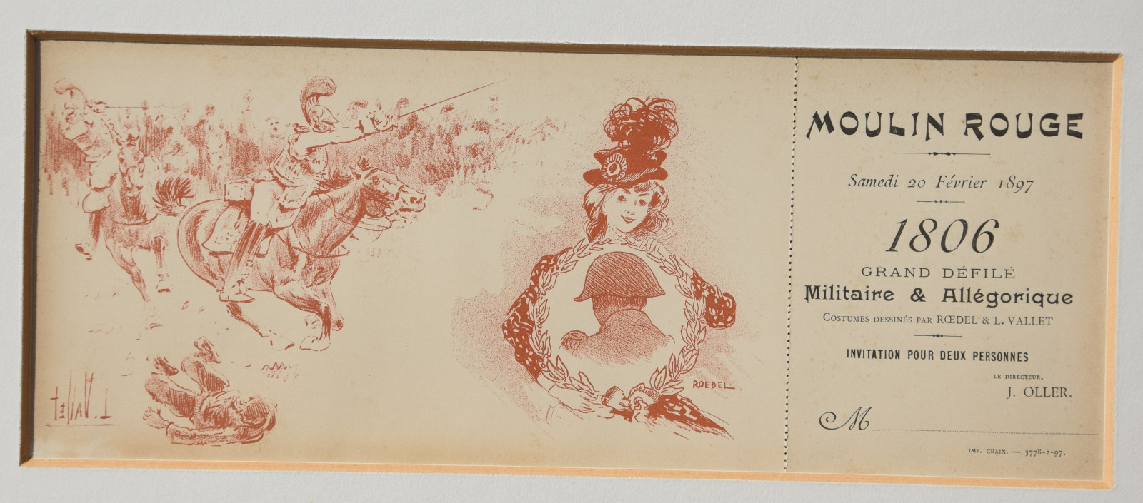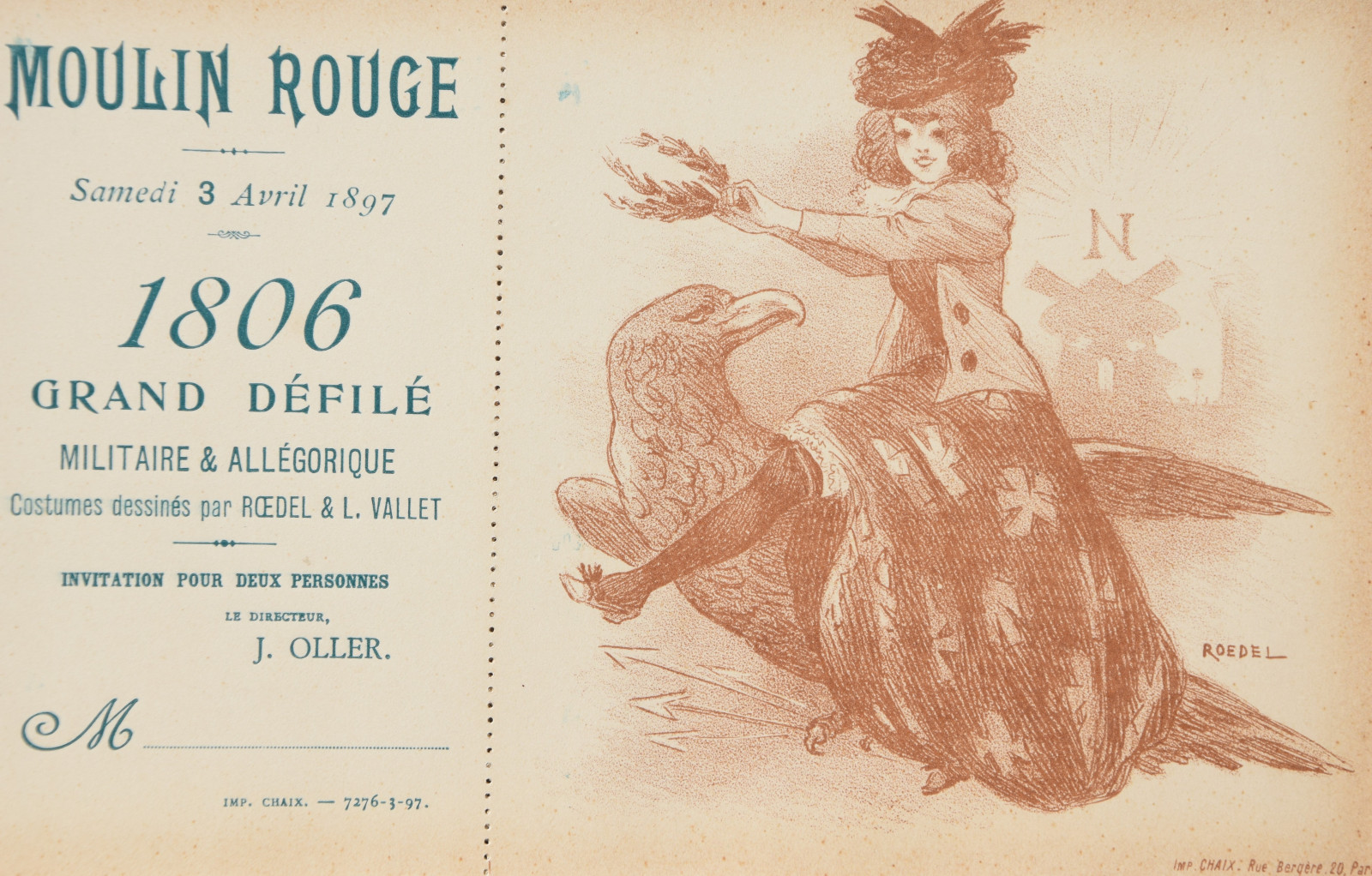 1) „Moulin Rouge. Samedi 20 Février 1897 / 1806 / Grande défilé / Militaire & Allégorique / Costumes dessinés par Roedel & L. Vallet – Invitation pir deux Personnes. / Le Directeur, / J. Oller [2].“