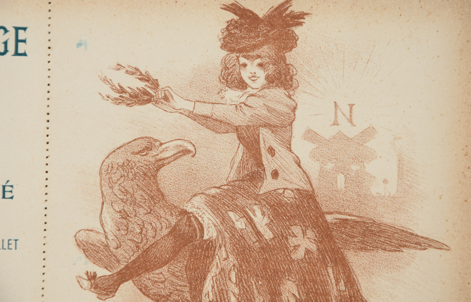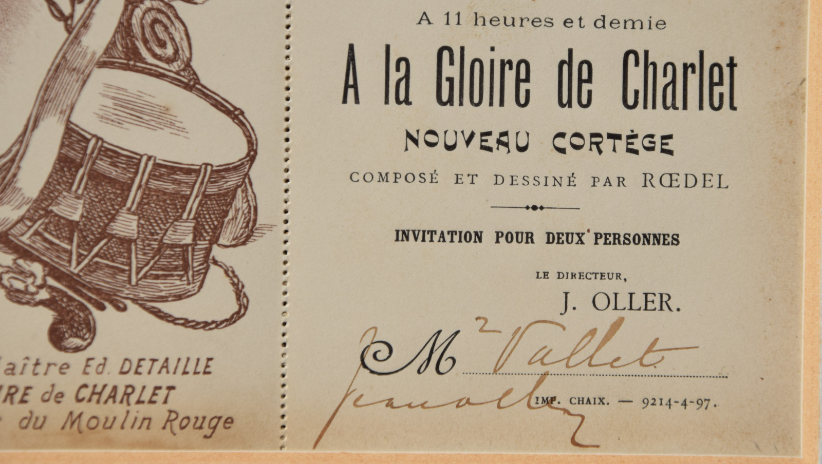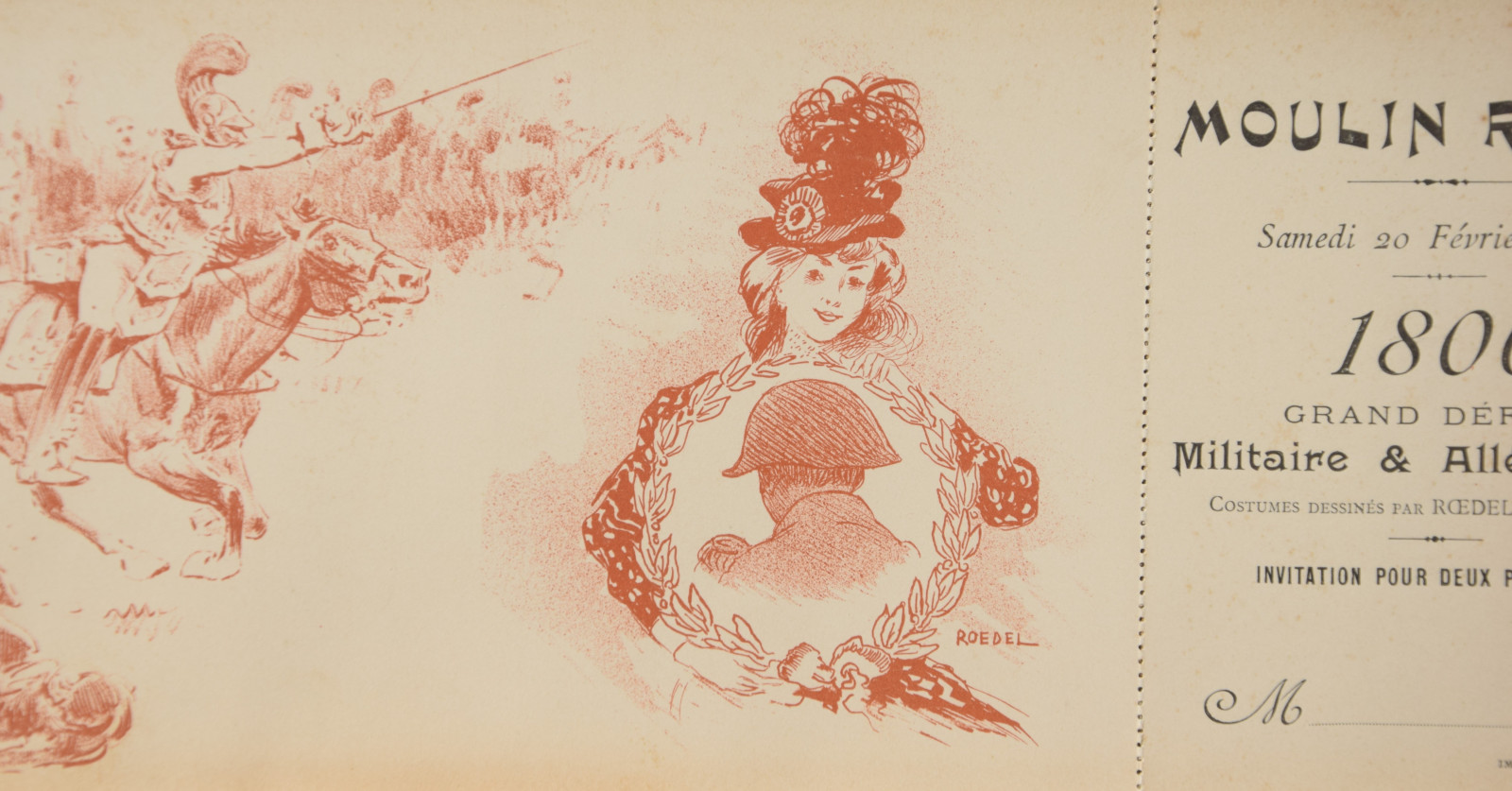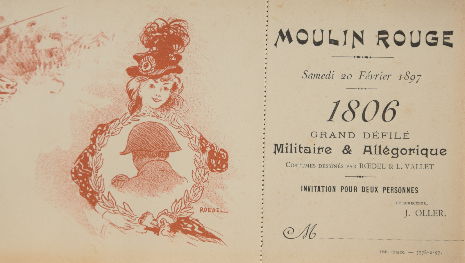 1) „Moulin Rouge. Samedi 20 Février 1897 / 1806 / Grande défilé / Militaire & Allégorique / Costumes dessinés par Roedel & L. Vallet – Invitation pir deux Personnes. / Le Directeur, / J. Oller [2].“