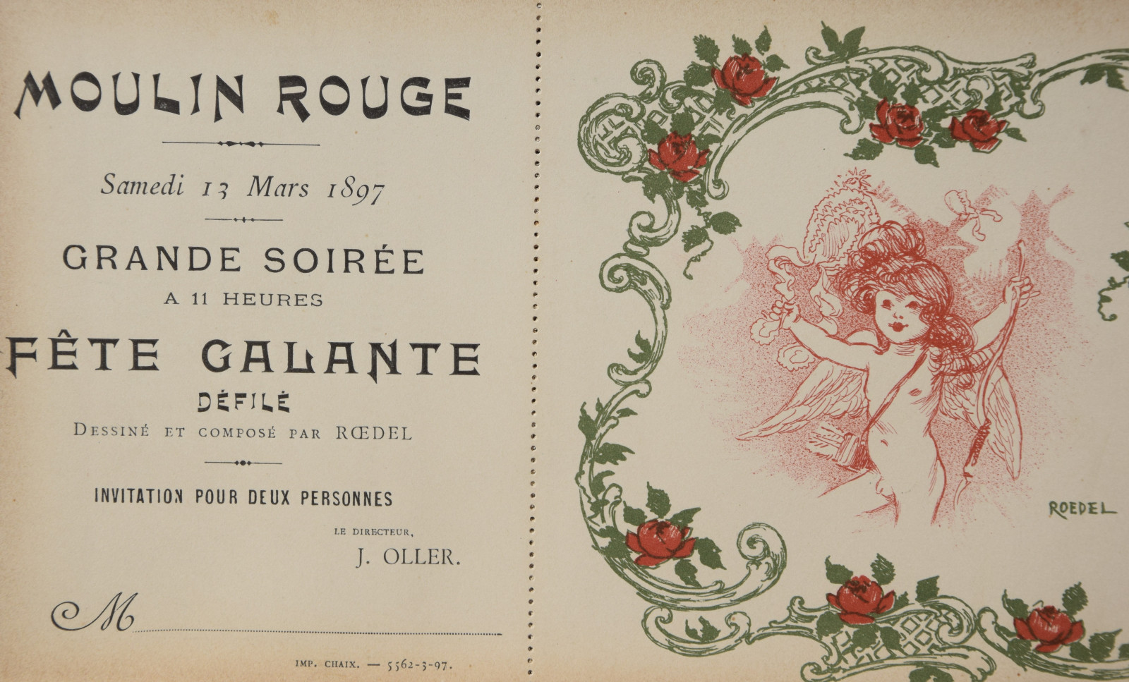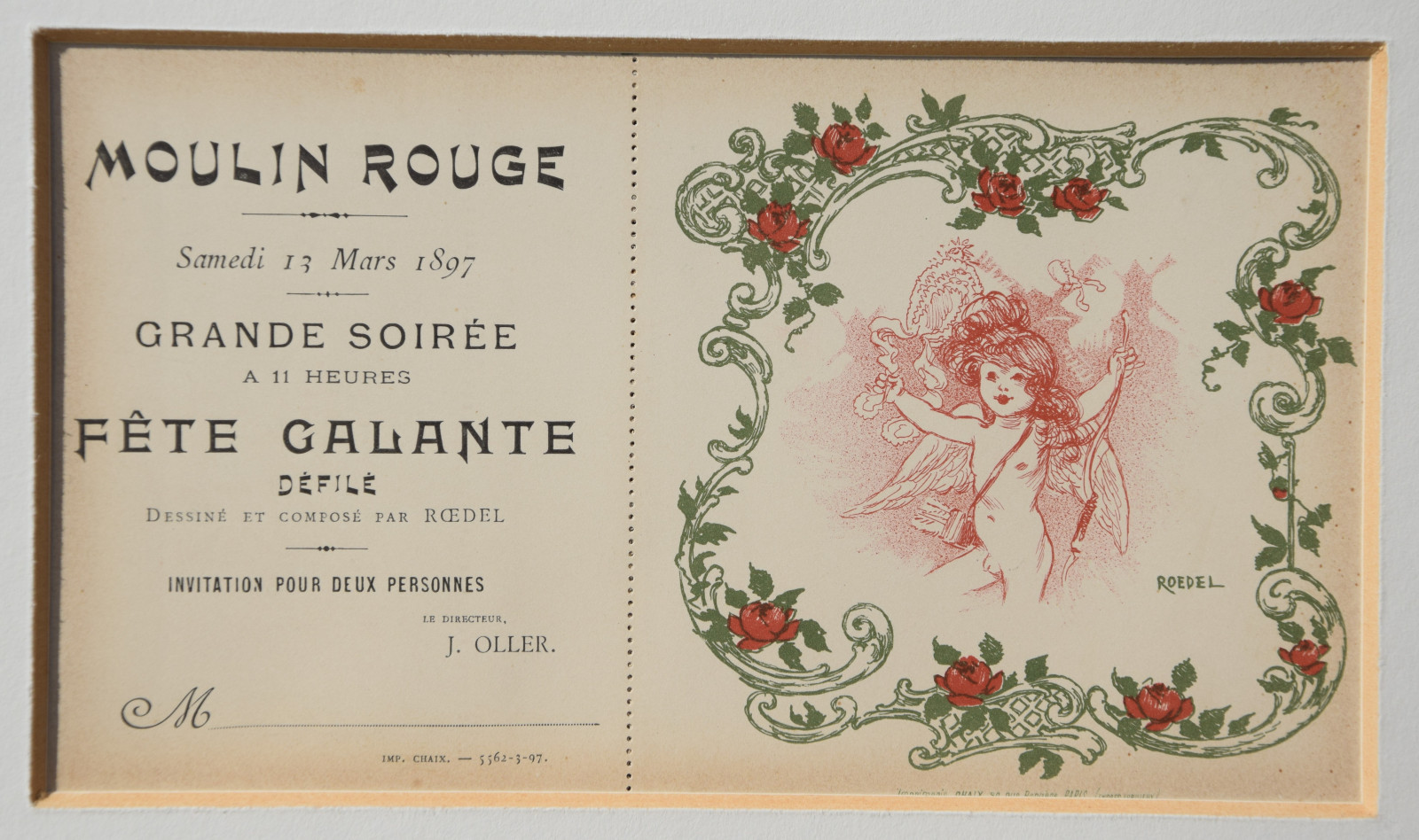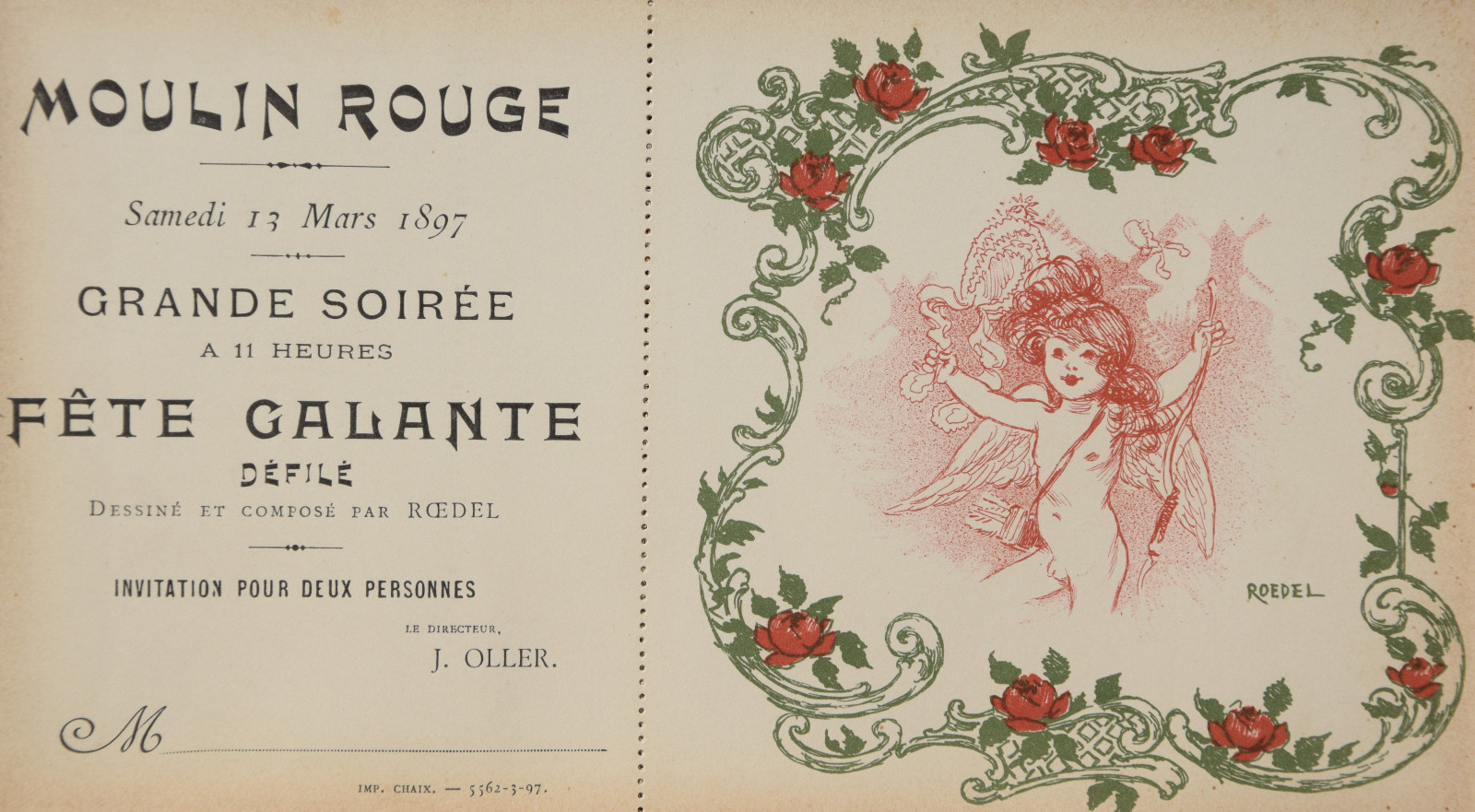 2) „Moulin Rouge. Samedi 13 Mars 1897 / Grande Soirée / A 11 heures / Fête Galante / Défile / Dessiné et composé par Roedel – Invitation pir deux Personnes. / Le Directeur, / J. Oller.“