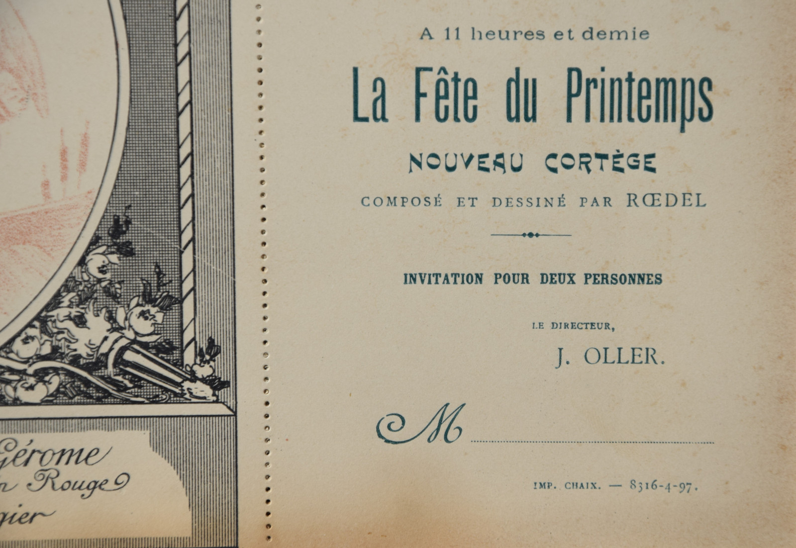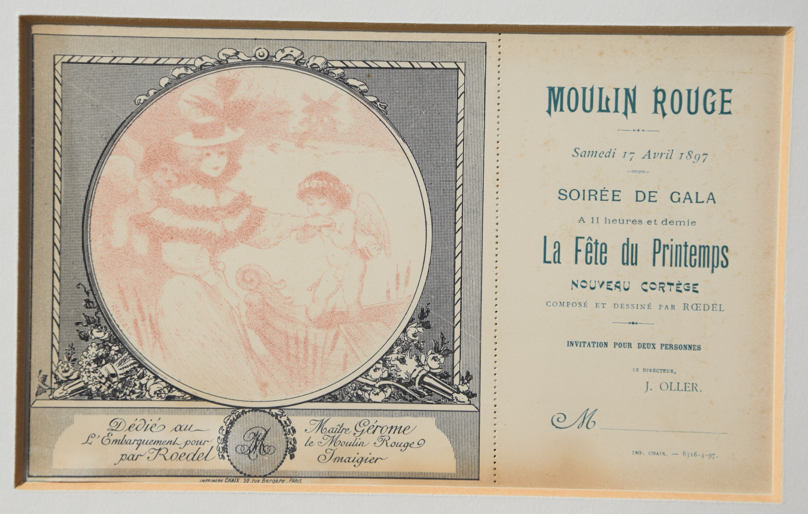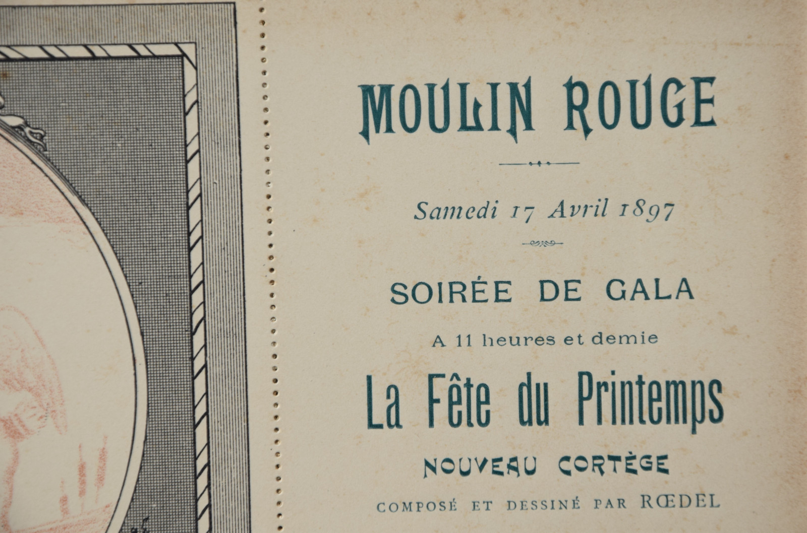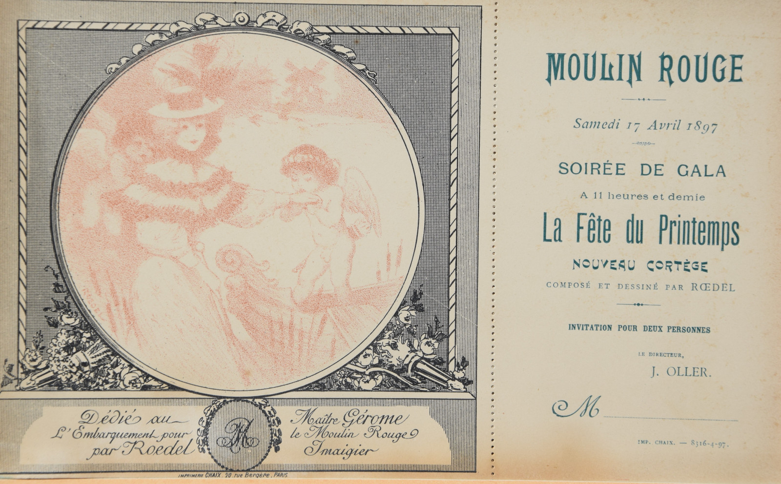 4) „Mouli Rouge. Samedi 17 Avril 1897 / Soirée de Gala / A 11 heures et demise / La Fête du Printemps / Nouveau Cortege / Composé et dessiné par Roedel – Invitation pir deux Personnes. / Le Directeur, / J. Oller.“