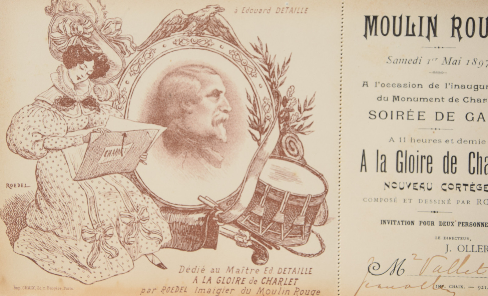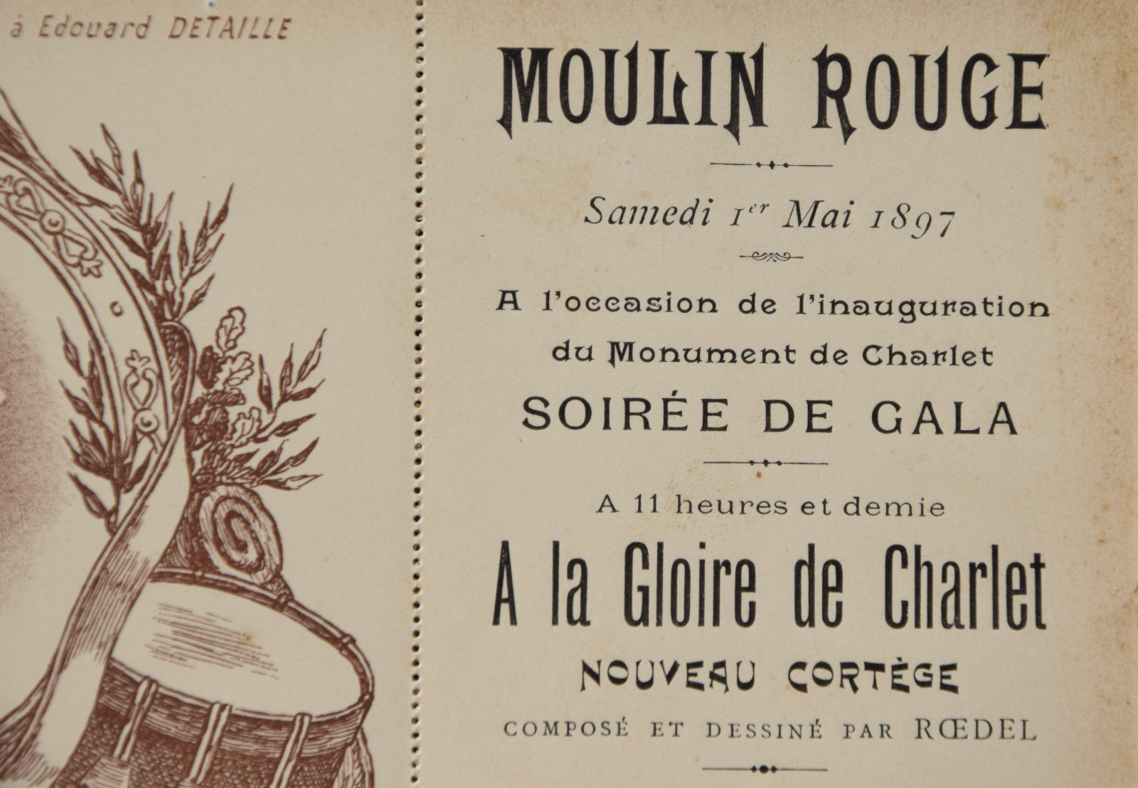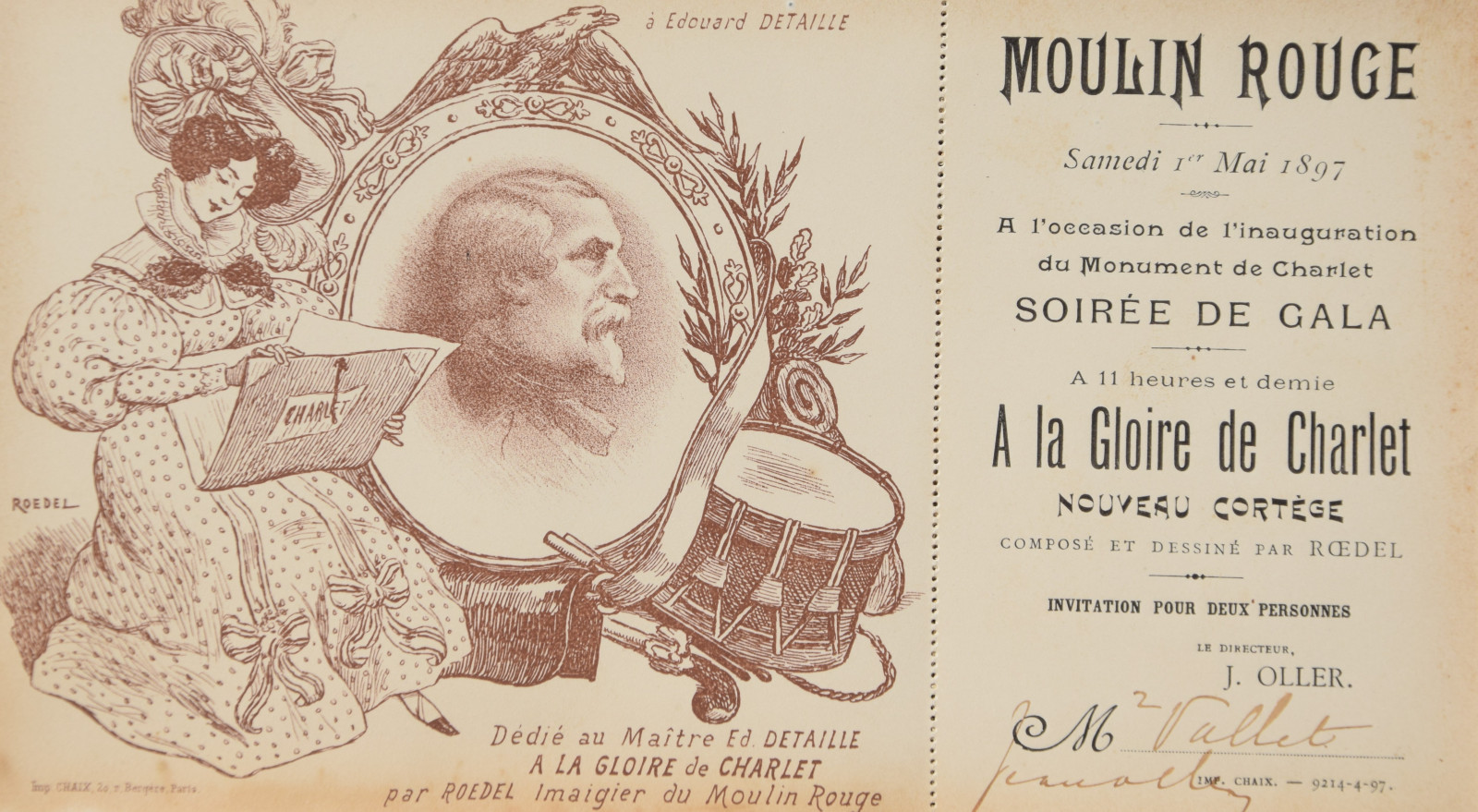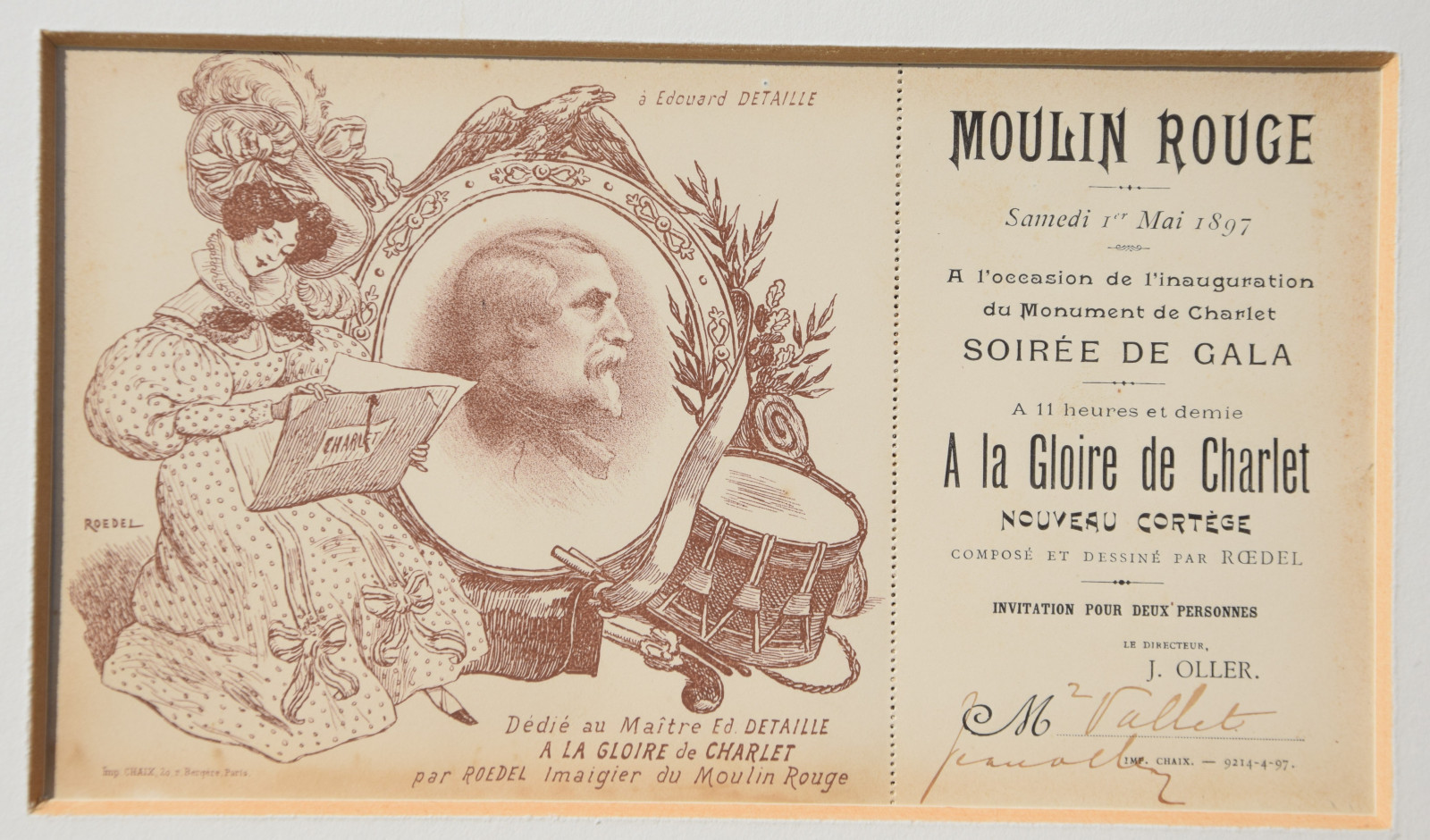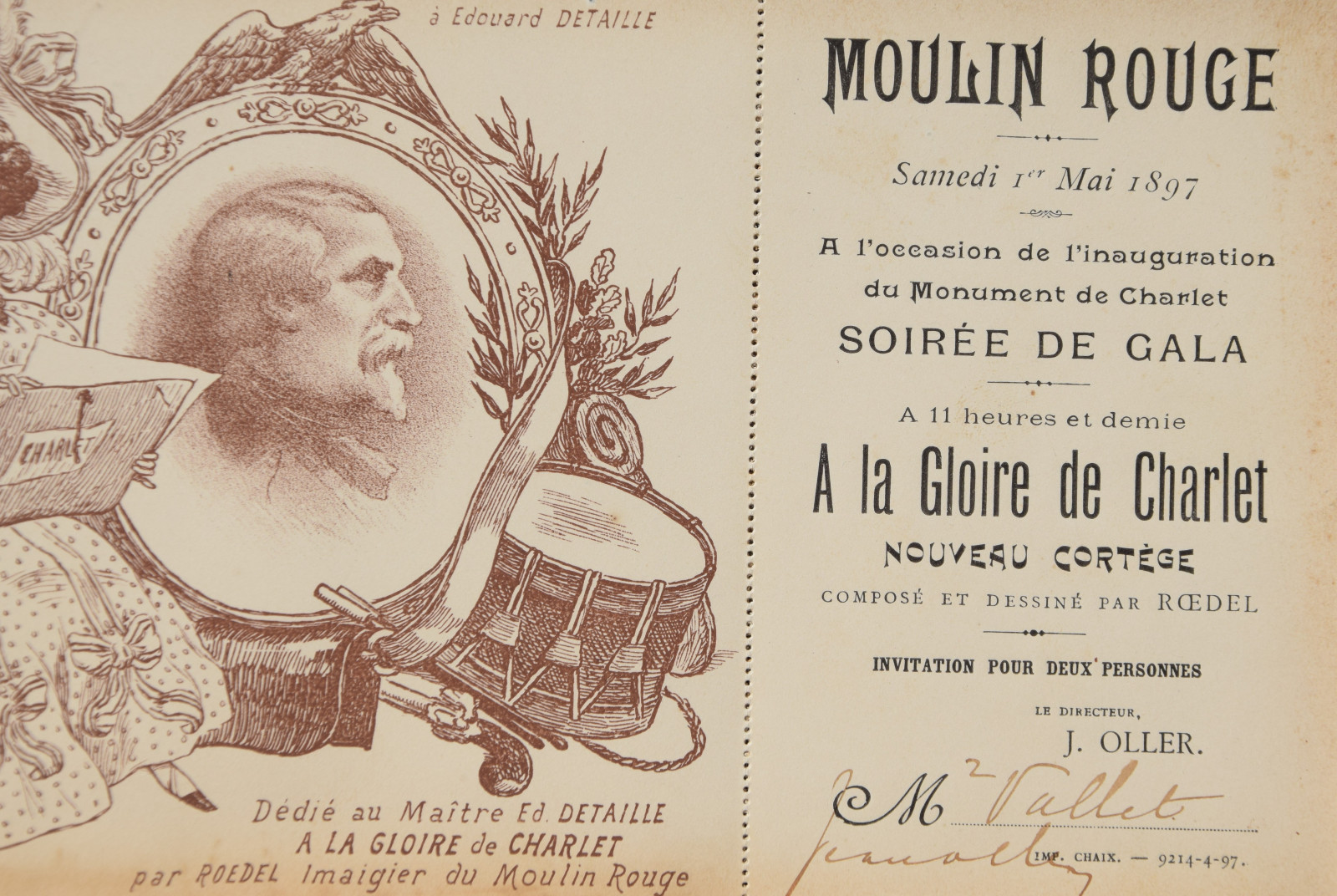 5) „Mouli Rouge. Samedi 1 Mai 1897 / A l’occasion de l’inauguration du Monument de Charlet / Soirée de Gala / A 11 heures et demie / A la Gloire de Charlet / Nouveau Cortége / Composé et dessiné par Roedel – Invitation pir deux Personnes. / Le Directeur, / J. Oller.“
