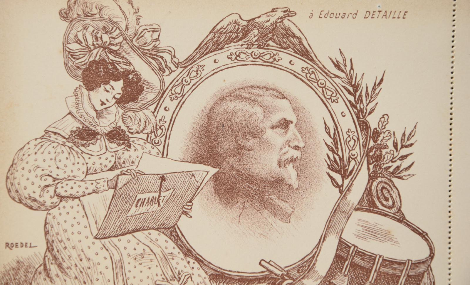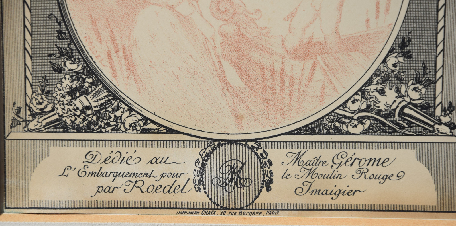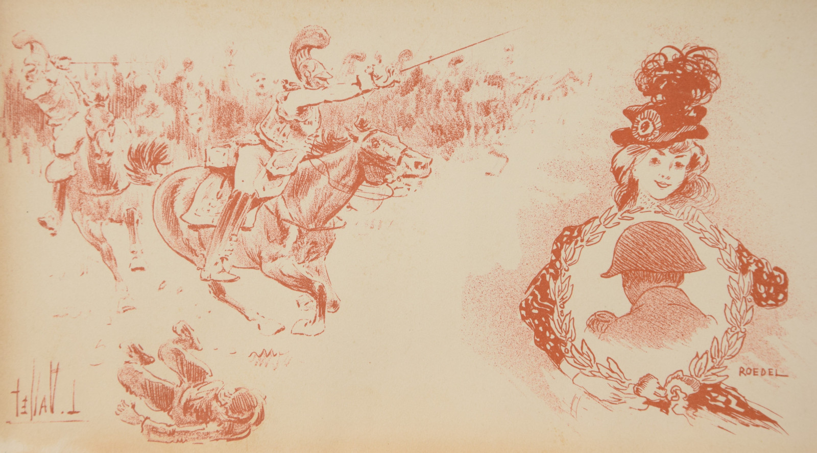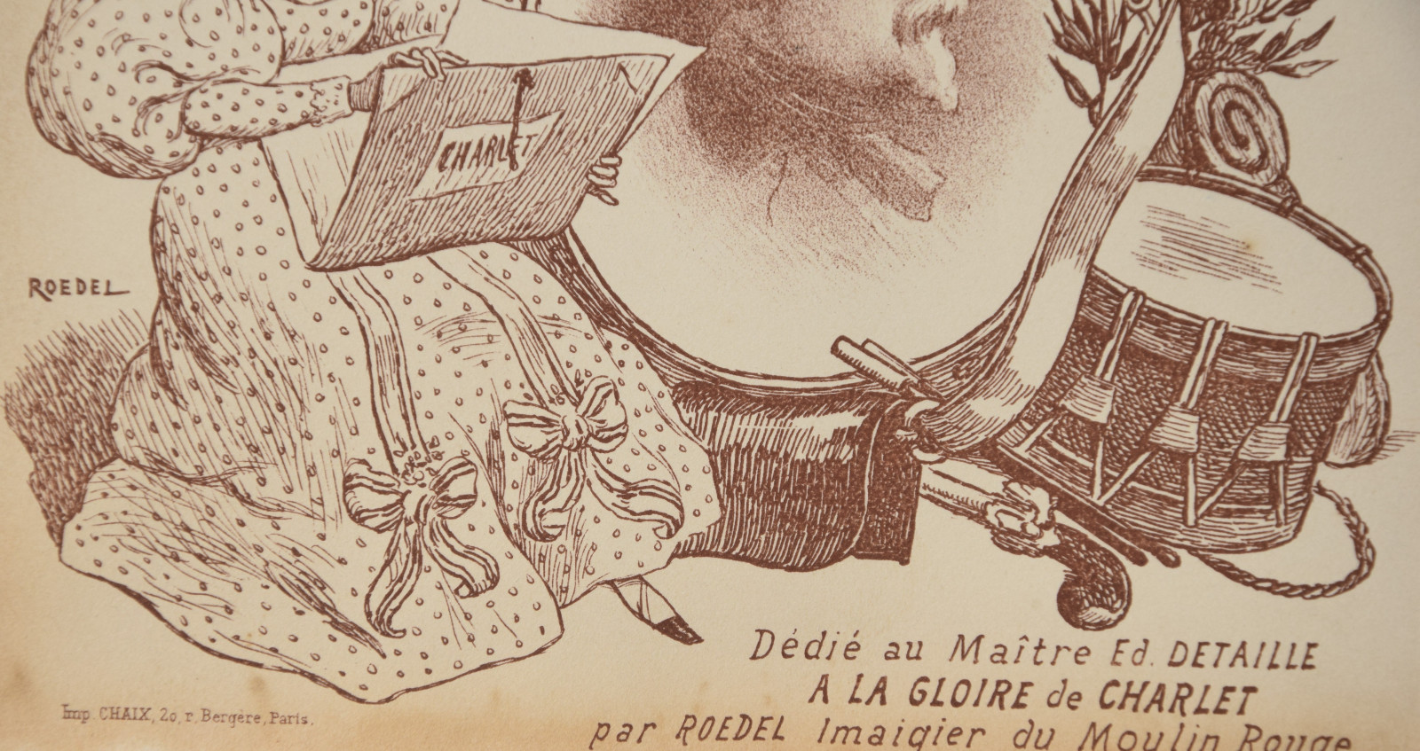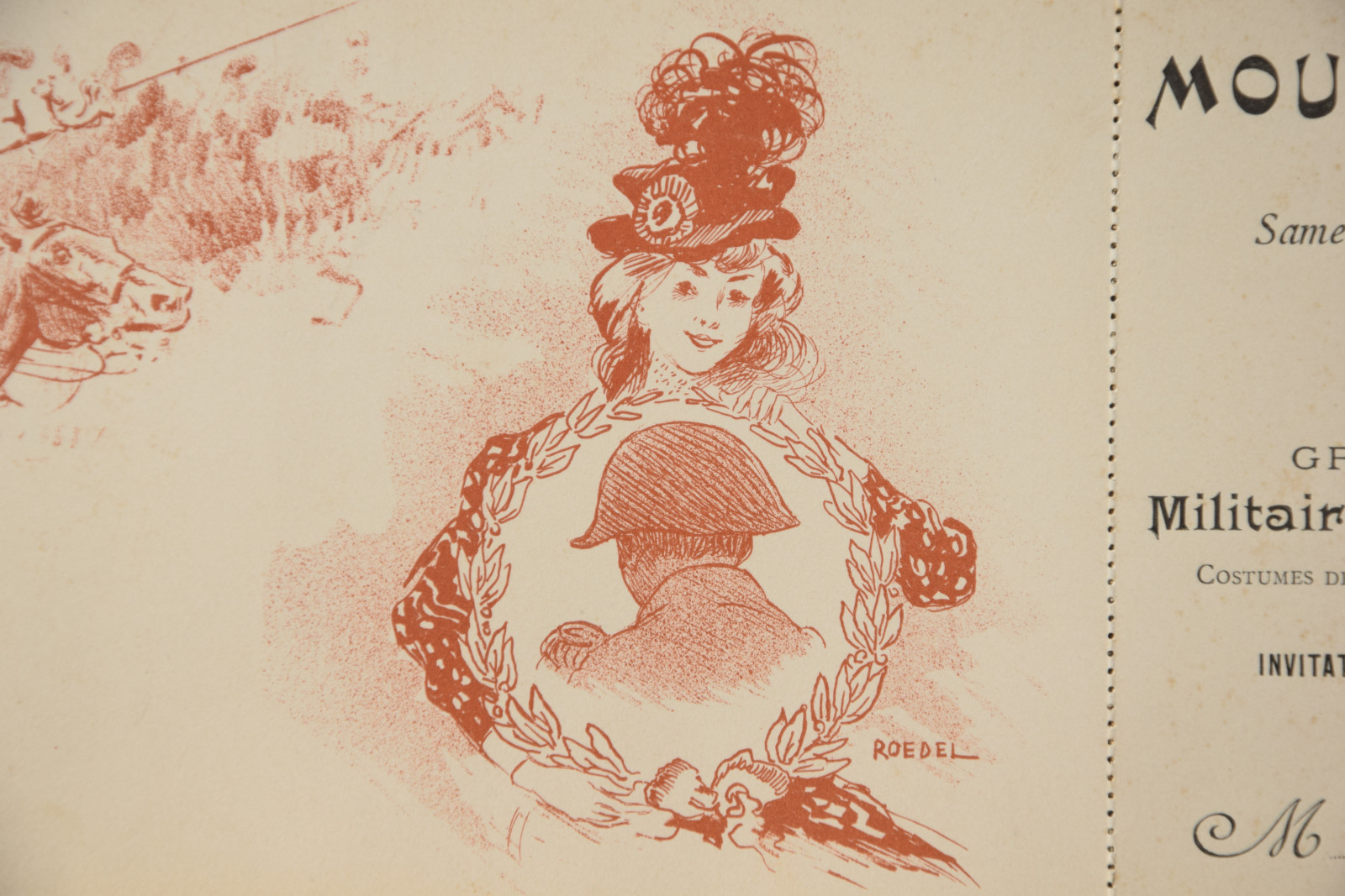 5) „Mouli Rouge. Samedi 1 Mai 1897 / A l’occasion de l’inauguration du Monument de Charlet / Soirée de Gala / A 11 heures et demie / A la Gloire de Charlet / Nouveau Cortége / Composé et dessiné par Roedel – Invitation pir deux Personnes. / Le Directeur, / J. Oller.“