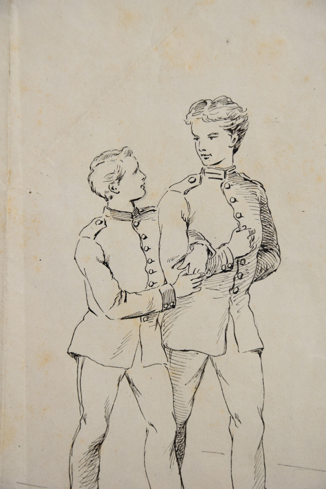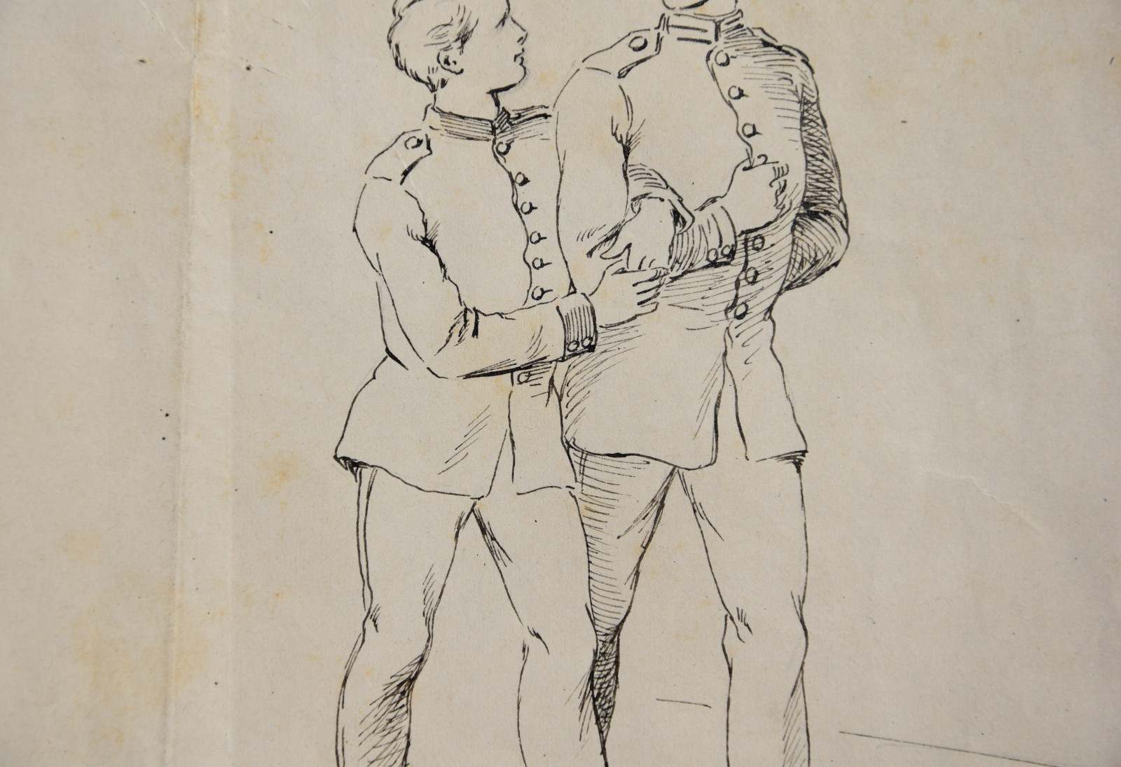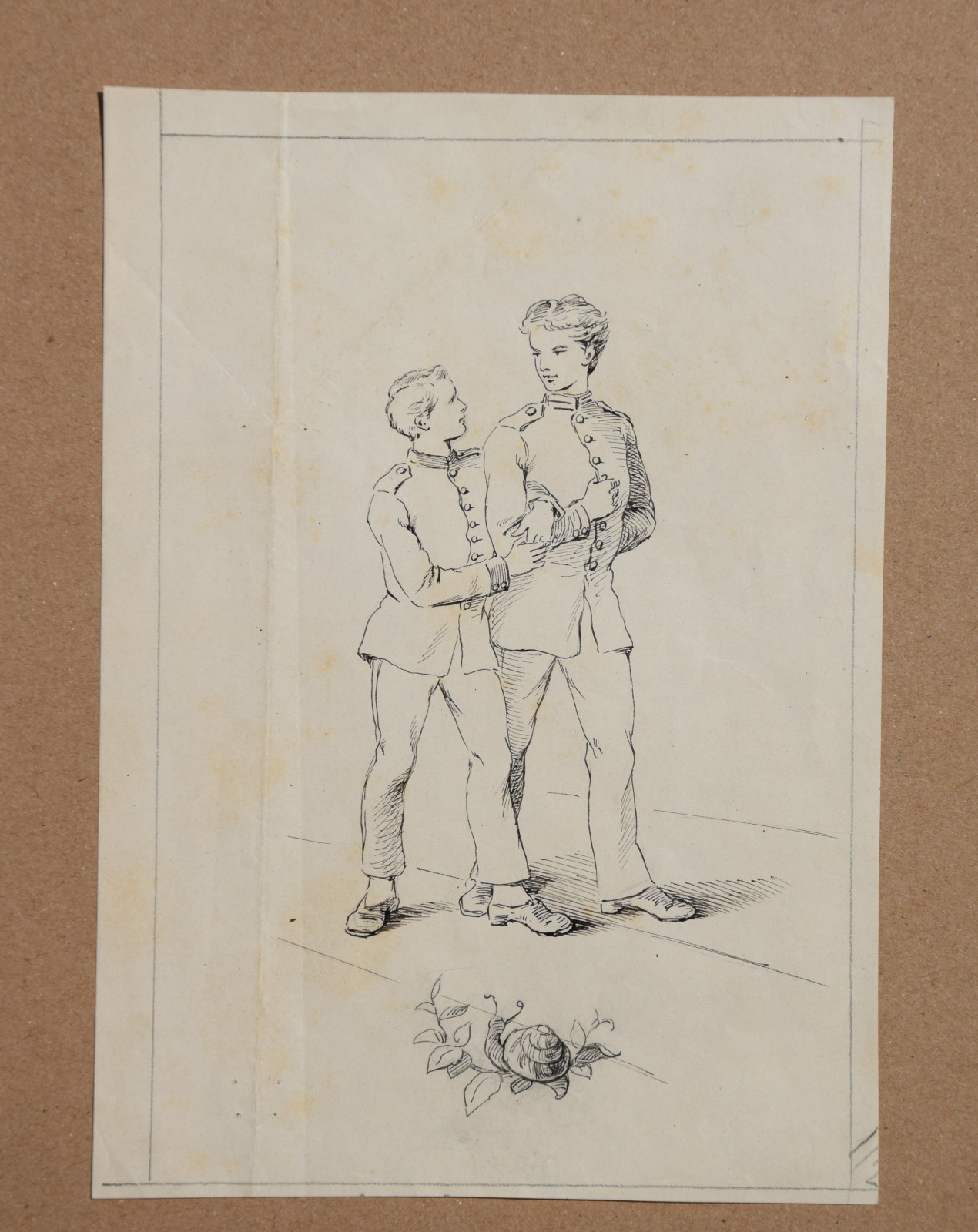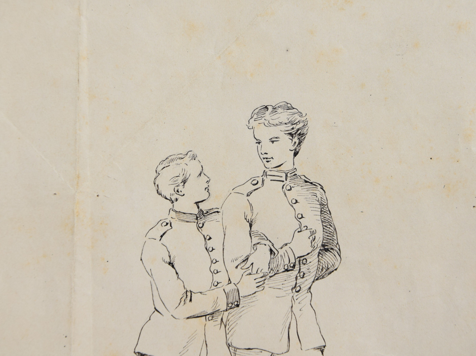 Gezeigt werden hier zwei junge bayerische Kadetten im Waffenrock. Beide gehen eng beieinander, die Arme sind eingehakt und beide blicken sich zudem überaus vertraut, ja man möchte fast sagen: verliebt, an. Der etwas kleinere Kadett scheint sich mit seinem Oberkörper auch etwas an seinen Partner zu schmiegen. Allein das Motiv mit der figürlichen Anordnung und Ausrichtung verweist deutlich auf das Sujet eines Liebespaars und geht deutlich über reine (Männer-, Soldaten-)Freundschaft hinaus, was diese zeichnerische Darstellung junger Kadetten als überaus beachtenswert erscheinen lässt.
