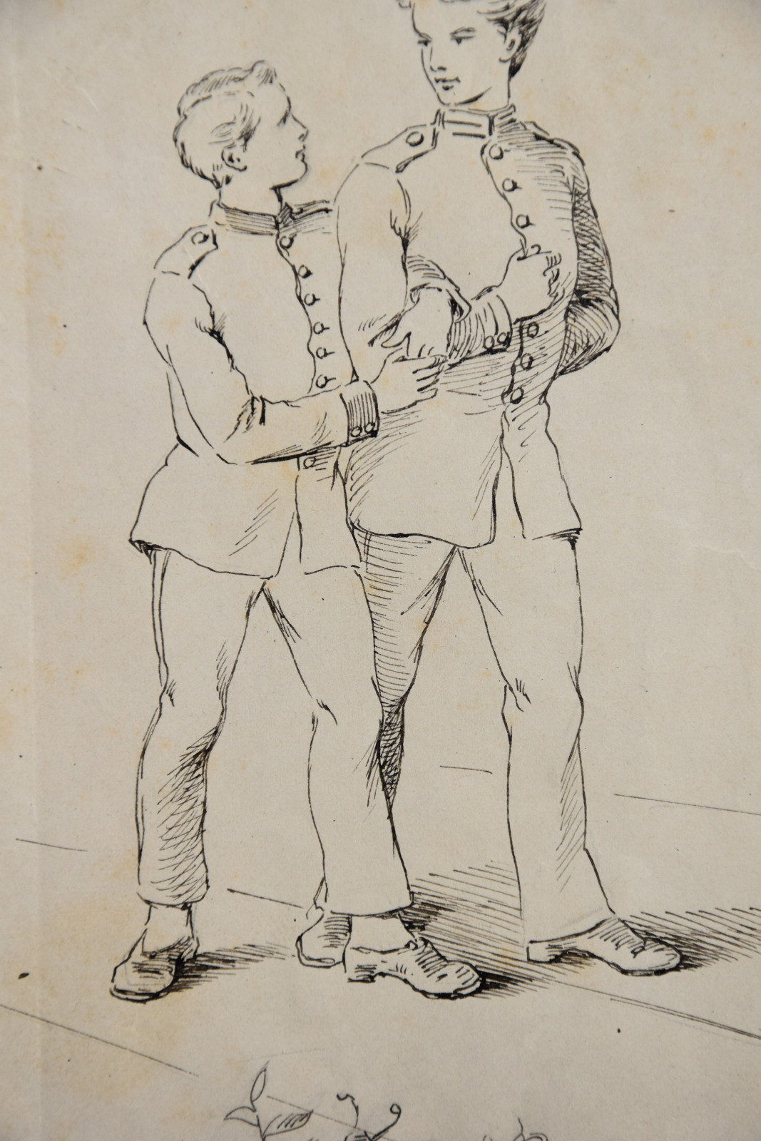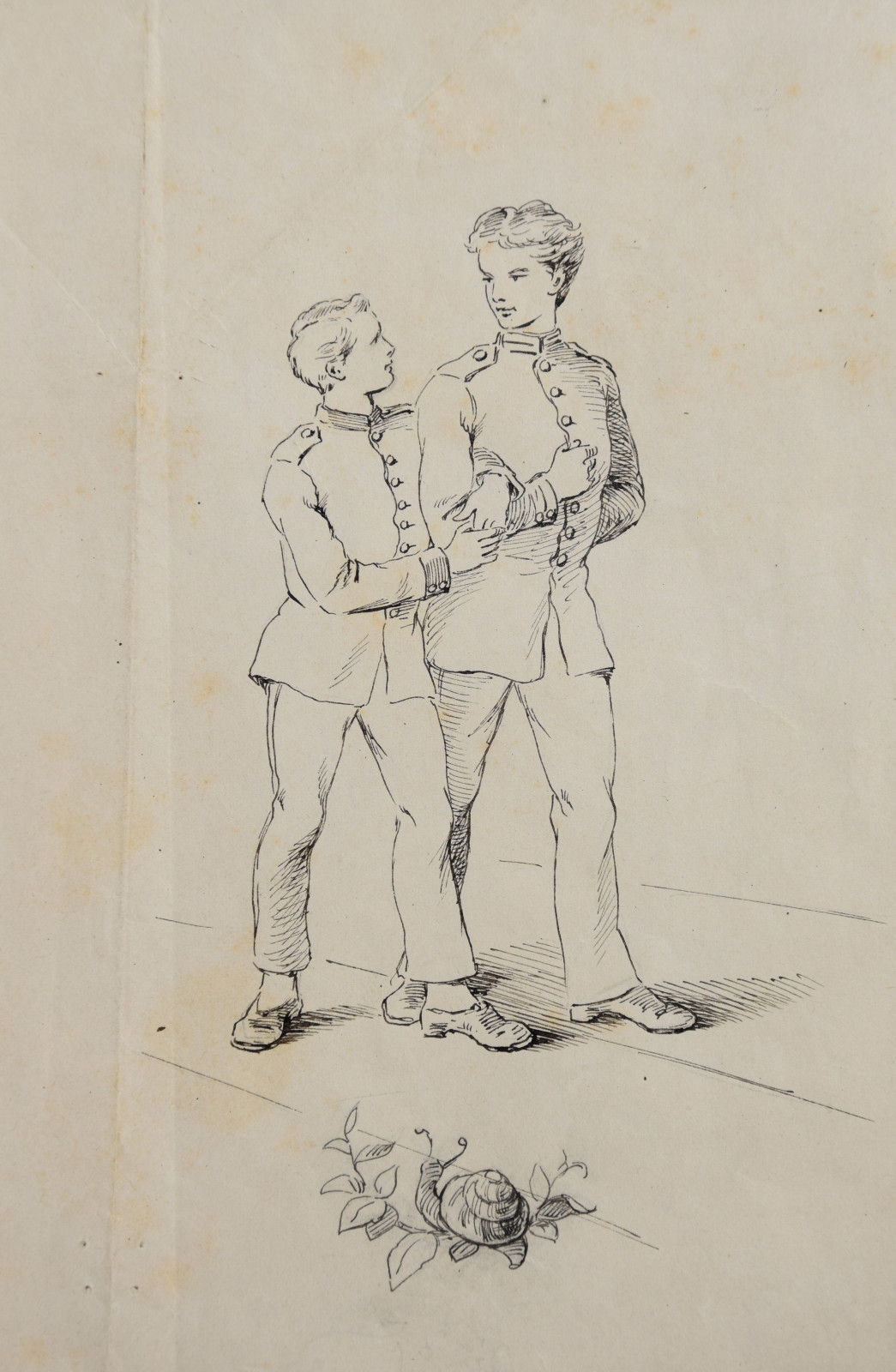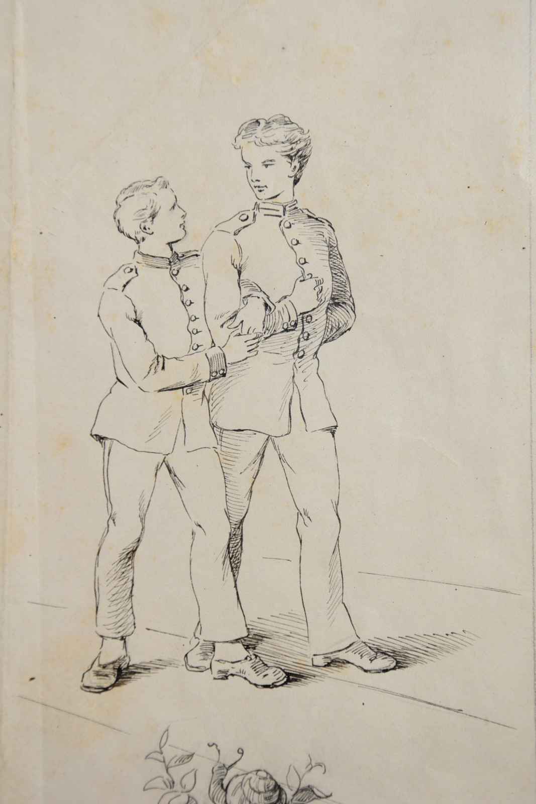 Gezeigt werden hier zwei junge bayerische Kadetten im Waffenrock. Beide gehen eng beieinander, die Arme sind eingehakt und beide blicken sich zudem überaus vertraut, ja man möchte fast sagen: verliebt, an. Der etwas kleinere Kadett scheint sich mit seinem Oberkörper auch etwas an seinen Partner zu schmiegen. Allein das Motiv mit der figürlichen Anordnung und Ausrichtung verweist deutlich auf das Sujet eines Liebespaars und geht deutlich über reine (Männer-, Soldaten-)Freundschaft hinaus, was diese zeichnerische Darstellung junger Kadetten als überaus beachtenswert erscheinen lässt.
