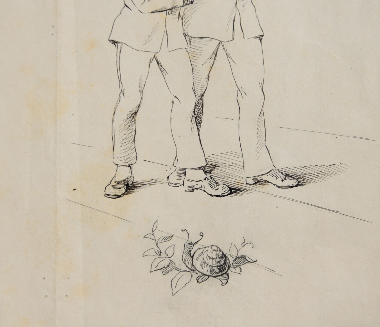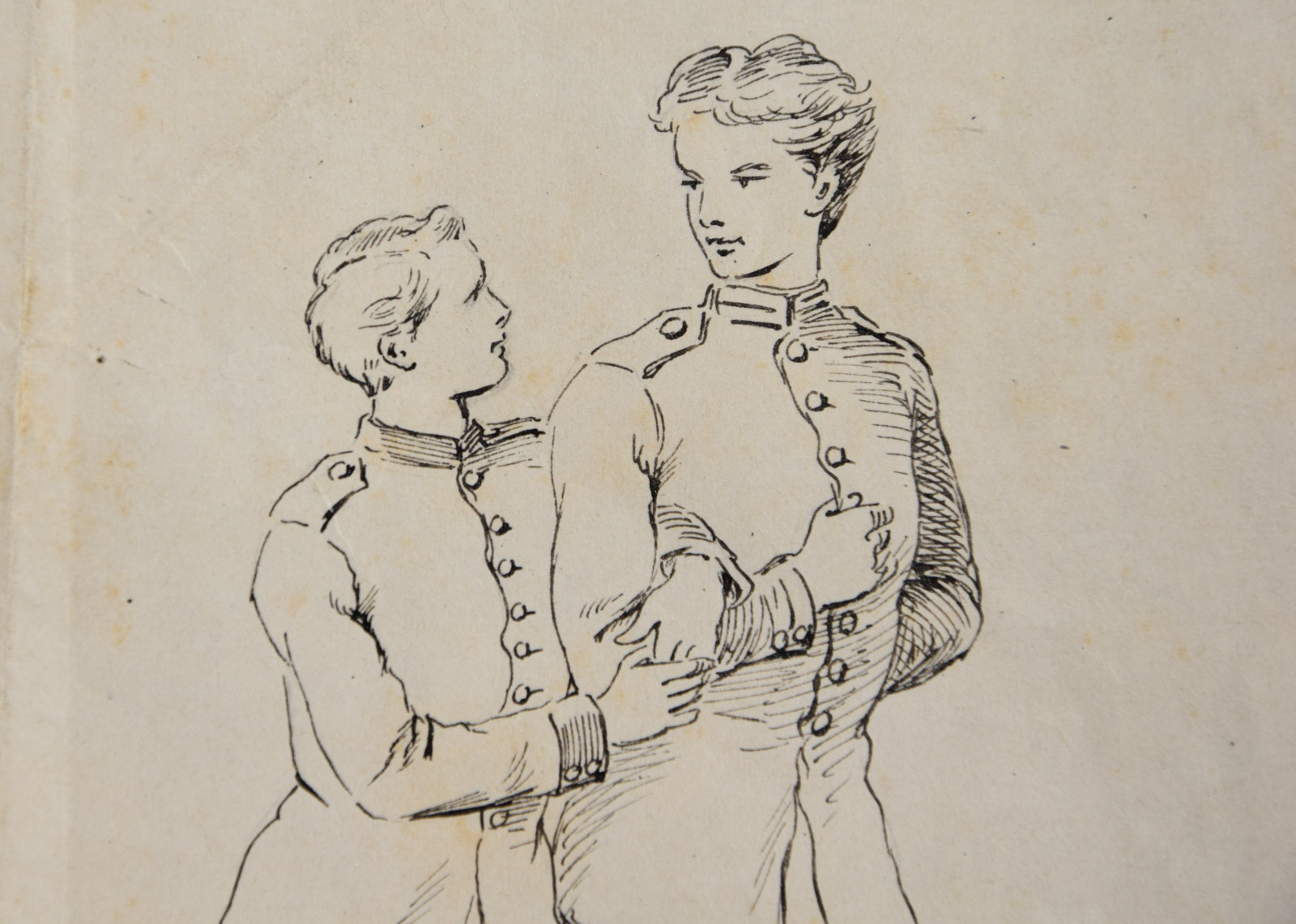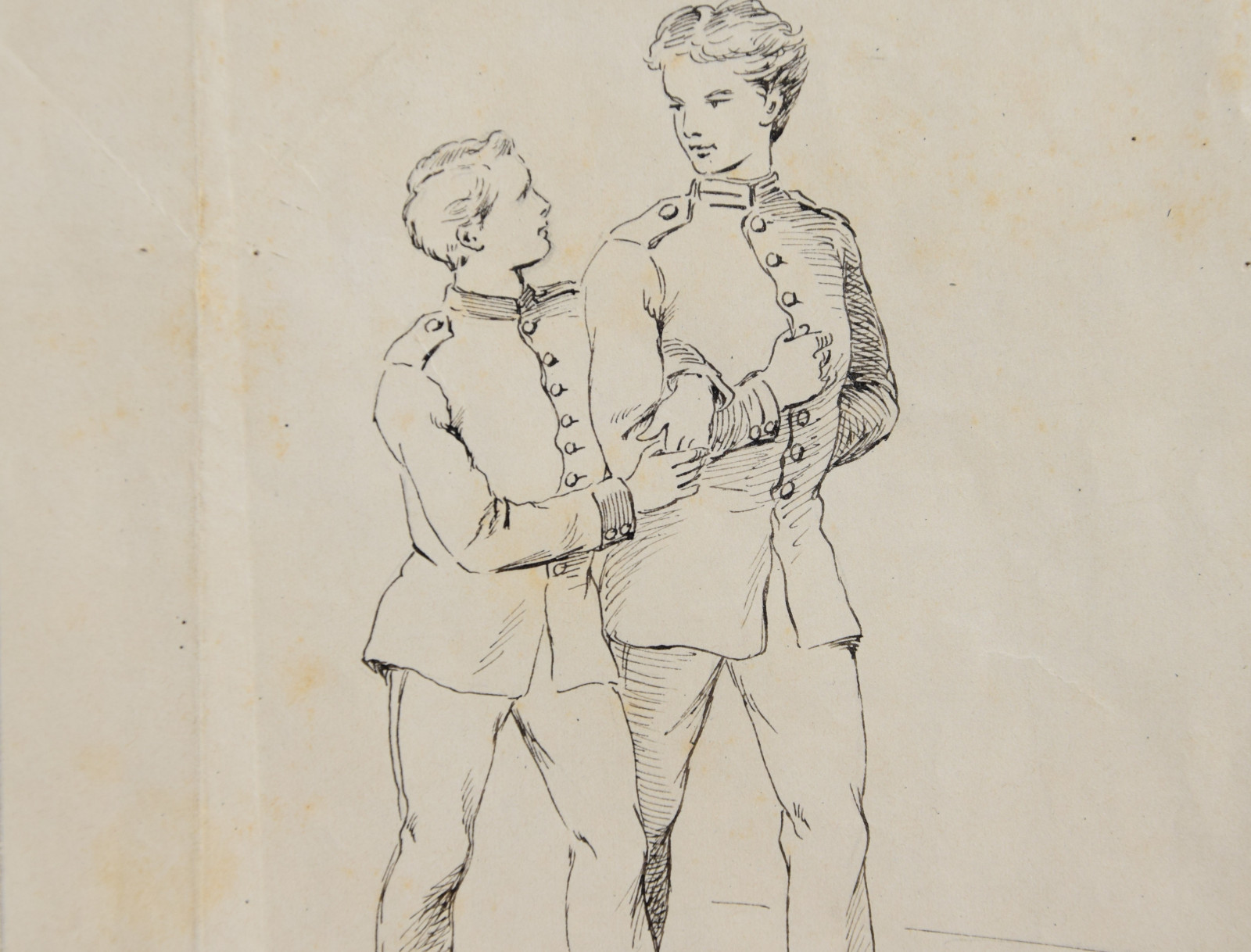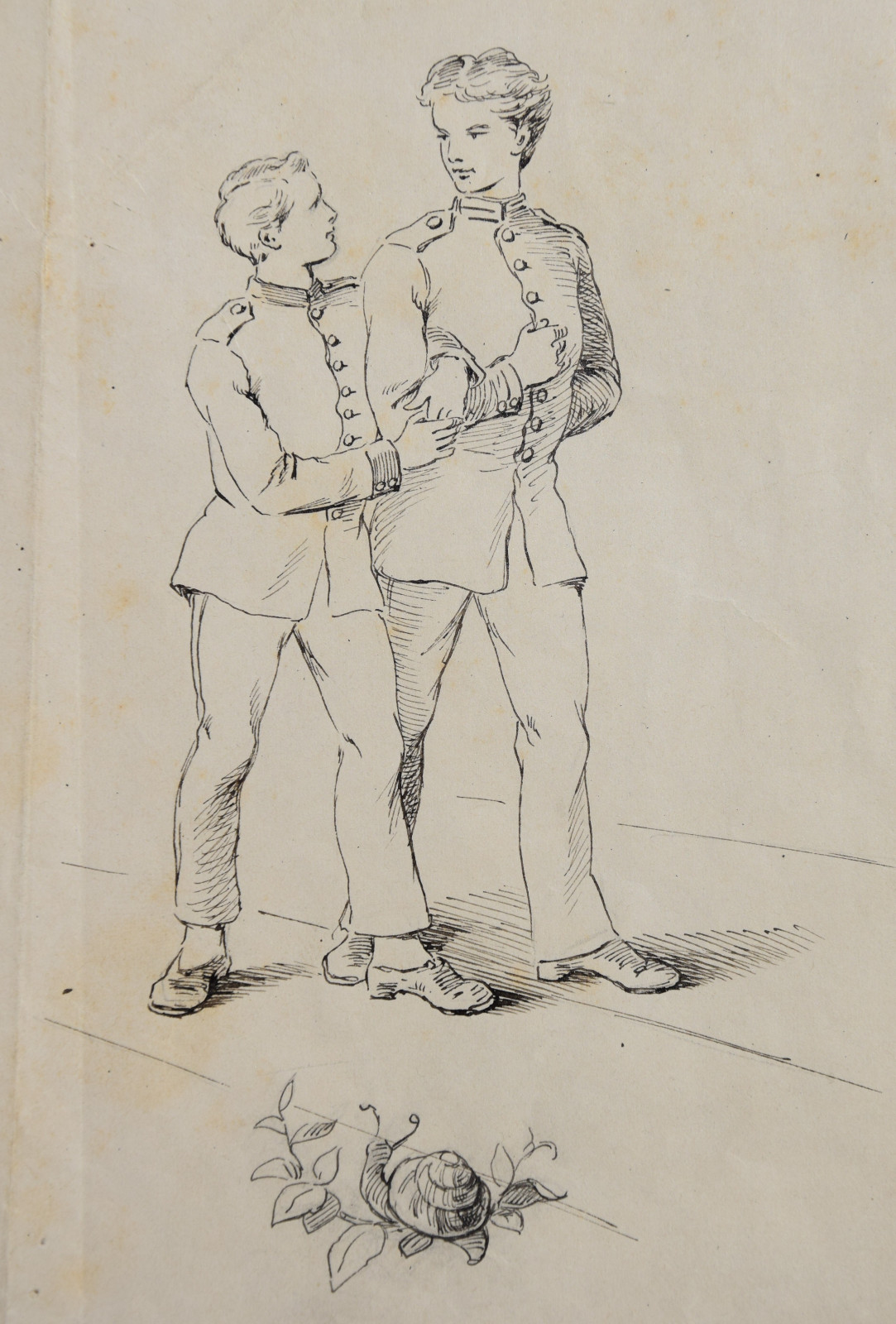 Gezeigt werden hier zwei junge bayerische Kadetten im Waffenrock. Beide gehen eng beieinander, die Arme sind eingehakt und beide blicken sich zudem überaus vertraut, ja man möchte fast sagen: verliebt, an. Der etwas kleinere Kadett scheint sich mit seinem Oberkörper auch etwas an seinen Partner zu schmiegen. Allein das Motiv mit der figürlichen Anordnung und Ausrichtung verweist deutlich auf das Sujet eines Liebespaars und geht deutlich über reine (Männer-, Soldaten-)Freundschaft hinaus, was diese zeichnerische Darstellung junger Kadetten als überaus beachtenswert erscheinen lässt.