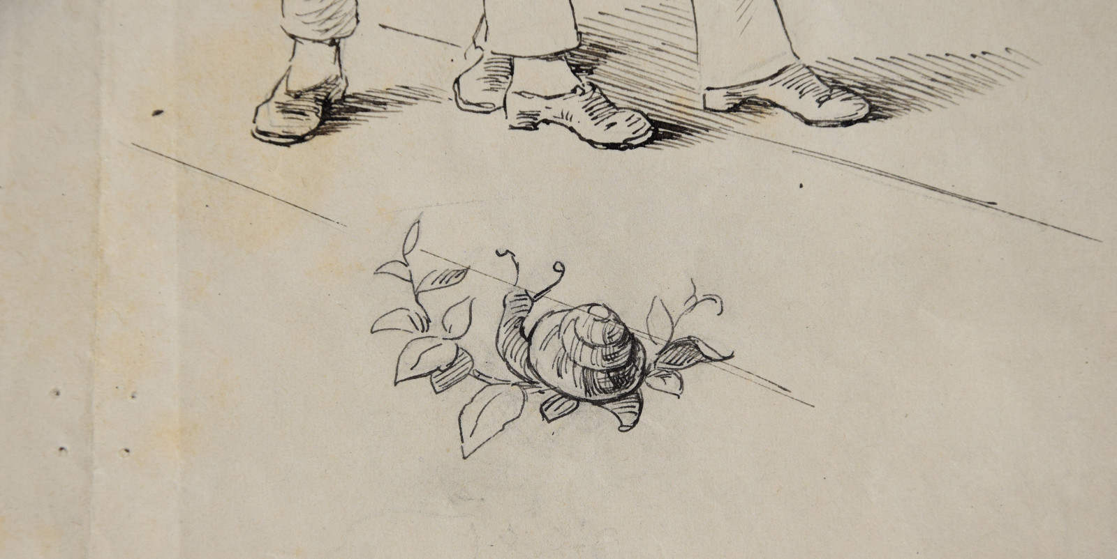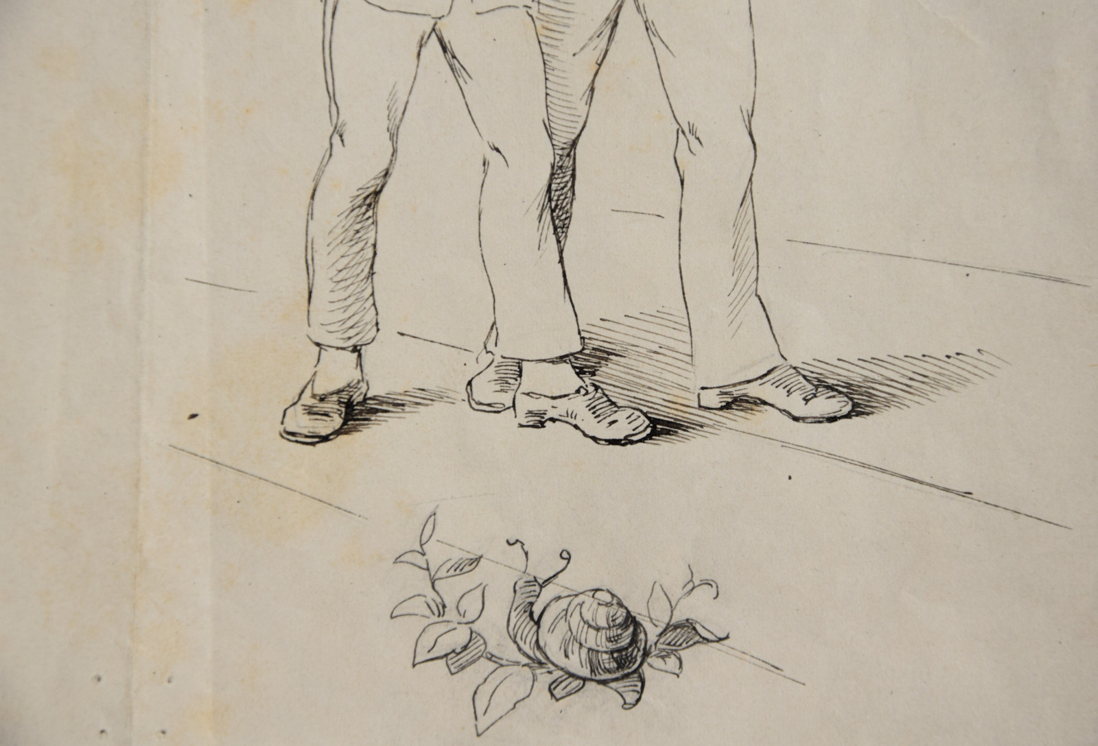 ohne Titel [zwei eng beieinander gehende, eingehakte bayerische Kadetten im Waffenrock, am unteren Rand eine Schnecke auf einem Zweig]