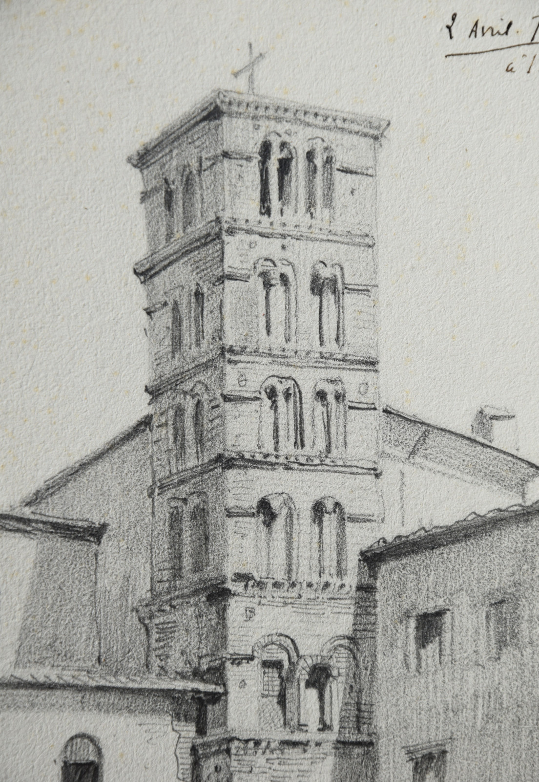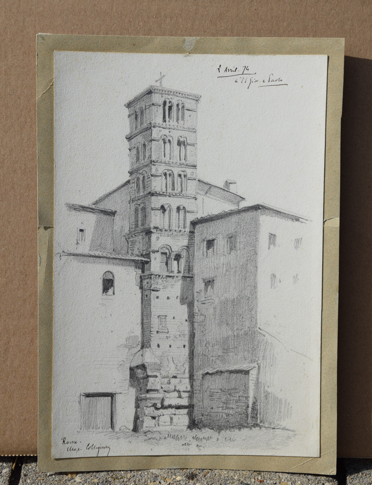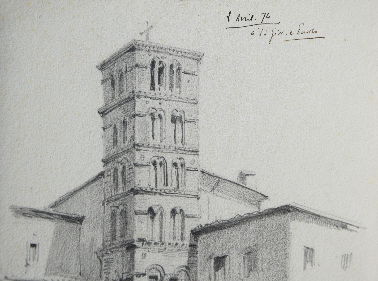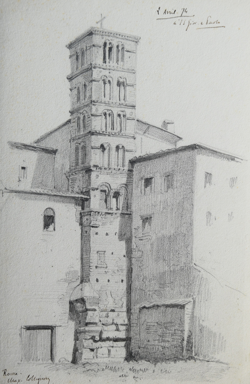 Diese hier vorliegende Bleistiftzeichnung datiert taggenau auf den 2. April 1874 und zeigt einen detaillierten Blick auf den Kampanile der bedeutenden Basilika Santi Giovanni e Paolo in Rom, eine der ältesten christlichen Stätten.
