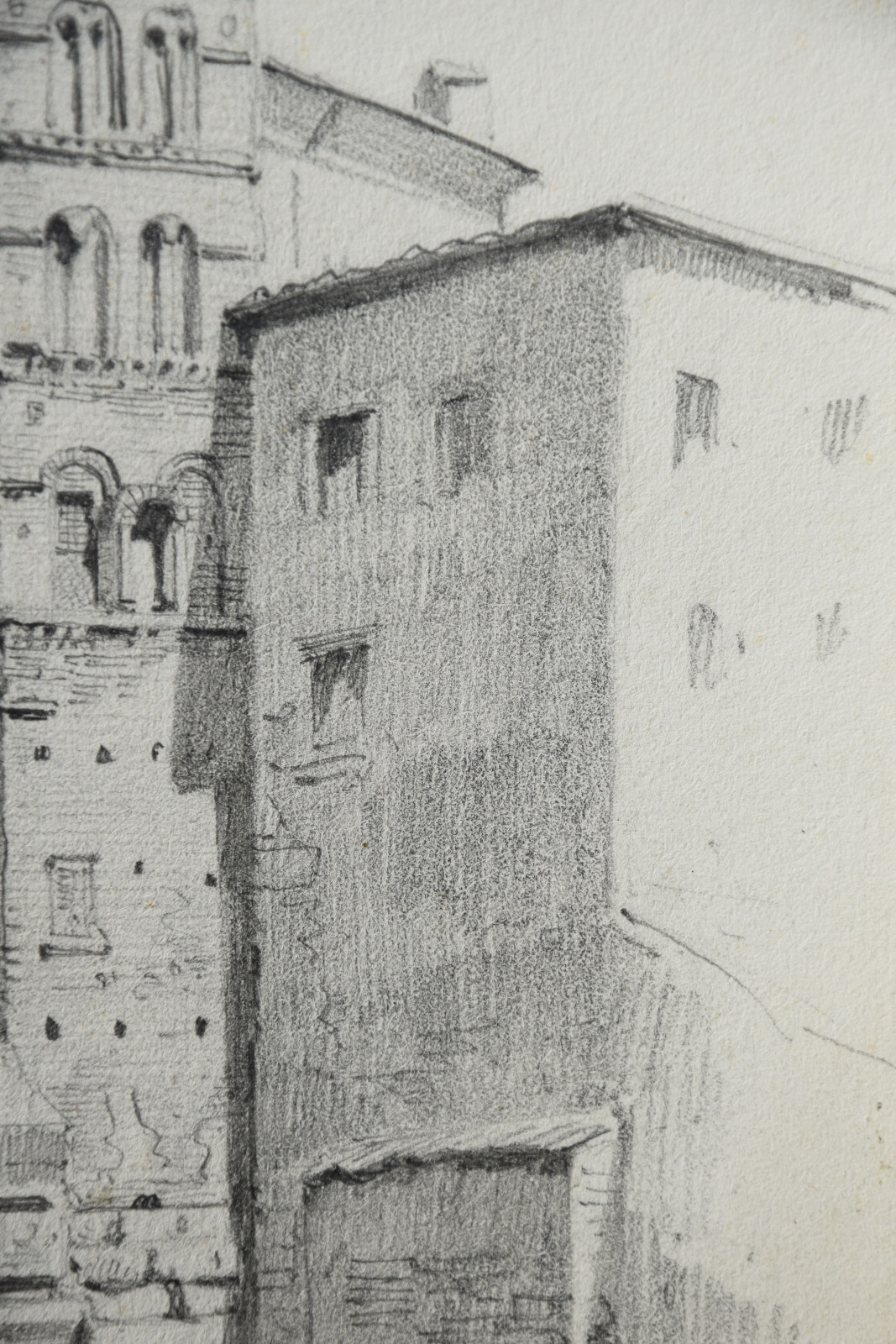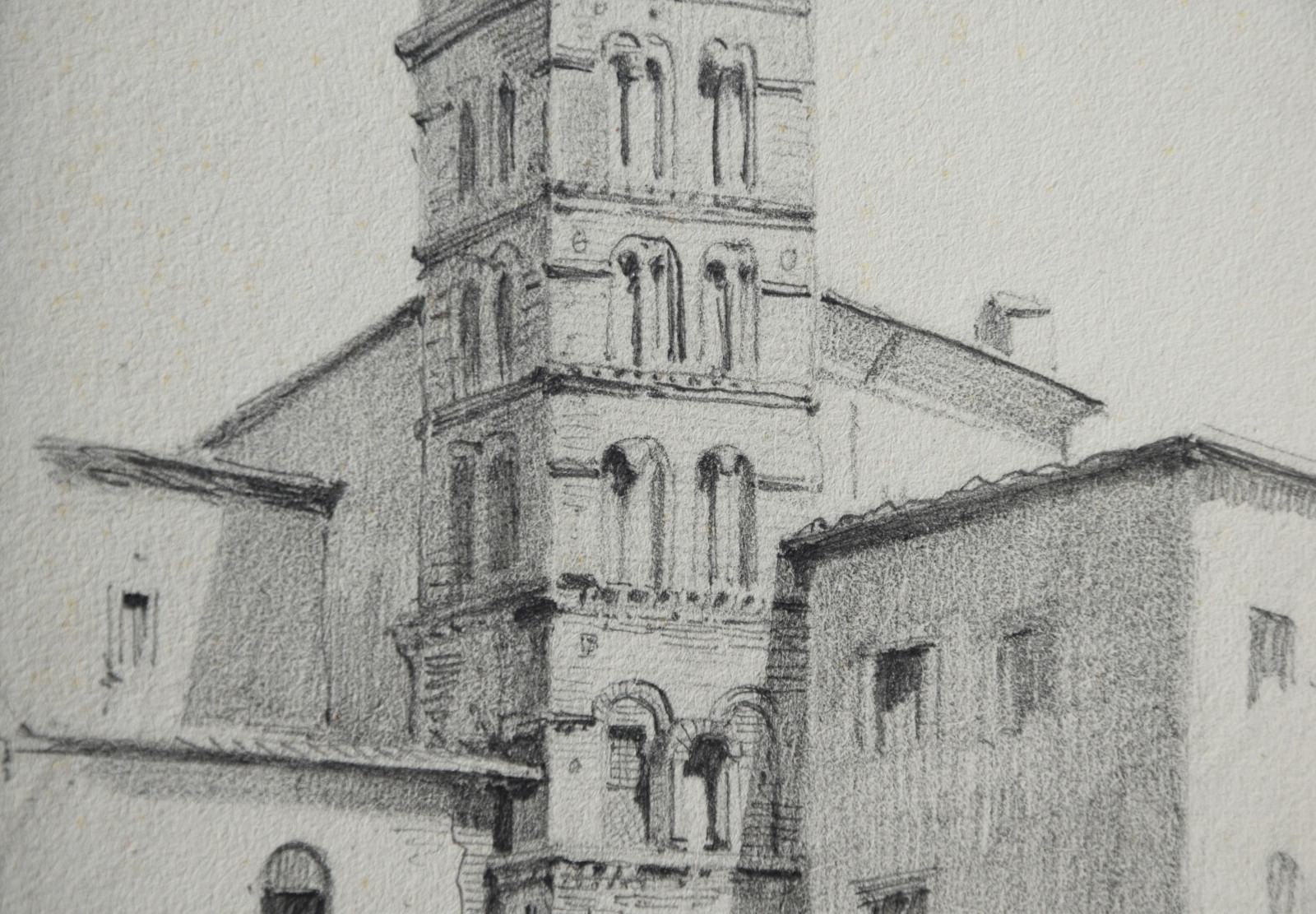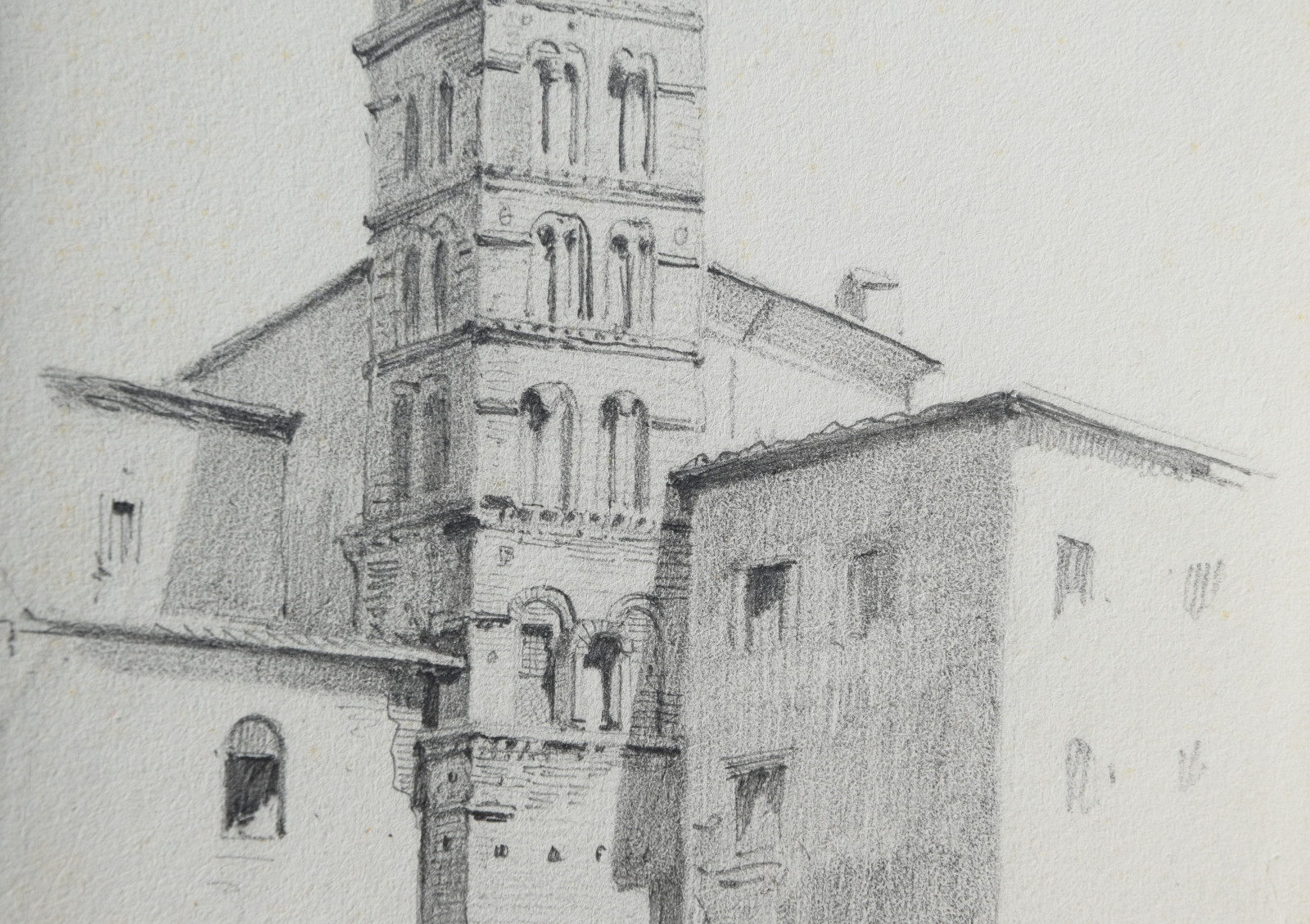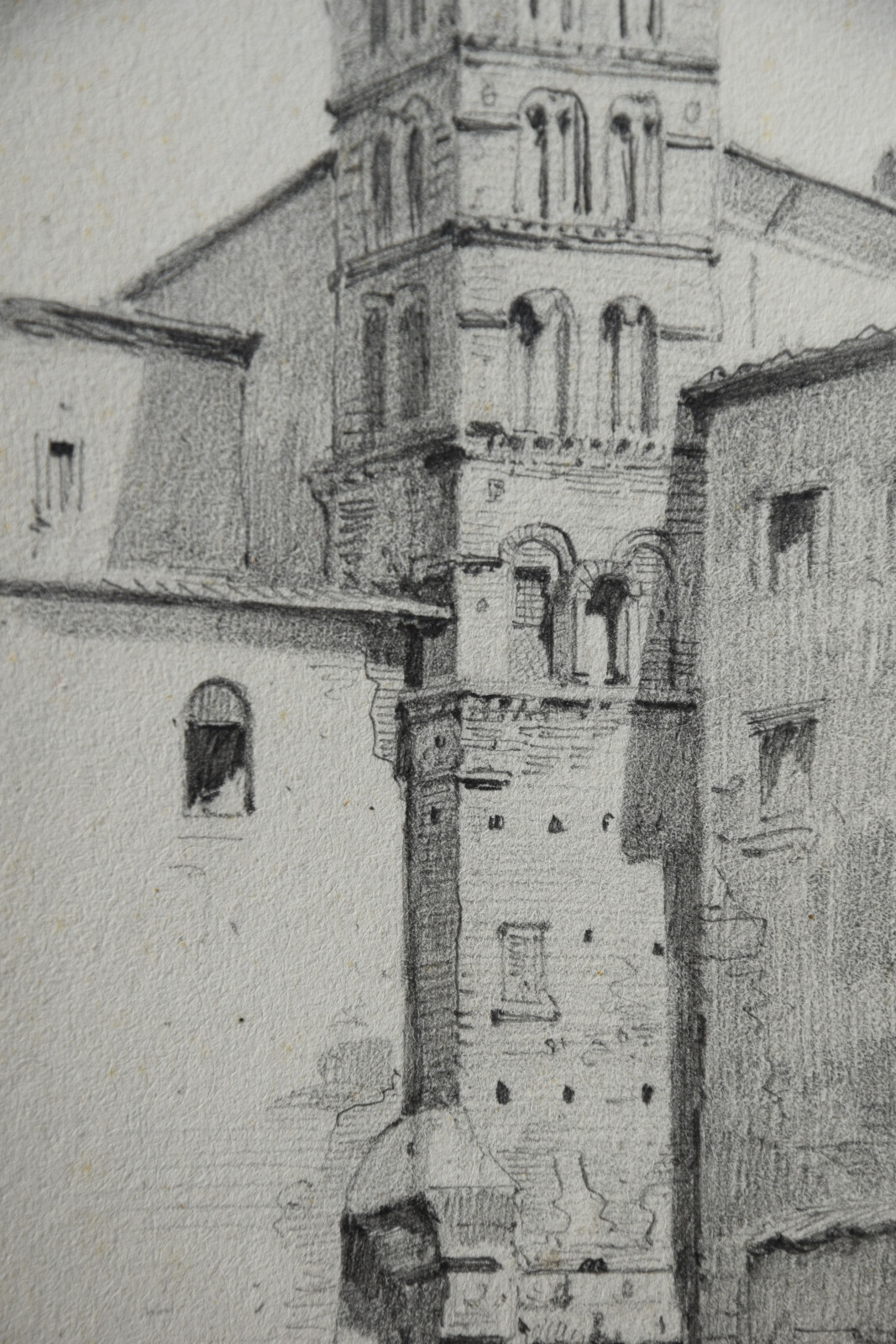 Diese hier vorliegende Bleistiftzeichnung datiert taggenau auf den 2. April 1874 und zeigt einen detaillierten Blick auf den Kampanile der bedeutenden Basilika Santi Giovanni e Paolo in Rom, eine der ältesten christlichen Stätten.