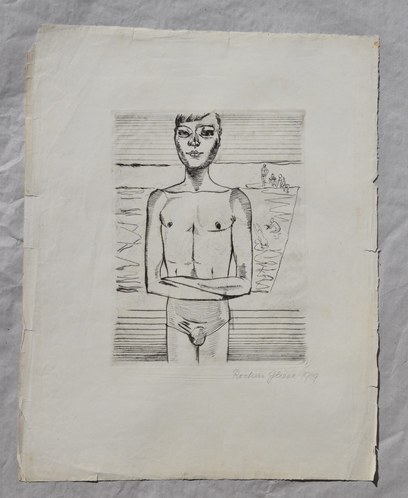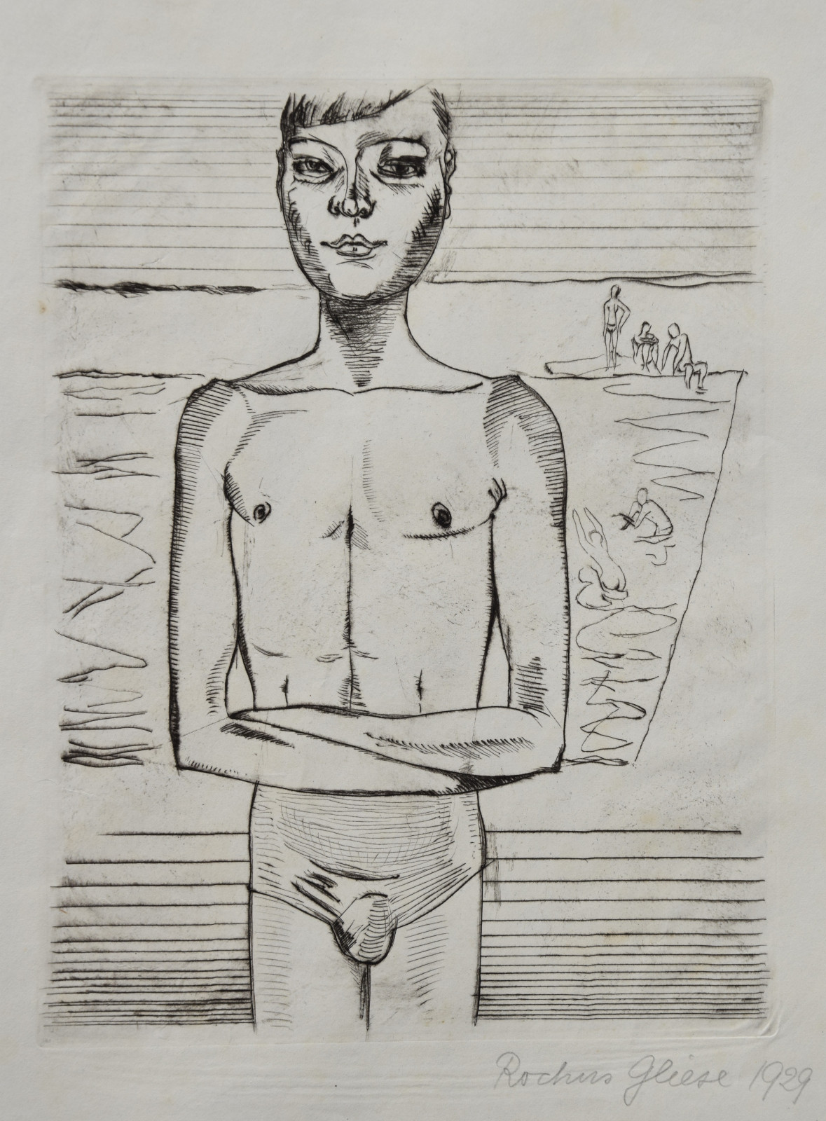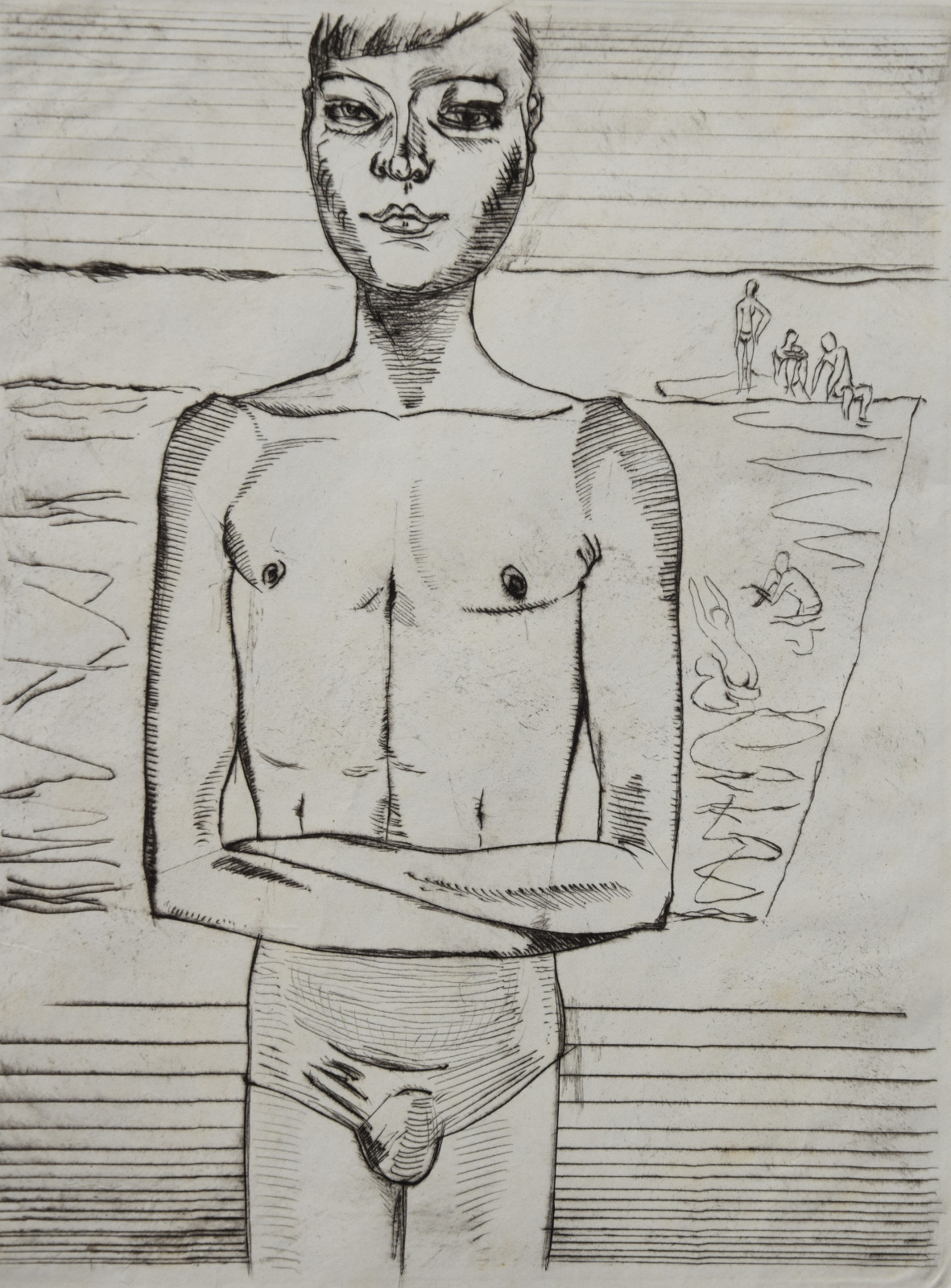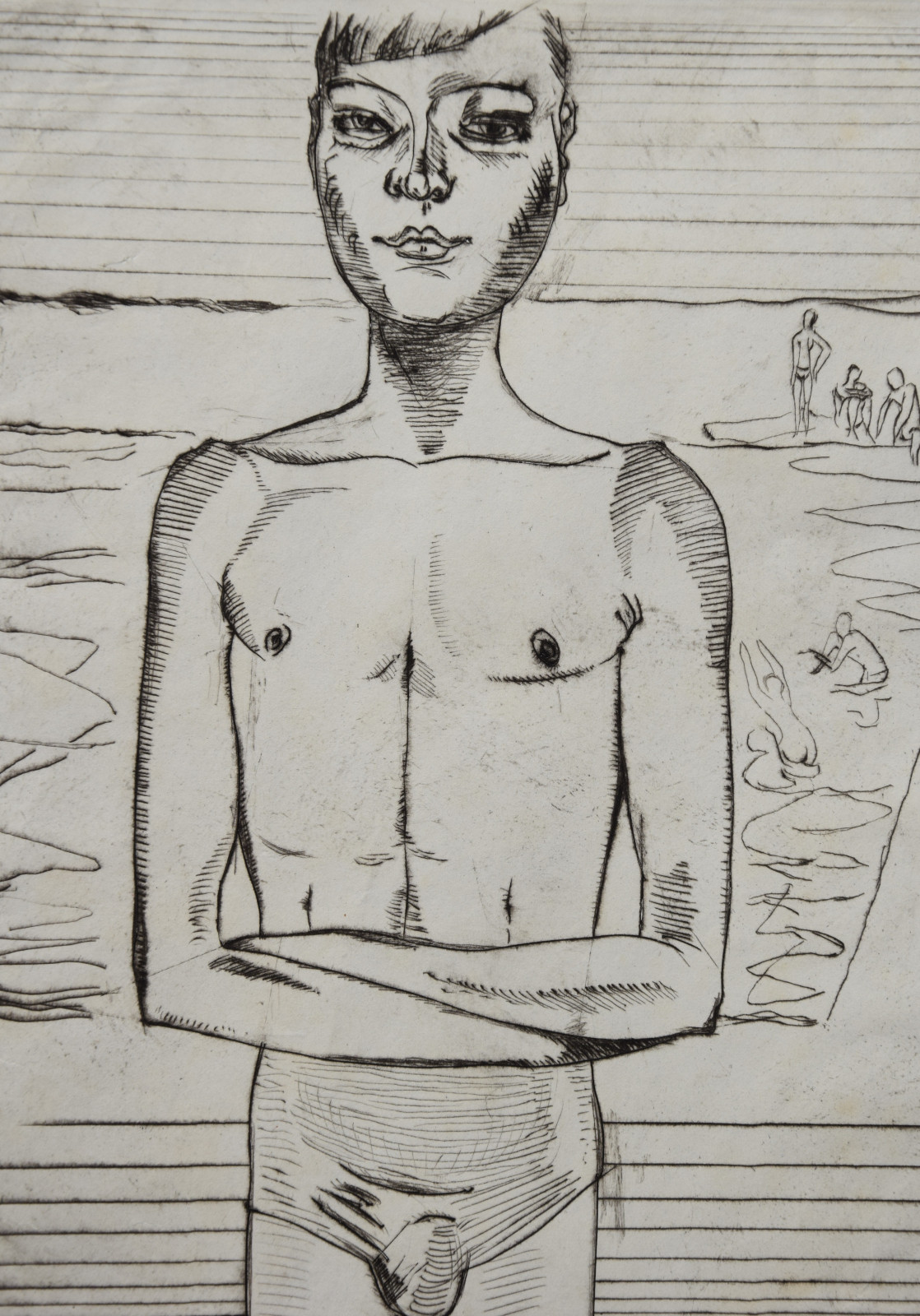 Neben der deutlich von der Neuen Sachlichkeit beeinflussten Ausführung, ist auch beachtenswert, dass der Jüngling in seiner knappen, engen Badehose auch mehr als nur subtil eine gewisse homoerotische Konnotation vermittelt, so dass dieses Werk vor dem Hintergrund des obigen Zitats auch eine biografisch interessante Relevanz erfährt.