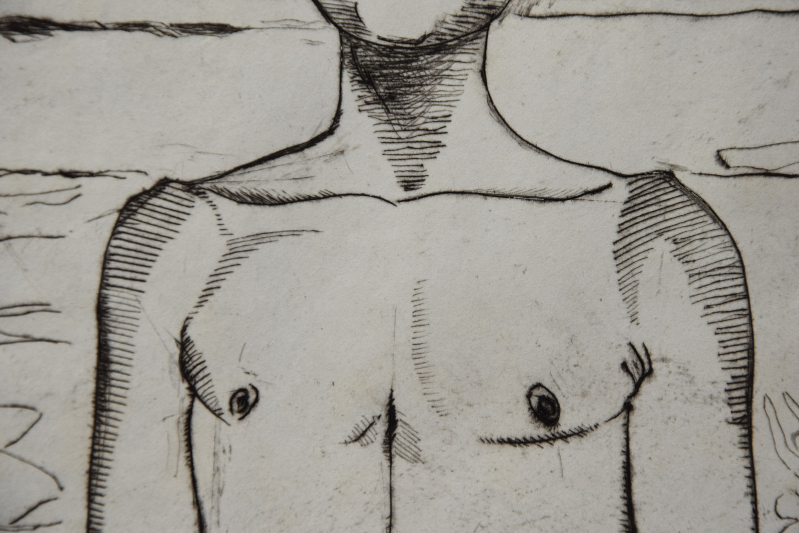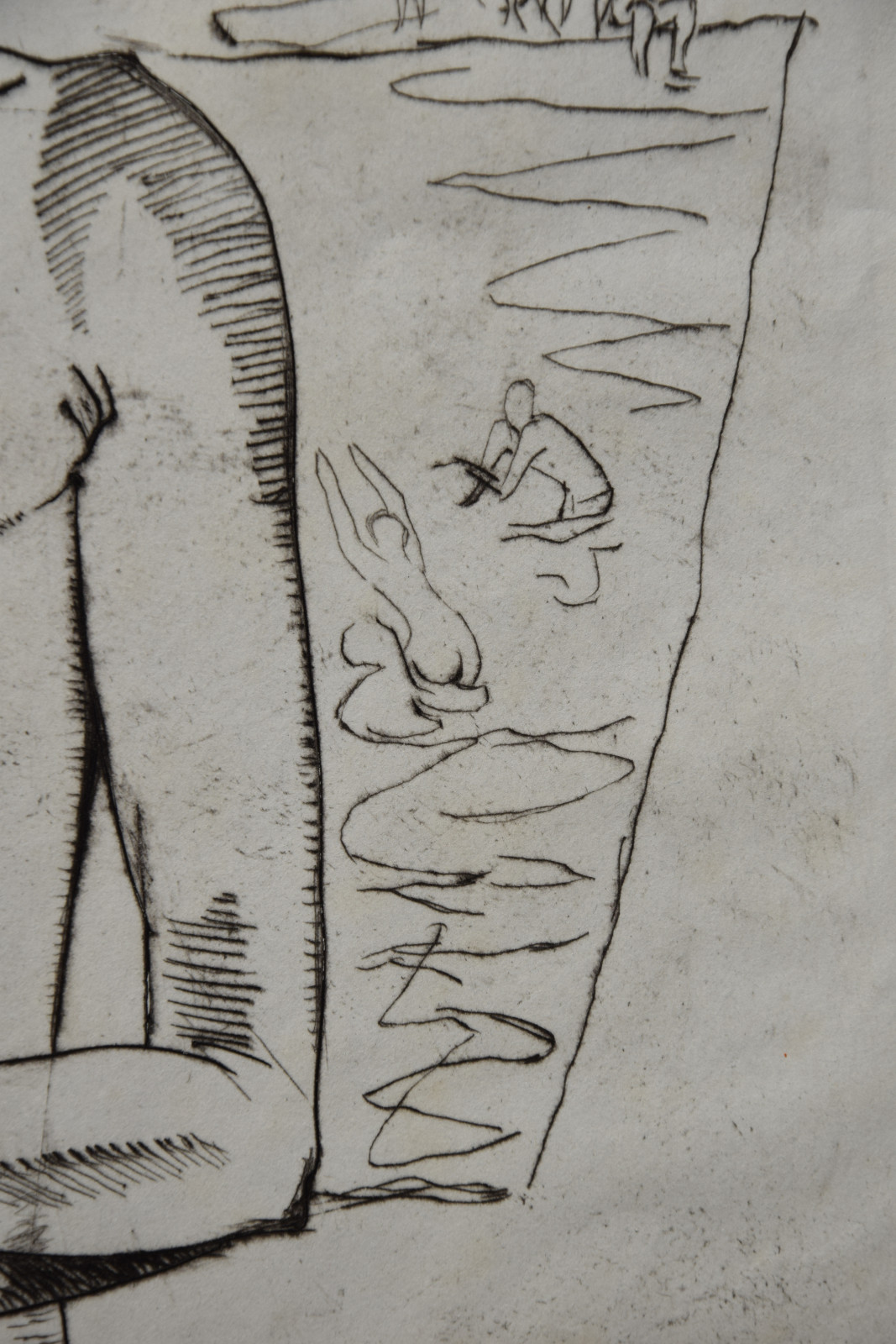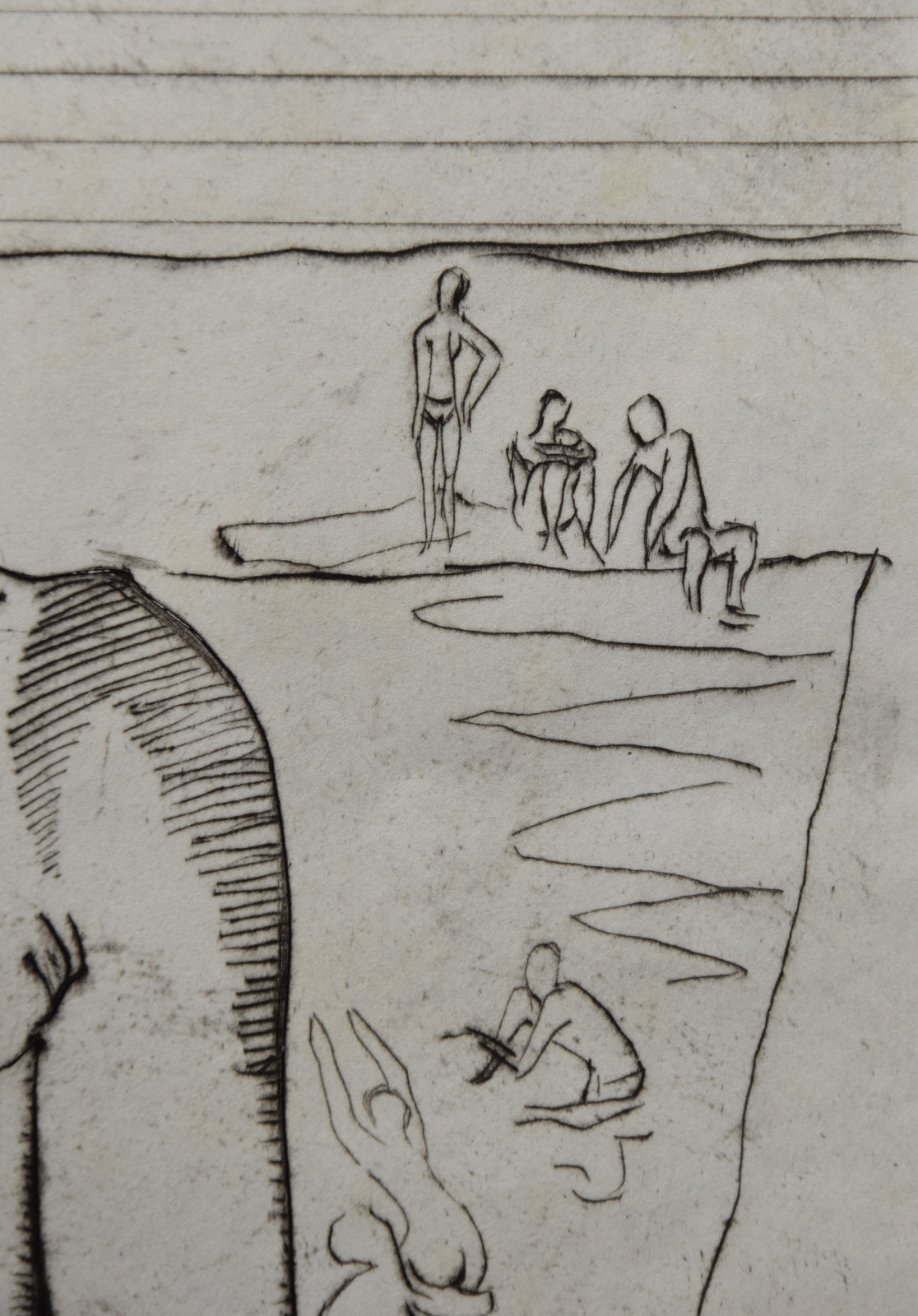 Diese Radierung aus dem Jahr 1929 ist eine der ganz wenigen, voll ausgeführten künstlerischen Kompositionen von Rochus Gliese, welche nicht in einem dezidierten Theater- bzw. Filmkontext steht. Die wenigen bekannten Zeichnungen oder Grafiken Glieses entstanden zumeist als Studien für Kostüme oder Bühnenbilder, was bei dieser Schwimmbad-Szene aber nicht der Fall ist.