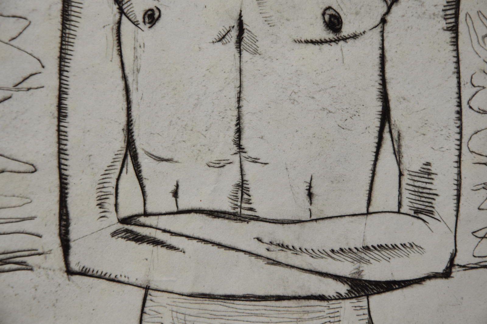 Der zentral ins Motiv gesetzte, das Blatt am oberen und unteren Rand überragende Jüngling steht dem Betrachter selbstbewusst gegenüber. Die Arme sind vor der Brust verschränkt, den Blick umspielt ein leichtes Lächeln. Im Hintergrund zeigen sich weitere Badende am Rand des Beckens.