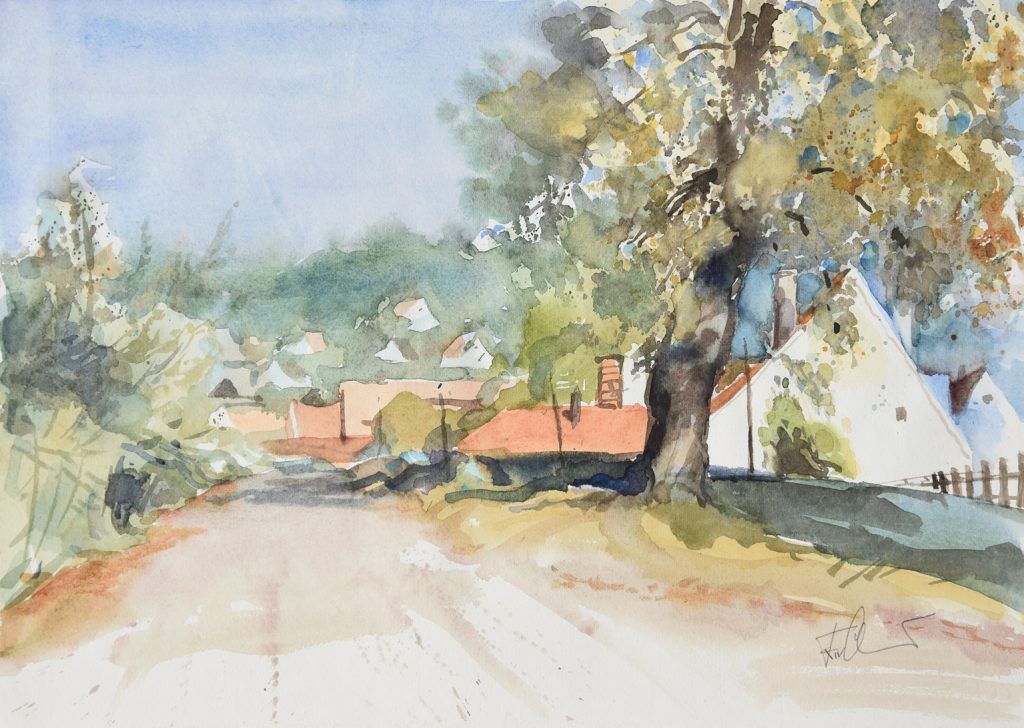 Fritz Schuber nimmt hier den Betrachter mit auf einen Weg mit Blickrichtung zum Dorf. Rechts erhebt sich ein hoher Baum, der den Weg in leichten Schatten legt. Ein zauberhaft lockeres, einfühlsames, ja: harmonisches Werk, das beispielhaft verdeutlicht, weshalb der Künstler als „Aquarellist des Lichts“ bezeichnet wird.