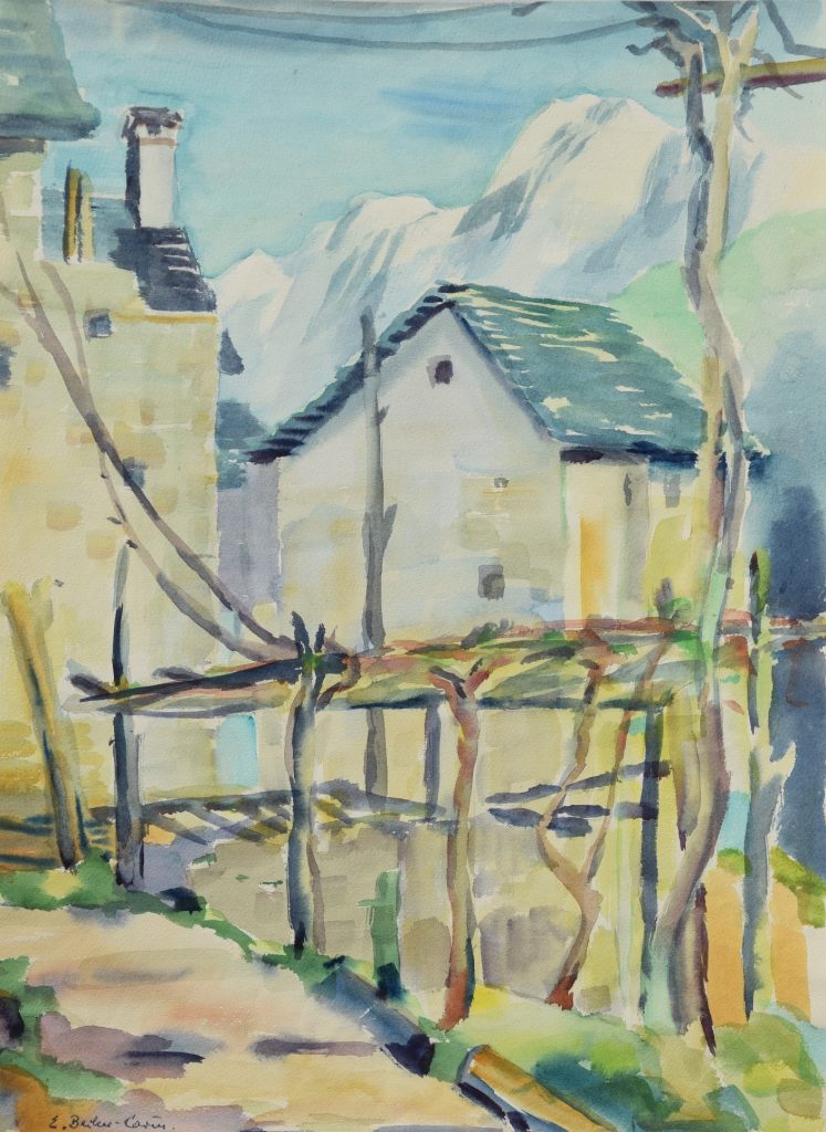 Diese schöne, ruhige Ansicht auf einen Weingarten in Camedo, ein Ortsteil von Centovalli im Tessin, sah Becker-Carus im April 1960 vor sich. Ganz unspektakulär, aber überaus stimmig und harmonisch blicken wir auf diesen zeitlosen Momenteinfang.