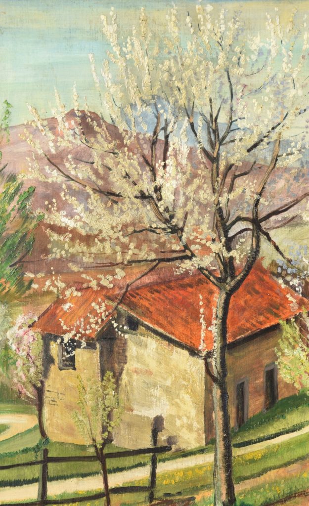 Das kleine Dorf Albonago liegt an den Hängen des Monte Brè (östlich von Lugano). Der leicht aus der Mitte nach rechts gerückte Kirschbaum reicht mit seinen Zweigen bis an die Bildränder – seine Blüten heben sich dabei die pastose Malweise markant ab. Hinter dem Baum sehen wir einen Hang, ein Gebäude und schließlich das Gebirge.