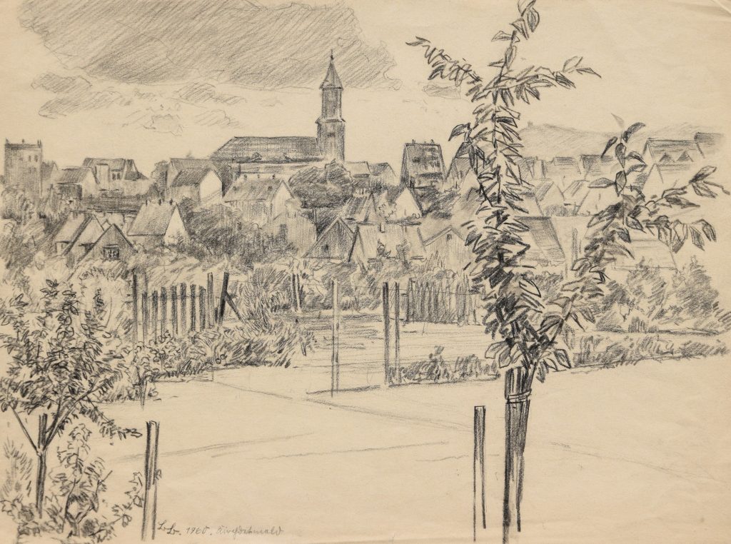 1960 zeichnete Bernhard Bröker diese schlicht schöne, (früh)sommerliche Ansicht auf den Kasseler Stadtteil Kirchditmold.